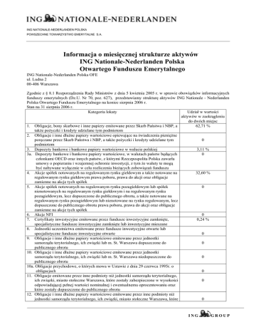 ING NATIONALE-NEDERLANDEN POLSKA POWSZECHNE TOWARZYSTWO EMERYTALNE S.A. Informacja o miesięcznej strukturze aktywów ING Nationale-Nederlanden Polska Otwartego Funduszu Emerytalnego ING Nationale-Nederlanden Polska OFE ul. Ludna 2 00-406 Warszawa Zgodnie z § 8.1 Rozporządzenia Rady Ministrów z dnia 5 kwietnia 2005 r. w sprawie obowiązków informacyjnych funduszy emerytalnych (Dz.U. Nr 70, poz. 627), przedstawiamy strukturę aktywów ING Nationale - Nederlanden Polska Otwartego Funduszu Emerytalnego na koniec sierpnia 2006 r. Stan na 31 sierpnia 2006 r. Kategoria lokaty Udział w wartości aktywów w zaokrągleniu do dwóch miejsc 1. Obligacje, bony skarbowe i inne papiery emitowane przez Skarb Państwa i NBP, a 62,71 % także pożyczki i kredyty udzielane tym podmiotom 2. Obligacje i inne dłużne papiery wartościowe opiewające na świadczenia pieniężne poręczane przez Skarb Państwa i NBP, a także pożyczki i kredyty udzielane tym 0 podmiotom 3. Depozyty bankowe i bankowe papiery wartościowe w walucie polskiej 3,11 % 3a. Depozyty bankowe i bankowe papiery wartościowe, w walutach państw będących 0 członkami OECD oraz innych państw, z którymi Rzeczpospolita Polska zawarła umowy o popieraniu i wzajemnej ochronie inwestycji, z tym że waluty te mogą być nabywane wyłącznie w celu rozliczenia bieżących zobowiązań funduszu 4. Akcje spółek notowanych na regulowanym rynku giełdowym a także notowane na 32,60 % regulowanym rynku giełdowym prawa poboru, prawa do akcji oraz obligacje zamienne na akcje tych spółek 5. Akcje spółek notowanych na regulowanym rynku pozagiełdowym lub spółek 0 nienotowanych na regulowanym rynku giełdowym i na regulowanym rynku pozagiełdowym, lecz dopuszczone do publicznego obrotu, a także notowane na regulowanym rynku pozagiełdowym lub nienotowane na rynku regulowanym, lecz dopuszczone do publicznego obrotu prawa poboru, prawa do akcji oraz obligacje zamienne na akcje tych spółek 6. Akcje NFI 0 7. Certyfikaty inwestycyjne emitowane przez fundusze inwestycyjne zamknięte, 0,24 % specjalistyczne fundusze inwestycyjne zamknięte lub inwestycyjne mieszane 8. Jednostki uczestnictwa emitowane przez fundusze inwestycyjne otwarte lub specjalistyczne fundusze inwestycyjne otwarte 0 9. Obligacje i inne dłużne papiery wartościowe emitowane przez jednostki samorządu terytorialnego, ich związki lub m. St. Warszawa dopuszczone do 0 publicznego obrotu 10. Obligacje i inne dłużne papiery wartościowe emitowane przez jednostki samorządu terytorialnego, ich związki lub m. St. Warszawa niedopuszczone do 0 publicznego obrotu 10a. Obligacje przychodowe, o których mowa w Ustawie z dnia 29 czerwca 1995r. o obligacjach 0 11. Obligacje emitowane przez inne podmioty niż jednostki samorządu terytorialnego, ich związki, miasto stołeczne Warszawa, które zostały zabezpieczone w wysokości 0 odpowiadającej pełnej wartości nominalnej i ewentualnemu oprocentowaniu oraz które zostały dopuszczone do publicznego obrotu 12. Obligacje i inne dłużne papiery wartościowe emitowane przez inne podmioty niż jednostki samorządu terytorialnego, ich związki, miasto stołeczne Warszawa, które 0 ING GROUP ING NATIONALE-NEDERLANDEN POLSKA POWSZECHNE TOWARZYSTWO EMERYTALNE S.A. zostały zabezpieczone w wysokości odpowiadającej wartości nominalnej wraz z ewentualnym oprocentowaniem i które nie zostały dopuszczone do publicznego obrotu 13. Obligacje i inne dłużne papiery wartościowe emitowane przez spółki publiczne inne niż papiery o których mowa w punktach 11 i 12 13a. Obligacje i inne dłużne papiery wartościowe dopuszczone do publicznego obrotu, inne niż w pkt. 9 i 11 13b. Listy zastawne 13c. Kwity depozytowe, w rozumieniu Prawa o publicznym obrocie papierami wartościowymi, dopuszczone do publicznego obrotu na rynku regulowanym na terytorium Rzeczypospolitej Polskiej 14. Środki pieniężne 15. Należności 0 0 0 0 1,13 % 0,21 % ING GROUP
