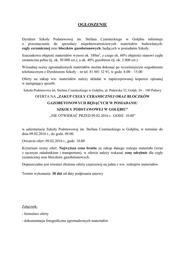 OGŁOSZENIE Dyrektor Szkoły Podstawowej im. Stefana Czarnieckiego w Gołębiu informuje o przeznaczeniu do sprzedaży niepełnowartościowych materiałów budowlanych: cegły ceramicznej oraz bloczków gazobetonowych, będących w posiadaniu Szkoły. Szacunkowa objętość materiałów wynosi ok. 180m3, z czego ok. 60% objętości stanowi cegła ceramiczna pełna (tj. ok. 50 000 szt.), a ok. 40% gazobeton (tj. ok. 2 000 szt.). Wizualnej oceny zgromadzonych materiałów można dokonać po wcześniejszym uzgodnieniu telefonicznym z Dyrektorem Szkoły – nr tel. 81 881 32 91, w godz. 8.00 – 15.00 Oferty na zakup ww. materiałów należy składać w zapieczętowanej kopercie opisanej w następujący sposób: Szkoła Podstawowa im. Stefana Czarnieckiego w Gołębiu, ul. Puławska 32, Gołąb, 24 – 100 Puławy OFERTA NA „ZAKUP CEGŁY CERAMICZNEJ ORAZ BLOCZKÓW GAZOBETONOWYCH BĘDĄCYCH W POSIADANIU SZKOŁY PODSTAWOWEJ W GOŁĘBIU” „NIE OTWIERAĆ PRZED 09.02.2016 r. GODZ. 10.00” w sekretariacie Szkoły Podstawowej im. Stefana Czarnieckiego w Gołębiu, w terminie do dnia 09.02.2016 r., do godz. 09.00. Otwarcie ofert: 09.02.2016 r., godz. 10.00 Kryterium oceny ofert: Najwyższa cena brutto za zakup danego rodzaju materiału (wraz z ręcznym załadunkiem i transportem), w ofercie należy wskazać cenę odrębnie dla cegły ceramicznej oraz bloczków gazobetonowych. Dopuszczalne jest również złożenie oferty częściowej na jeden z ww. rodzajów materiałów. Termin wykonania: 30 dni od daty podpisania umowy Załącznik: - formularz oferty - dokumentacja fotograficzna zgromadzonych materiałów