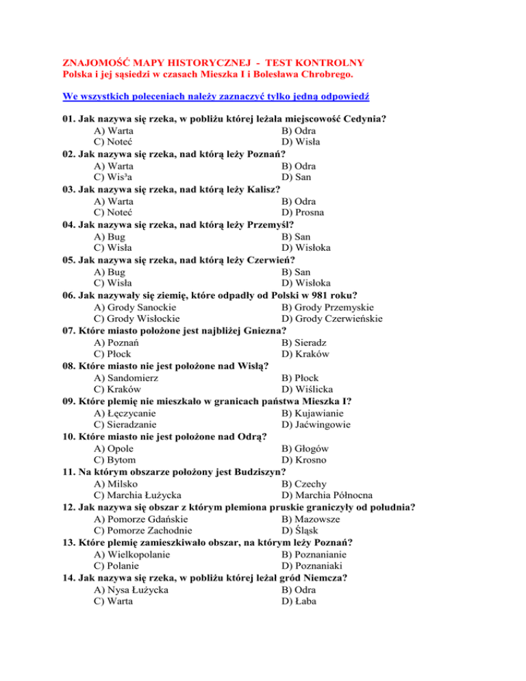 ZNAJOMOŚĆ MAPY HISTORYCZNEJ - TEST KONTROLNY Polska i jej sąsiedzi w czasach Mieszka I i Bolesława Chrobrego. We wszystkich poleceniach naleŜy zaznaczyć tylko jedną odpowiedź 01. Jak nazywa się rzeka, w pobliŜu której leŜała miejscowość Cedynia? A) Warta B) Odra C) Noteć D) Wisła 02. Jak nazywa się rzeka, nad którą leŜy Poznań? A) Warta B) Odra C) Wis³a D) San 03. Jak nazywa się rzeka, nad którą leŜy Kalisz? A) Warta B) Odra C) Noteć D) Prosna 04. Jak nazywa się rzeka, nad którą leŜy Przemyśl? A) Bug B) San C) Wisła D) Wisłoka 05. Jak nazywa się rzeka, nad którą leŜy Czerwień? A) Bug B) San C) Wisła D) Wisłoka 06. Jak nazywały się ziemię, które odpadły od Polski w 981 roku? A) Grody Sanockie B) Grody Przemyskie C) Grody Wisłockie D) Grody Czerwieńskie 07. Które miasto połoŜone jest najbliŜej Gniezna? A) Poznań B) Sieradz C) Płock D) Kraków 08. Które miasto nie jest połoŜone nad Wisłą? A) Sandomierz B) Płock C) Kraków D) Wiślicka 09. Które plemię nie mieszkało w granicach państwa Mieszka I? A) Łęczycanie B) Kujawianie C) Sieradzanie D) Jaćwingowie 10. Które miasto nie jest połoŜone nad Odrą? A) Opole B) Głogów C) Bytom D) Krosno 11. Na którym obszarze połoŜony jest Budziszyn? A) Milsko B) Czechy C) Marchia ŁuŜycka D) Marchia Północna 12. Jak nazywa się obszar z którym plemiona pruskie graniczyły od południa? A) Pomorze Gdańskie B) Mazowsze C) Pomorze Zachodnie D) Śląsk 13. Które plemię zamieszkiwało obszar, na którym leŜy Poznań? A) Wielkopolanie B) Poznanianie C) Polanie D) Poznaniaki 14. Jak nazywa się rzeka, w pobliŜu której leŜał gród Niemcza? A) Nysa ŁuŜycka B) Odra C) Warta D) Łaba 15. Jak nazywa się rzeka, nad którą leŜy Magdeburg? A) Łaba B) Ren C) Nysa ŁuŜycka D) Dunaj 16. Jak nazywa się państwo, w którym rozpoczyna bieg rzeka Łaba? A) Czechy B) Morawy C) Słowacja D) Ruś 17. Który gród nie leŜał na terenie Grodów Czerwieńskich? A) Przemyśl B) Czerwień C) Bełz D) Grodno 18. Która rzeka nie przepływa przez Grody Czerwieńskie? A) Bug B) San C) Wisła D) Wisłok 19. Które plemię mieszkało na wschód od Grodów Czerwieńskich? A) Mazowszanie B) Wiślanie C) BuŜanie D) Lędzianie 20. Które plemię mieszkało na zachód od Grodów Czerwieńskich? A) Wołynianie B) Jaćwingowie C) Wiślanie D) Prusowie 21. Które plemię nie mieszkało w granicach państwa Mieszka I? A) Lubuszanie B) Dziadoszanie C) Obodrzyce D) Bobrzanie 22. Które plemię mieszkało w pobliŜu grodu Włodzimierz? A) Wołynianie B) BuŜanie C) Jaćwingowie D) Prusowie 23. Jak nazywa się rzeka, nad którą leŜy Szczecin? A) Warta B) Odra C) Noteć D) Wisła 24. Jak nazywa się rzeka, nad którą leŜy Sieradz? A) Warta B) Odra C) Noteæ D) San 25. Jak nazywa się rzeka, nad którą leŜy Brześć? A) Bug B) San C) Niemen D) Wis³a 26. W której części Polski mieszkało plemię Wolinianie? A) Północno-wschodniej B) Północno-zachodniej C) Południowo-wschodniej D) Południowo-zachodniej 27. Jak nazywa się rzeka, nad którą leŜy Kołobrzeg? A) Prośnica B) Odra C) Wisła D) Łaba 28. Które plemię zamieszkiwało w miejscu, w którym rozpoczyna bieg rzeka Prypeć? A) Prypecianie B) Prycianie C) BuŜanie D) Wołynianie 29. Który czeski gród leŜał najbliŜej Pragi? A) Kłodzko B) Litomyśl C) Gniewin D) Drzewicz 30. Jak nazywa się obszar, na którym leŜy Brno? A) Morawy B) Słowacja C) Czechy D) Łuzyce