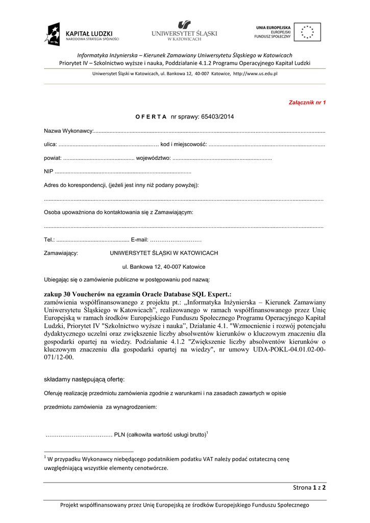 Informatyka Inżynierska – Kierunek Zamawiany Uniwersytetu Śląskiego w Katowicach Priorytet IV – Szkolnictwo wyższe i nauka, Poddziałanie 4.1.2 Programu Operacyjnego Kapitał Ludzki Uniwersytet Śląski w Katowicach, ul. Bankowa 12, 40-007 Katowice, http://www.us.edu.pl Załącznik nr 1 O F E R T A nr sprawy: 65403/2014 Nazwa Wykonawcy:..................................................................................................................................................... ulica: ............................................................…. kod i miejscowość: ........................................................................... powiat: .............................................. województwo: ................................................................ NIP ........................................................................................ Adres do korespondencji, (jeżeli jest inny niż podany powyżej): .................................................................................................................................................................................... Osoba upoważniona do kontaktowania się z Zamawiającym: .................................................................................................................................................................................... Tel.: ............................................... E-mail: …………….………… Zamawiający: UNIWERSYTET ŚLĄSKI W KATOWICACH ul. Bankowa 12, 40-007 Katowice Ubiegając się o zamówienie publiczne w postępowaniu pod nazwą: zakup 30 Voucherów na egzamin Oracle Database SQL Expert.: zamówienia współfinansowanego z projektu pt.: „Informatyka Inżynierska – Kierunek Zamawiany Uniwersytetu Śląskiego w Katowicach”, realizowanego w ramach współfinansowanego przez Unię Europejską w ramach środków Europejskiego Funduszu Społecznego Programu Operacyjnego Kapitał Ludzki, Priorytet IV "Szkolnictwo wyższe i nauka”, Działanie 4.1. "Wzmocnienie i rozwój potencjału dydaktycznego uczelni oraz zwiększenie liczby absolwentów kierunków o kluczowym znaczeniu dla gospodarki opartej na wiedzy. Podziałanie 4.1.2 "Zwiększenie liczby absolwentów kierunków o kluczowym znaczeniu dla gospodarki opartej na wiedzy", nr umowy UDA-POKL-04.01.02-00071/12-00. składamy następującą ofertę: Oferuję realizację przedmiotu zamówienia zgodnie z warunkami i na zasadach zawartych w opisie przedmiotu zamówienia za wynagrodzeniem: ……………………………… PLN (całkowita wartość usługi brutto) 1 1 W przypadku Wykonawcy niebędącego podatnikiem podatku VAT należy podać ostateczną cenę uwzględniającą wszystkie elementy cenotwórcze. Strona 1 z 2 Projekt współfinansowany przez Unię Europejską ze środków Europejskiego Funduszu Społecznego Słownie: ...................................................................................................................................................................... ści ……………% albo 2 Wyżej podana cena jest ceną łączną, zgodnie z art. 3 ust 1 pkt 1 ustawy z dnia 5 lipca 2001r. ocenach (Dz. U. z 11 września 2001 r. Nr 97, poz. 1050), tzn. jest to wartość wyrażona w jednostkach pieniężnych, którą kupujący jest obowiązany zapłacić przedsiębiorcy za towar lub usługę; w cenie uwzględnia się podatek od towarów i usług oraz podatek akcyzowy. 1. Rodzaj dokumentu, na podstawie którego zostanie zrealizowana płatność: rachunek / faktura * * (niepotrzebne skreślić). 2. Oświadczam, iż cena podana w ofercie jest sumą kwot wszystkich elementów składających się na przedmiot zamówienia, w szczególności zawiera: koszt usługi, a także wszelkie elementy ryzyka związane z realizacją przedmiotowego zamówienia. Cena obejmuje również wszelkie podatki i inne należności płatne przez Wykonawcę. 3. Zobowiązuję się do realizacji przedmiotu zamówienia w terminach określonych w opisie przedmiotu zamówienia. 4. Akceptuję warunki płatności podane w ogłoszeniu. 5. Oświadczam, iż zapoznałem się z opisem przedmiotu zamówienia, w pełni akceptuję jego treść, nie wnoszę do niego zastrzeżeń oraz zdobyłem konieczne informacje do przygotowania oferty i zobowiązuję się spełnić wszystkie wymagania Zamawiającego wymienione w opisie. data i czytelny podpis lub podpis na pieczęci imiennej osoby upoważnionej do składania oświadczeń w imieniu Wykonawcy 2 Zaznaczyć właściwe. Strona 2 z 2 Projekt współfinansowany przez Unię Europejską ze środków Europejskiego Funduszu Społecznego
