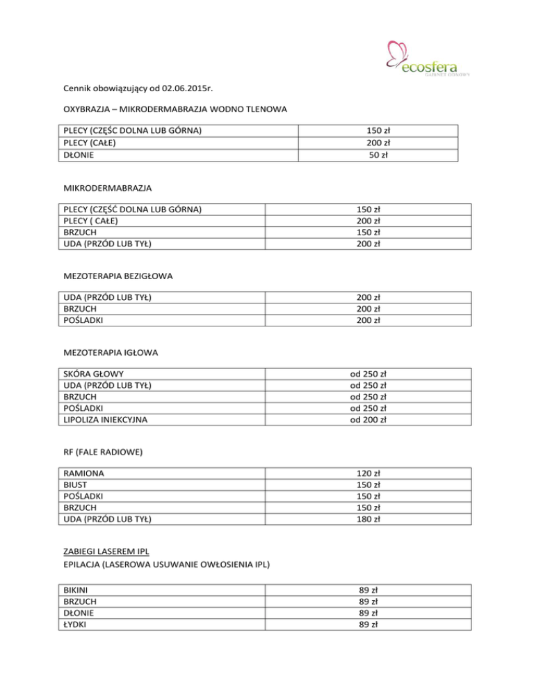 Cennik obowiązujący od 02.06.2015r. OXYBRAZJA – MIKRODERMABRAZJA WODNO TLENOWA PLECY (CZĘŚC DOLNA LUB GÓRNA) PLECY (CAŁE) DŁONIE 150 zł 200 zł 50 zł MIKRODERMABRAZJA PLECY (CZĘŚĆ DOLNA LUB GÓRNA) PLECY ( CAŁE) BRZUCH UDA (PRZÓD LUB TYŁ) 150 zł 200 zł 150 zł 200 zł MEZOTERAPIA BEZIGŁOWA UDA (PRZÓD LUB TYŁ) BRZUCH POŚLADKI 200 zł 200 zł 200 zł MEZOTERAPIA IGŁOWA SKÓRA GŁOWY UDA (PRZÓD LUB TYŁ) BRZUCH POŚLADKI LIPOLIZA INIEKCYJNA od 250 zł od 250 zł od 250 zł od 250 zł od 200 zł RF (FALE RADIOWE) RAMIONA BIUST POŚLADKI BRZUCH UDA (PRZÓD LUB TYŁ) 120 zł 150 zł 150 zł 150 zł 180 zł ZABIEGI LASEREM IPL EPILACJA (LASEROWA USUWANIE OWŁOSIENIA IPL) BIKINI BRZUCH DŁONIE ŁYDKI 89 zł 89 zł 89 zł 89 zł ODCINEK LĘDŹWIOWY PACHY PLECY POŚLADKI RĘCE SZYJA + KARK TORS TWARZ (CAŁA) UDA 89 zł 89 zł 89 zł 89 zł 89 zł 89 zł 89 zł 89 zł 89 zł ENDERMOLOGIA / ENDERMOMASAŻ 1 ZABIEG CAŁOŚCIOWY (60 min) 1 ZABIEG CZĘŚCIOWY (45 min) KOMBINEZON ZABIEGOWY 10 x ZABIEG CAŁOŚCIOWY 10 x ZABIEG CZĘŚCIOWY 15 x ZABIEG CAŁOŚCIOWY 15 x ZABIEG CZĘŚCIOWY 20 x ZABIEG CAŁOŚCIOWY 20 x ZABIEG CZĘŚCIOWY 110 zł 100 zł 90 zł 900 zł + kombinezon zabiegowy gratis 800 zł + kombinezon zabiegowy gratis 1 300 zł + kombinezon zabiegowy gratis 1 150 zł + kombinezon zabiegowy gratis 1 700 zł + kombinezon zabiegowy gratis 1 500 zł + kombinezon zabiegowy gratis BEZINWAZYJNE USUWANIE ZMIAN SKÓRNYCH (RADIOTERMOLIZA) URZĄDZENIEM LAMPROBE KONSULTACJA PRZED ZABIEGIEM USUNIĘCIE POJEDYNCZEJ ZMIANY SKÓRNEJ (do 10 min) USUNIĘCIE KILKU ZMIAN JEDNEGO RODZAJU PRZY JEDNYM ZABIEGU (np. kilka włókniaków) USUNIĘCIE KILKU ZMIAN RÓŻNEGO RODZAJU PRZY JEDNYM ZABIEGU (np. włókniaki, naczynka, prosaki) Bezinwazyjna mikrochirurgia, unikalne urządzenie, bezpieczne zabiegi zamykania naczynek krwionośnych, usuwania włókniaków, plam de Morgana i wielu innych nieprawidłowości skórnych. Bez wkłuwania igły!!! Zmiany skórne usuwane za pomocą LAMPROBE: - naczynka krwionośne, małe teleangiektazje (tzw. pajączki), naczyniak gwiaździsty (tzw. Spider Naevi) w okolicy twarzy, szyi i dekoltu - naczyniak wiśniowy (plamki Campbell de Morgana) - włókniaki - brodawki - prosaki - kaszaki - żółtaki (Xanthelasma) - ropne krostki trądzikowe - przerost gruczołu łojowego - zablokowane pory skóry bezpłatnie od 120 zł od 150 zł od 200 zł ZNIECZULENIE DO ZABIEGU od 30 zł ZABIEGI NA CIAŁO PEELING KAWOWO-MIODOWY PEELING NATURALNY Z RPA SPEŁNIONA OBIETNICA – ZABIEG UJĘDRNIAJĄCO - NAWILŻAJACY O CUDOWNYM AROMACIE ŚWIEŻYCH TRUSKAWEK dla spragnionych lata i aksamitnej skóry. 100 zł 100 zł 120 zł MEZOTERAPIA BEZIGŁOWA (działanie antycellulitowe, ujędrniające, nawilżające, odchudzające) na wybraną partię ciała od 200 zł MEZOTERAPIA IGŁOWA (działanie antycellulitowe, ujędrniające, nawilżające) na wybraną partię ciała od 200 zł LIPOLIZA INIEKCYJNA (działanie odchudzające, miejscowa likwidacja złogów tłuszczowych) MAXI PAKIET - ZABIEGÓW ANTYCELLULITOWYCH I ODCHUDZAJĄCYCH (10 x endermomasaż + 10 x mezoterapia bezigłowa ( na wybraną partię ciała) + 10 x bańka chińska) MINI PAKIET - ZABIEGÓW ANTYCELLULITOWYCH I ODCHUDZAJĄCYCH (5 x endermomasaż + 5 x mezoterapia bezigłowa ( na wybraną partię ciała) + 5 x bańka chińska) MAXI PLUS - PAKIET ZABIEGÓW ANTYCELLULITOWYCH, ODCHUDZAJĄCYCH I UJĘDRNIAJĄCYCH (10 x endermomasaż + 10 x mezoterapia bezigłowa ( na wybraną partię ciała) + 10 x bańka chińska + 10 x fale radiowe RF) MINI PLUS - PAKIET ZABIEGÓW ANTYCELLULITOWYCH, ODCHUDZAJĄCYCH I UJĘDRNIAJĄCYCH (5 x endermomasaż + 5 x mezoterapia bezigłowa ( na wybraną partię ciała) + 5 x bańka chińska + 5 x fale radiowe RF) TERAPIA ŁĄCZONA NA ROZSTĘPY (5 x mikrodermabrazja + 5 x mezoterapia bezigłowa + 5 x kwas glikolowy) 250 zł ( za 1 ampułkę preparatu) 2400 zł + kombinezon do endermologii gratis 1250 zł + kombinezon do endermologii gratis 3400 zł + kombinezon do endermologii gratis 1850 zł + kombinezon do endermologii gratis 2150 zł MASAŻE DRENAŻ LIMFATYCZNY NÓG (30 min) MASAŻ ANTYCELLULITOWY (45 min) MASAŻ AROMATERAPEUTYCZNY (45 min) MASAŻ BAŃKĄ CHIŃSKĄ (30 min) MASAŻ KLASYCZNY (60 min) MASAŻ KLASYCZNY (60 min) MASAŻ LOMI - LOMI NUI (90 min) MASAŻ RELAKSACYJNY (60 min) MASAŻ RELAKSACYJNY (30 min) MASAŻ PAŁECZKAMI BAMBUSOWYMI (60 min) MASAŻ ŚWIECĄ (60 min) 50 zł 60 zł 90 zł 50 zł 80 zł 45 zł 150 zł 75 zł 40 zł 120 zł 120 zł