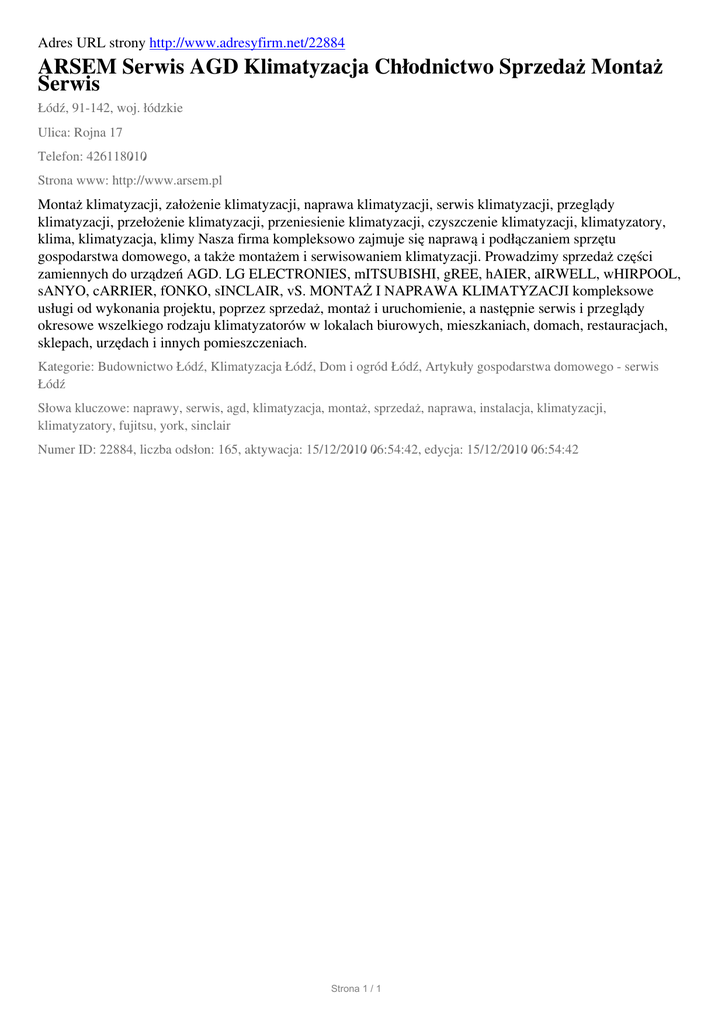 Adres URL strony http://www.adresyfirm.net/22884 ARSEM Serwis AGD Klimatyzacja Chłodnictwo Sprzedaż Montaż Serwis Łódź, 91-142, woj. łódzkie Ulica: Rojna 17 Telefon: 426118010 Strona www: http://www.arsem.pl Montaż klimatyzacji, założenie klimatyzacji, naprawa klimatyzacji, serwis klimatyzacji, przeglądy klimatyzacji, przełożenie klimatyzacji, przeniesienie klimatyzacji, czyszczenie klimatyzacji, klimatyzatory, klima, klimatyzacja, klimy Nasza firma kompleksowo zajmuje się naprawą i podłączaniem sprzętu gospodarstwa domowego, a także montażem i serwisowaniem klimatyzacji. Prowadzimy sprzedaż części zamiennych do urządzeń AGD. LG ELECTRONIES, mITSUBISHI, gREE, hAIER, aIRWELL, wHIRPOOL, sANYO, cARRIER, fONKO, sINCLAIR, vS. MONTAŻ I NAPRAWA KLIMATYZACJI kompleksowe usługi od wykonania projektu, poprzez sprzedaż, montaż i uruchomienie, a następnie serwis i przeglądy okresowe wszelkiego rodzaju klimatyzatorów w lokalach biurowych, mieszkaniach, domach, restauracjach, sklepach, urzędach i innych pomieszczeniach. Kategorie: Budownictwo Łódź, Klimatyzacja Łódź, Dom i ogród Łódź, Artykuły gospodarstwa domowego - serwis Łódź Słowa kluczowe: naprawy, serwis, agd, klimatyzacja, montaż, sprzedaż, naprawa, instalacja, klimatyzacji, klimatyzatory, fujitsu, york, sinclair Numer ID: 22884, liczba odsłon: 165, aktywacja: 15/12/2010 06:54:42, edycja: 15/12/2010 06:54:42 Strona 1 / 1