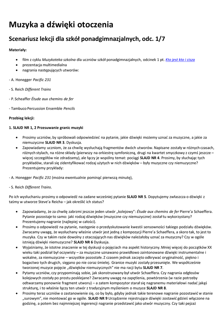 Muzyka a dźwięki otoczenia Scenariusz lekcji dla szkół ponadgimnazjalnych, odc. 1/7 Materiały: · · · film z cyklu Muzykoteka szkolna dla uczniów szkół ponadgimnazjalnych, odcinek 1 pt. Kto jest kto i cisza prezentacja multimedialna nagrania następujących utworów: - A. Honegger Pacific 231 - S. Reich Different Trains - P. Scheaffer Étude aux chemins de fer - Tambuco Percussion Ensemble Pencils Przebieg lekcji: 1. SLAJD NR 1, 2 Przesuwanie granic muzyki · · Prosimy uczniów, by spróbowali odpowiedzieć na pytanie, jakie dźwięki możemy uznać za muzyczne, a jakie za niemuzyczne SLAJD NR 3. Dyskusja. Zapowiadamy uczniom, że za chwilę wysłuchają fragmentów dwóch utworów. Napisane zostały w różnych czasach, różnych stylach, na różne składy (pierwszy na orkiestrę symfoniczną, drugi na kwartet smyczkowy z czymś jeszcze – więcej szczegółów nie zdradzamy), ale łączy je wspólny temat: pociągi SLAJD NR 4. Prosimy, by słuchając tych przykładów, starali się zidentyfikować rodzaj użytych w nich dźwięków – były muzyczne czy niemuzyczne? Prezentujemy przykłady: - A. Honegger Pacific 231 (można ewentualnie pominąć pierwszą minutę), - S. Reich Different Trains. Po ich wysłuchaniu prosimy o odpowiedź na zadane wcześniej pytanie SLAJD NR 5. Dopytujemy zwłaszcza o dźwięki z taśmy w utworze Steve’a Reicha – jak określić ich status? · · · · · Zapowiadamy, że za chwilę zabrzmi jeszcze jeden utwór „kolejowy”: Étude aux chemins de fer Pierre’a Schaeffera. Pytanie pozostaje to samo: jaki rodzaj dźwięków (muzyczne czy niemuzyczne) został tu wykorzystany? Prezentujemy nagranie (najlepiej w całości). Prosimy o odpowiedź na pytanie, następnie o przedyskutowanie kwestii sensowności takiego podziału dźwięków. Zwracamy uwagę, że wysłuchany właśnie utwór jest jedną z kompozycji Pierre’a Schaeffera, a skoro tak, to jest to muzyka. Czy w takim razie dowolny z otaczających nas dźwięków należałoby uznać za muzyczny? Czy w ogóle istnieją dźwięki niemuzyczne? SLAJD NR 6 Dyskusja. Wyjaśniamy, że istotne znaczenie w tej dyskusji o pojęciach ma aspekt historyczny. Mniej więcej do początków XX wieku taki podział był oczywisty – za muzyczne uznawano prawidłowo zaintonowane dźwięki instrumentalne i wokalne, za niemuzyczne – wszystkie pozostałe. Z czasem jednak zaczęto odkrywać oryginalność, piękno i bogactwo tych drugich, sięgano po nie coraz śmielej. Granice muzyki zostały przesunięte. We współcześnie tworzonej muzyce pojęcie „dźwięków niemuzycznych” nie ma racji bytu SLAJD NR 7. Pytamy uczniów, czy przypominają sobie, jak skonstruowany był utwór Schaeffera. Czy nagrania odgłosów kolejowych zostały po prostu posklejane? Zwracamy uwagę na zapętlenia, powtórzenia (w razie potrzeby odtwarzamy ponownie fragment utworu) – a zatem kompozytor starał się nagranemu materiałowi nadać jakąś strukturę, i to właśnie łączy ten utwór z tradycyjnym myśleniem o muzyce SLAJD NR 8. Prosimy teraz uczniów o zastanowienie się, co by było, gdyby jednak takie terenowe nagranie pozostawić w stanie „surowym”, nie montować go w ogóle. SLAJD NR 9 Urządzenie rejestrujące dźwięki zostawić gdzieś włączone na godzinę, a potem bez najmniejszej ingerencji nagranie przedstawić jako utwór muzyczny. Czy taki pejzaż · · dźwiękowy można jeszcze nazwać muzyką? Dyskusja. Wyjaśniamy, że zbliżamy się tu do kolejnej granicy pojęcia „muzyka”. Osoby zajmujące się pejzażami dźwiękowymi same określają się raczej mianem artystów dźwiękowych niż kompozytorów, a sfera ich działalności to audio art lub sound art SLAJD NR 10. Proponujemy uczniom eksperyment myślowy: czy granice muzyki można by przesunąć jeszcze dalej? Co by było, gdyby muzykę próbować tworzyć z... ciszy? SLAJD NR 11 Czy ma to sens? Dyskusja. 2. Projekcja filmu Muzykoteki 3. Cisza · · Pytamy uczniów, czy jesteśmy w stanie usłyszeć ciszę SLAJD NR 12. Odpowiedź: oczywiście nie, gdyż nawet jeśli wyeliminujemy wszystkie dźwięki otoczenia, zaczniemy słyszeć „muzykę” naszego ciała – bicie serca, burczenie w brzuchu, szum lub „dzwonienie” w uszach. Utwór 4’33’’ Cage’a nie jest więc, wbrew pozorom, utworem na ciszę – rzekoma cisza okazuje się w praktyce morzem mniej lub bardziej delikatnych dźwięków, które zwykle ignorujemy. W tym momencie to im właśnie jest dane „zagrać” i dotrzeć do naszej świadomości. Proponujemy uczniom klasowe wykonanie 4’33’’ Johna Cage’a. SLAJD NR 13 Po wykonaniu (i brawach) prosimy uczniów o podzielenie się wrażeniami. Czy łatwo było wytrzymać? Jakie dźwięki słyszeli? Czy był to utwór muzyczny czy nie? Dyskusja. 4. Komponowanie utworu z dźwięków otoczenia · · · Przypominamy uczniom o zadaniu, jakie mieli ich koledzy z filmu: z dźwięków swojego otoczenia mieli stworzyć audioportret SLAJD NR 14. Zachęcamy uczniów do wykonania podobnej pracy w domu (może to być nieobowiązkowe zadanie domowe dla chętnych lub początek dłużej trwającego projektu dla całej klasy, nieodzowny będzie wówczas dostęp do komputerów dla wszystkich uczniów), a tymczasem proponujemy zadanie skromniejsze, ale o podobnym założeniu: trzeba będzie wykorzystać dźwięki otoczenia. Te, którymi możemy operować w tej chwili. Dzielimy uczniów na grupki 4-osobowe (uczniowie z dwóch sąsiednich ławek). Każda grupa ma za zadanie wybrać kilka dźwięków uzyskanych za pomocą przedmiotów, które mamy pod ręką (podajemy przykłady: dźwięk rysowania ołówkiem po papierze, temperowania go, włączania długopisu, wydzierania kartki z zeszytu, kartkowania książki, uderzania jednym przedmiotem o drugi, pocierania itd.). Następnie z wybranych dźwięków uczniowie mają skomponować krótki utwór i go wykonać. Przypominamy o możliwości powtarzania dźwięków, zapętlania struktur, do