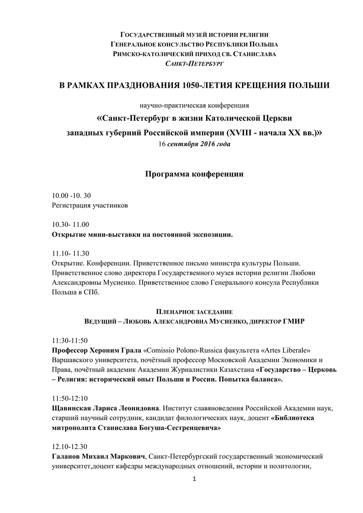 ГОСУДАРСТВЕННЫЙ МУЗЕЙ ИСТОРИИ РЕЛИГИИ ГЕНЕРАЛЬНОЕ КОНСУЛЬСТВО РЕСПУБЛИКИ ПОЛЬША РИМСКО-КАТОЛИЧЕСКИЙ ПРИХОД СВ. СТАНИСЛАВА САНКТ-ПЕТЕРБУРГ В РАМКАХ ПРАЗДНОВАНИЯ 1050-ЛЕТИЯ КРЕЩЕНИЯ ПОЛЬШИ научно-практическая конференция «Санкт-Петербург в жизни Католической Церкви западных губерний Российской империи (XVIII - начала XX вв.)» 16 сентября 2016 года Программа конференции 10.00 -10. 30 Регистрация участников 10.30- 11.00 Открытие мини-выставки на постоянной экспозиции. 11.10- 11.30 Открытие. Конференции. Приветственное письмо министра культуры Польши. Приветственное слово директора Государственного музея истории религии Любови Александровны Мусиенко. Приветственное слово Генерального консула Республики Польша в СПб. ПЛЕНАРНОЕ ЗАСЕДАНИЕ ВЕДУЩИЙ – ЛЮБОВЬ АЛЕКСАНДРОВНА МУСИЕНКО, ДИРЕКТОР ГМИР 11:30-11:50 Профессор Хероним Грала «Comissio Polono-Russica факультета «Artes Liberale» Варшавского университета, почётный профессор Московской Академии Экономики и Права, почётный академик Академии Журналистики Казахстана «Государство – Церковь – Религия: исторический опыт Польши и России. Попытка баланса». 11:50-12:10 Щавинская Лариса Леонидовна. Институт славяноведения Российской Академии наук, старший научный сотрудник, кандидат филологических наук, доцент «Библиотека митрополита Станислава Богуша-Сестренцевича» 12.10-12.30 Галанов Михаил Маркович, Санкт-Петербургский государственный экономический университет,доцент кафедры международных отношений, истории и политологии, 1 кандидат исторических наук «Основные вопросы существования Римскокатолической церкви в России в годы царствования Павла I» 12.20-12.40 Профессор Веслав Цабан, Университет Яна Кохановского в Кельцах. «Католическая община Томска во второй половине XIX и в начале XX веков. Визитация епископа Иоанна Цепляка». 12.50-13.45 КОФЕ-БРЕЙК ВТОРОЕ ЗАСЕДАНИЕ. ВЕДУЩИЙ – АННА ЛЬВОВНА КУДРИК, УЧЁНЫЙ СЕКРЕТАРЬ ГМИР 13.45-14.00 Аникин Михаил Александрович, доцент, старший научный сотрудник Отдела истории западноевропейского искусства Гос. Эрмитажа «О польской живописи в Эрмитаже» 14.00-14.15 Хасьянова Лейла Самуиловна, РАХ, член-корреспондент, профессор, кандидат исторических наук, заслуженный художник РФ. "Художественная дипломатия" Яна Матейко и празднование 1000-летней годовщины святителя Мефодия в Велеграде». 14.15-14.45 Рашкова Раиса Тимофеевна, ГМИР, «Бронзовый позолоченный алтарь с головой Иоанна Крестителя и гербом короля Станислава Августа Понятовского из коллекции ГМИР» 14.45-15.00 Виноградова Татьяна Николаевна. ГМИР. «Портреты Минско-Могилёвских митрополитов из коллекции ГМИР» 15.00-15.15 Фатеев Михаил. Гл. редактор портала Gaudete.ru, корреспондент Радио Ватикана «Польское священство в петровском Петербурге» 15.15-15.30 Рыбаков Артём Александрович ГМИР, м. н. с. отдела «Научно-вспомогательные материалы», хранитель фонда «Фонотека», аспирант кафедры зарубежного искусства СПбГАИЖСА им. И. Е. Репина. «Молчаливый протест. Польская бижутерия времён Январского восстания» 15.30-15.45 Малкаева Илона Владимировна. ФГБУК «Научно-исследовательский музей при Российской академии художеств», научный сотрудник «Проект католической церкви». Программы Императорской Академии художеств второй половины XIX – начала ХХ веков» 2 15.45-16.00 Шкаровский Михаил Витальевич, Центральный государственный архив СанктПетербурга, главный архивист, доктор исторических наук «