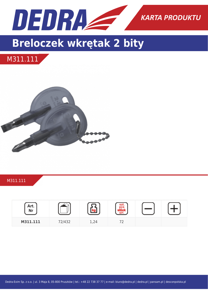 Breloczek wkrętak 2 bity M311.111 M311.111 M311.111 72/432 1,24 72 Dedra-Exim Sp. z o.o. | ul. 3 Maja 8, 05-800 Pruszków | tel.: +48 22 738 37 77 | e-mail: [email protected] | dedra.pl | pansam.pl | desconpolska.pl