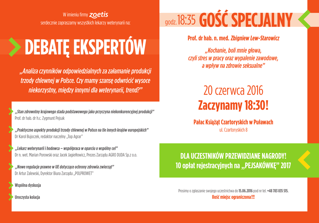 W imieniu firmy serdecznie zapraszamy wszystkich lekarzy weterynarii na: DEBATĘ EKSPERTÓW „Analiza czynników odpowiedzialnych za załamanie produkcji trzody chlewnej w Polsce. Czy mamy szansę odwrócić wysoce niekorzystny, między innymi dla weterynarii, trend?” „Stan zdrowotny krajowego stada podstawowego jako przyczyna niekonkurencyjnej produkcji” Prof. dr hab. dr h.c. Zygmunt Pejsak „Praktyczne aspekty produkcji trzody chlewnej w Polsce na tle innych krajów europejskich” Dr Karol Bujoczek, redaktor naczelny „Top Agrar” „Lekarz weterynarii i hodowca – współpraca w oparciu o wspólny cel” Dr n. wet. Marian Porowski oraz Jacek Jagiełłowicz, Prezes Zarządu AGRO DUDA Sp.z o.o. „Nowe regulacje prawne w UE dotyczące ochrony zdrowia zwierząt” Dr Artur Zalewski, Dyrektor Biura Zarządu „POLPROWET” godz. 18:35 GOŚĆ SPECJALNY Prof. dr hab. n. med. Zbigniew Lew-Starowicz „Kochanie, boli mnie głowa, czyli stres w pracy oraz wypalenie zawodowe, a wpływ na zdrowie seksualne” 20 czerwca 2016 Zaczynamy 18:30! Pałac Książąt Czartoryskich w Puławach ul. Czartoryskich 8 DLA UCZESTNIKÓW PRZEWIDZIANE NAGRODY! 10 opłat rejestracyjnych na „PEJSAKÓWKĘ” 2017 Wspólna dyskusja Prosimy o zgłaszanie swojego uczestnictwa do 15.06.2016 pod nr tel. +48 783 835 515. Uroczysta kolacja Ilość miejsc ograniczona!!!