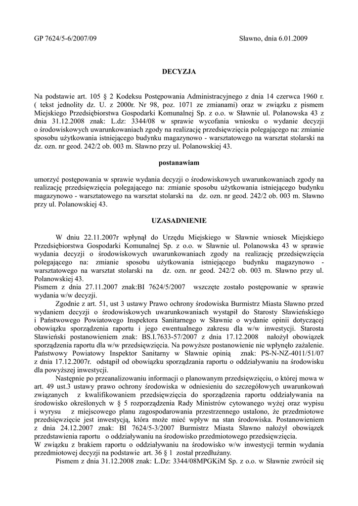 GP 7624/5-6/2007/09 Sławno, dnia 6.01.2009 DECYZJA Na podstawie art. 105 § 2 Kodeksu Postępowania Administracyjnego z dnia 14 czerwca 1960 r. ( tekst jednolity dz. U. z 2000r. Nr 98, poz. 1071 ze zmianami) oraz w związku z pismem Miejskiego Przedsiębiorstwa Gospodarki Komunalnej Sp. z o.o. w Sławnie ul. Polanowska 43 z dnia 31.12.2008 znak: L.dz: 3344/08 w sprawie wycofania wniosku o wydanie decyzji o środowiskowych uwarunkowaniach zgody na realizację przedsięwzięcia polegającego na: zmianie sposobu użytkowania istniejącego budynku magazynowo - warsztatowego na warsztat stolarski na dz. ozn. nr geod. 242/2 ob. 003 m. Sławno przy ul. Polanowskiej 43. postanawiam umorzyć postępowania w sprawie wydania decyzji o środowiskowych uwarunkowaniach zgody na realizację przedsięwzięcia polegającego na: zmianie sposobu użytkowania istniejącego budynku magazynowo - warsztatowego na warsztat stolarski na dz. ozn. nr geod. 242/2 ob. 003 m. Sławno przy ul. Polanowskiej 43. UZASADNIENIE W dniu 22.11.2007r wpłynął do Urzędu Miejskiego w Sławnie wniosek Miejskiego Przedsiębiorstwa Gospodarki Komunalnej Sp. z o.o. w Sławnie ul. Polanowska 43 w sprawie wydania decyzji o środowiskowych uwarunkowaniach zgody na realizację przedsięwzięcia polegającego na: zmianie sposobu użytkowania istniejącego budynku magazynowo warsztatowego na warsztat stolarski na dz. ozn. nr geod. 242/2 ob. 003 m. Sławno przy ul. Polanowskiej 43. Pismem z dnia 27.11.2007 znak:BI 7624/5/2007 wszczęte zostało postępowanie w sprawie wydania w/w decyzji. Zgodnie z art. 51, ust 3 ustawy Prawo ochrony środowiska Burmistrz Miasta Sławno przed wydaniem decyzji o środowiskowych uwarunkowaniach wystąpił do Starosty Sławieńskiego i Państwowego Powiatowego Inspektora Sanitarnego w Sławnie o wydanie opinii dotyczącej obowiązku sporządzenia raportu i jego ewentualnego zakresu dla w/w inwestycji. Starosta Sławieński postanowieniem znak: BS.I.7633-57/2007 z dnia 17.12.2008 nałożył obowiązek sporządzenia raportu dla w/w przedsięwzięcia. Na powyższe postanowienie nie wpłynęło zażalenie. Państwowy Powiatowy Inspektor Sanitarny w Sławnie opinią znak: PS-N-NZ-4011/51/07 z dnia 17.12.2007r. odstąpił od obowiązku sporządzania raportu o oddziaływaniu na środowisku dla powyższej inwestycji. Następnie po przeanalizowaniu informacji o planowanym przedsięwzięciu, o której mowa w art. 49 ust.3 ustawy prawo ochrony środowiska w odniesieniu do szczegółowych uwarunkowań związanych z kwalifikowaniem przedsięwzięcia do sporządzenia raportu oddziaływania na środowisko określonych w § 5 rozporządzenia Rady Ministrów cytowanego wyżej oraz wypisu i wyrysu z miejscowego planu zagospodarowania przestrzennego ustalono, że przedmiotowe przedsięwzięcie jest inwestycją, która może mieć wpływ na stan środowiska. Postanowieniem z dnia 24.12.2007 znak: BI 7624/5-3/2007 Burmistrz Miasta Sławno nałożył obowiązek przedstawienia raportu o oddziaływaniu na środowisko przedmiotowego przedsięwzięcia. W związku z brakiem raportu o oddziaływaniu na środowisko w/w inwestycji termin wydania przedmiotowej decyzji na podstawie art. 36 § 1 został przedłużany. Pismem z dnia 31.12.2008 znak: L.Dz: 3344/08MPGKiM Sp. z o.o. w Sławnie zwrócił się z prośbą o wycofanie wniosku w sprawie wydania decyzji o środowiskowych uwarunkowaniach zgody na realizację przedsięwzięcia polegającego na: zmianie sposobu użytkowania istniejącego budynku magazynowo - warsztatowego na warsztat stolarski na dz. ozn. nr geod. 242/2 ob. 003 m. Sławno przy ul. Polanowskiej 43. Z uwagi na fakt, iż o wycofanie wniosku wystąpiła strona, na której żądane postępowanie zostało wszczęte, umorzenie postępowania jest zasadne. Pouczenie Od decyzji niniejszej służy stronie prawo wniesienia odwołania do Samorządowego Kolegium Odwoławczego w Koszalinie w terminie 14 dni licząc od dnia doręczenia niniejszej decyzji za pośrednictwem organu wydającego decyzję. Otrzymują: 1. Miejskie Przedsiębiorstwo Gospodarki Komunalnej i Mieszkaniowej S-ka z o.o. w Sławnie ul. Polanowska 43, 76-100 Sławno 2. Hołowacz Barbara, ul. Polanowska 43, 76-100 Sławno 3. Zachodniopomorski Zarząd Dróg Wojewódzkich w Koszalinie ul. Szczecińska 31,75-122 Koszalin 4. Starostwo Powiatowe w Sławnie, ul. Sempołowskiej 2 a, 76-100 Sławno 5. Państwowy Powiatowy Inspektor Sanitarny w Sławnie, ul. Sempołowskiej 2 a, 76-100 Sławno 6. a/a