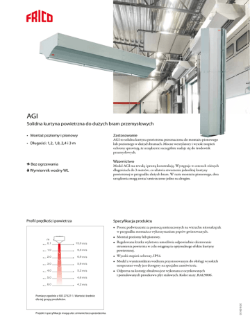 AGI AGI Solidna kurtyna powietrzna do dużych bram przemysłowych • Montaż poziomy i pionowy Zastosowanie AGI to solidna kurtyna powietrzna przeznaczona do montażu pionowego lub poziomego w dużych bramach. Mocne wentylatory i wysoki stopień ochrony sprawiają, że urządzenie szczególnie nadaje się do środowisk przemysłowych. • Długości: 1,2, 1,8, 2,4 i 3 m Wzornictwo 1 Bez ogrzewania 2 Wymiennik wodny WL Model AGI ma trwałą i prostą konstrukcję. Występuje w czterech różnych długościach do 3 metrów, co ułatwia stworzenie jednolitej kurtyny powietrznej w przypadku dużych bram. W razie montażu pionowego, dwa urządzenia mogą zostać umieszczone jedno na drugim. Profil prędkości powietrza Specyfikacja produktu • Proste podwieszenie za pomocą umieszczonych na wierzchu nitonakrętek w przypadku montażu z wykorzystaniem prętów gwintowanych. • Montaż poziomy lub pionowy. m m 0,1 15,0 m/s 1,0 9,5 m/s • Regulowana kratka wylotowa umożliwia odpowiednie skierowanie strumienia powietrza w celu osiągnięcia optymalnego efektu kurtyny powietrznej. 2,0 6,9 m/s • Wysoki stopień ochrony, IP54. 3,0 5,9 m/s • Model z wymiennikiem wodnym przystosowanym do obsługi wysokich temperatur wody jest dostępny na specjalne zamówienie. 4,0 5,2 m/s 5,0 4,6 m/s 6,0 4,2 m/s • Odporna na korozję obudowa jest wykonana z ocynkowanych i pomalowanych proszkowo płyt stalowych. Kolor szary, RAL9006. Pomiary zgodnie z ISO 27327-1. Wartości średnie dla tej grupy produktów. 2016-09-20 Projekt i specyfikacje mogą ulec zmianie bez uprzedzenia. AGI Dane techniczne Montaż poziomy 1 Bez ogrzewania - AGI A Typ Moc AGIH2A Poziom głośności*1 [dB(A)] Napięcie silnika [V] Natężenie silnika [A] Długość Waga [kW] Wydajność powietrza [m3/h] [mm] [kg] 0 7000 69 400V3~ 2,4 1200 51 AGIH3A 0 10500 71 400V3~ 3,5 1800 75 AGIH4A 0 14000 72 400V3~ 4,7 2400 97 AGIH5A 0 17500 73 400V3~ 5,9 3000 120 2 Wymiennik wodny - AGI WL, wężownica do wody o niskiej temperaturze (480 °C) Typ Moc*3 AGIH2WL [kW] Wydajność powietrza [m3/h] 33 7000 ∆t*2,3 Napięcie silnika [V] Natężenie silnika [A] Długość [°C] Pojemność Poziom wymiennika głośności*1 [dB(A)] [l] [mm] [kg] 14 6,6 400V3~ 2,4 1200 82 69 Waga AGIH3WL 48 10500 13 10,1 71 400V3~ 3,5 1800 125 AGIH4WL 64 14000 14 14,0 72 400V3~ 4,7 2400 165 AGIH5WL 81 17500 14 17,6 73 400V3~ 5,9 3000 205 *1) Warunki: Odległość do urządzenia 5 m. Współczynnik kierunkowy: 2. Powierzchnia absorpcji: 200 m². *2) ∆t = przyrost temperatury przy maksymalnej mocy grzewczej i najwyższym przepływie powietrza. *3) Przy temperaturze wody 60/40 °C, temperatura powietrza +18 °C. Montaż pionowy 1 Bez ogrzewania - AGI A Typ Moc AGIV2A Poziom głośności*1 [dB(A)] Napięcie silnika [V] Natężenie silnika [A] Długość Waga [kW] Wydajność powietrza [m3/h] [mm] [kg] 0 7000 69 400V3~ 2,4 1200 51 AGIV3A 0 10500 71 400V3~ 3,5 1800 75 AGIV4A 0 14000 72 400V3~ 4,7 2400 97 AGIV5A 0 17500 73 400V3~ 5,9 3000 120 2 Wymiennik wodny - AGI WL, wężownica do wody o niskiej temperaturze (480 °C) Typ Moc*3 AGIV2WL [kW] Wydajność powietrza [m3/h] 33 7000 ∆t*2,3 Poziom głośności*1 [dB(A)] Napięcie silnika [V] Natężenie silnika [A] Długość [°C] Pojemność wymiennika [l] [mm] [kg] 14 6,6 69 400V3~ 2,4 1200 82 Waga AGIV3WL 48 10500 13 10,1 71 400V3~ 3,5 1800 125 AGIV4WL 64 14000 14 14,0 72 400V3~ 4,7 2400 165 AGIV5WL 81 17500 14 17,6 73 400V3~ 5,9 3000 205 *1) Warunki: Odległość do urządzenia 5 m. Współczynnik kierunkowy: 2. Powierzchnia absorpcji: 200 m². *2) ∆t = przyrost temperatury przy maksymalnej mocy grzewczej i najwyższym przepływie powietrza. *3) Przy temperaturze wody 60/40 °C, temperatura powietrza +18 °C. Stopień ochrony: IP54. Certyfikat CE. AGI Wymiary Montaż poziomy L 185 485 300 730 L/2 75 M10 25 25 160 1800 AGI4 2400 AGI5 3000 25 1200 AGI3 75 AGI2 575 L [mm] 25 Wymiary króćców, gwint wewnętrzny Ø 1” DN25 AGI2 X AGI3 X AGI4 X AGI5 1 1/4” DN32 X AGI Wymiary Montaż pionowy 25 50 25 L 25 25 75 300 75 160 730 L [mm] 185 485 Wymiary króćców, gwint wewnętrzny Ø 1” DN25 AGI2 X AGI3 X AGI4 X AGI5 575 1 1/4” DN32 X AGI2 1200 AGI3 1800 AGI4 2400 AGI5 3000 AGI Montaż i podłączenie Montaż Kurtyny powietrzne umożliwiają montaż w poziomie i w pionie. min 300 mm Montaż poziomy Kurtynę powietrzną montuje się poziomo z kratką nadmuchową skierowaną w dół, tak blisko drzwi, jak to możliwe. Urządzenie jest podwieszane pod sufitem na prętach gwintowanych. W celu zabezpieczenia szerszych drzwi, można zamontować kilka urządzeń obok siebie. Montaż pionowy Kurtynę powietrzną montuje się pionowo jak najbliżej drzwi. Najlepszy efekt uzyskuje się, umieszczając kurtyny powietrzne po obu stronach wejścia. Urządzenie można odwrócić i umieścić po dowolnej stronie bramy. Dwa urządzenia mogą być zamontowane bezpośrednio jedno na drugim. Kurtynę powietrzną montuje się na dostarczonej ramie podłogowej. Listwę mocuje się poziomo do podłogi za pomocą mocowań odpowiednich do danego podłoża. Ostatnia kurtyna w zestawie pionowym musi być zabezpieczona uchwytem łączącym ze ścianą lub konstrukcją budynku. Przyłącze Minimalne odległości Urządzenie bez ogrzewania Sterowanie (400V3~) podłącza się do zacisku w skrzynce połączeniowej z boku urządzenia. Urządzenie z wymiennikiem wodnym Sterowanie (400V3~) podłącza się do zacisku w skrzynce połączeniowej z boku urządzenia. Wężownicę wodną podłącza się wykorzystując króćce o wymiarach podanych w tabeli (patrz schemat) z boku urządzenia. Akcesoria GP1010, pręt gwintowany Pręt gwintowany do montażu sufitowego. Długość 1 m. M10. Modele o długości 1,2 m wymagają czterech, a pozostałe sześciu prętów. AXP500, osłona przed uderzeniami Osłona podłogowa chroniąca przed uderzeniami, na przykład przez wózki widłowe. Wysokość 1 m. Kolor: czerwony, inne kolory na zamówienie. Typ Opis GP1010 Pręt 