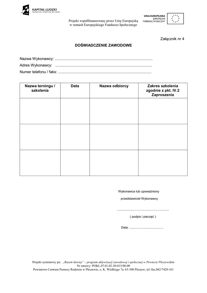 Projekt współfinansowany przez Unię Europejską w ramach Europejskiego Funduszu Społecznego Załącznik nr 4 DOŚWIADCZENIE ZAWODOWE Nazwa Wykonawcy: ............................................................................................ Adres Wykonawcy: ........................................................................................... Numer telefonu / faks: ........................................................................................ Nazwa terningu / szkolenia Data Nazwa odbiorcy Zakres szkolenia zgodnie z pkt. IV.2 Zaproszenia Wykonawca lub upoważniony przedstawiciel Wykonawcy ............................................................ ( podpis i pieczęć ) Data: ....................................... Projekt systemowy pn. „Razem łatwiej” – program aktywizacji zawodowej i społecznej w Powiecie Pleszewskim Nr umowy: POKL.07.01.02-30-015/08-00 Powiatowe Centrum Pomocy Rodzinie w Pleszewie, u. K. Wielkiego 7a, 63-300 Pleszew, tel./fax.062/7420-161