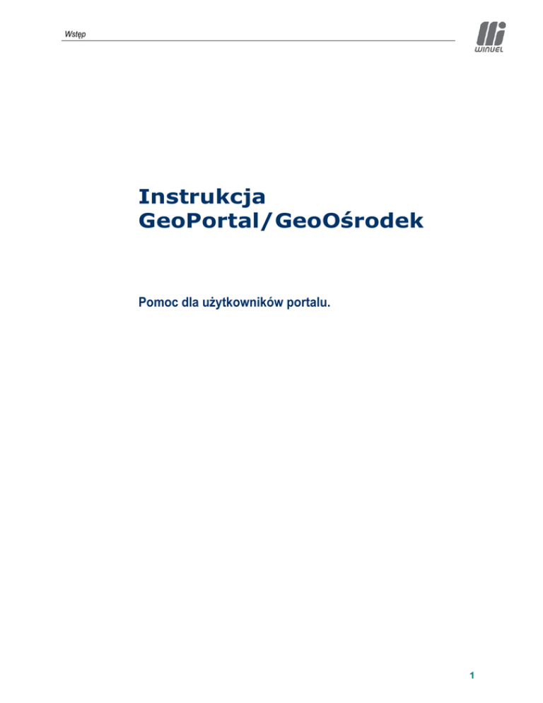 Wstęp Instrukcja GeoPortal/GeoOśrodek Pomoc dla użytkowników portalu. 1 Wstęp Spis treści Wstęp ............................................................................................ 4 Rejestracja .................................................................................... 4 Logowanie i wylogowanie .............................................................. 6 Logowanie .............................................................................................................................................................. 6 Wylogowanie .......................................................................................................................................................... 7 Odzyskiwanie hasła ....................................................................... 7 Zmiana hasła ................................................................................. 8 Kontakt z administratorem ............................................................ 9 Zgłoszenia prac geodezyjnych ..................................................... 11 Dodanie nowego zgłoszenia................................................................................................................................. 11 Obiekt położenie ............................................................................................................................................................ 12 Data rozpoczęcia ........................................................................................................................................................... 12 Planowana data zakończenia prac ................................................................................................................................ 13 Opis prac ........................................................................................................................................................................ 14 Rodzaje prac .................................................................................................................................................................. 14 Geometria ...................................................................................................................................................................... 16 Geometria - Rysowanie obszarów na mapie .................................................................................................................................. 17 Geometria - Działki .......................................................................................................................................................................... 18 Punkty osnowy ............................................................................................................................................................... 24 Geodeta uprawniony ...................................................................................................................................................... 26 Forma płatności.............................................................................................................................................................. 27 Osoba upoważniona – do odbioru faktury VAT.............................................................................................................. 27 Osoba upoważniona – do odbioru opracowań i uzyskania informacji............................................................................ 27 Osoba upoważniona – wyznaczona do kartowania i kreślenia na mapie ...................................................................... 27 Osoba upoważniona – do odbioru materiałów dla zleceniodawcy ................................................................................. 28 Nr pisma ......................................................................................................................................................................... 28 Informacje dodatkowe wykonawcy................................................................................................................................. 28 Informacje dodatkowe dla zgłoszenia ............................................................................................................................ 28 Prognozowana ilość jednostek....................................................................................................................................... 29 Propozycja etapowania pracy i zakres przekazywanej dokumentacji ............................................................................ 29 Lista wysłanych zgłoszeń ..................................................................................................................................... 29 Szczegóły zgłoszenia ..................................................................................................................................................... 30 Pliki do pobrania............................................................................................................................................................. 32 Usuwanie zgłoszenia ..................................................................................................................................................... 35 Edycja zgłoszenia .......................................................................................................................................................... 35 Przeglądarka mapowa ................................................................. 35 Funkcje paska narzędziowego mapy ................................................................................................................... 36 Warstwy mapy, Legenda mapy ............................................................................................................................ 42 Menu .........................................................................................