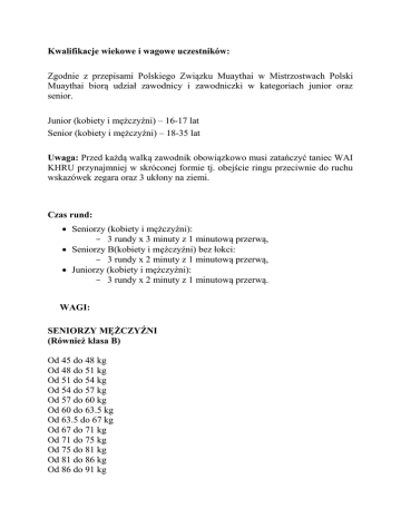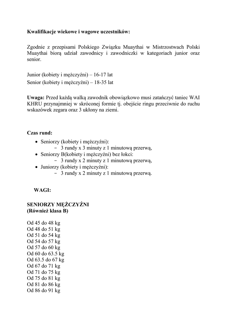 Kwalifikacje wiekowe i wagowe uczestników: Zgodnie z przepisami Polskiego Związku Muaythai w Mistrzostwach Polski Muaythai biorą udział zawodnicy i zawodniczki w kategoriach junior oraz senior. Junior (kobiety i mężczyźni) – 16-17 lat Senior (kobiety i mężczyźni) – 18-35 lat Uwaga: Przed każdą walką zawodnik obowiązkowo musi zatańczyć taniec WAI KHRU przynajmniej w skróconej formie tj. obejście ringu przeciwnie do ruchu wskazówek zegara oraz 3 ukłony na ziemi. Czas rund: Seniorzy (kobiety i mężczyźni): - 3 rundy x 3 minuty z 1 minutową przerwą, Seniorzy B(kobiety i mężczyźni) bez łokci: - 3 rundy x 2 minuty z 1 minutową przerwą, Juniorzy (kobiety i mężczyźni): - 3 rundy x 2 minuty z 1 minutową przerwą. WAGI: SENIORZY MĘŻCZYŹNI (Również klasa B) Od 45 do 48 kg Od 48 do 51 kg Od 51 do 54 kg Od 54 do 57 kg Od 57 do 60 kg Od 60 do 63.5 kg Od 63.5 do 67 kg Od 67 do 71 kg Od 71 do 75 kg Od 75 do 81 kg Od 81 do 86 kg Od 86 do 91 kg Powyżej 91 kg SENIORZY KOBIETY Od 45 do 48 kg Od 48 do 51 kg Od 51 do 54 kg Od 54 do 57 kg Od 57 do 60 kg Od 60 do 63.5 kg Od 63.5 do 67 kg Od 67 do 71 kg Od 71 do 75 kg od 75 do 81 kg JUNIORZY MĘŻCZYŹNI Od 42 do 45 kg Od 45 do 48 kg Od 48 do 51 kg Od 51 do 54 kg Od 54 do 57 kg Od 57 do 60 kg Od 60 do 63.5 kg Od 63.5 do 67 kg Od 67 do 71 kg Od 71 do 75 kg Od 75 do 81 kg Od 81 do 86 kg Od 86 do 91 kg Powyżej 91 kg JUNIORZY KOBIETY Od 42 do 45 kg Od 45 do 48 kg Od 48 do 51 kg Od 51 do 54 kg Od 54 do 57 kg Od 57 do 60 kg Od 60 do 63.5 kg Od 63.5 do 67 kg Od 67 do 71 kg Od 71 do 75 kg Od 75 do 81 kg