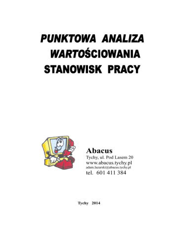 Abacus Tychy, ul. Pod Lasem 20 www.abacus.tychy.pl [email protected] tel. 601 411 384 Tychy 2014 Program komputerowy PAW, PUNKTOWA ANALIZA WARTO,CIOWANIA STANOWISK PRACY jest narz2dziem wspomagaj3cym ustalenie wysoko4ci wynagrodze5 za prac2, która powinna by7 uzale8niona od takich czynników jak rodzaj wykonywanej pracy, wymagane kwalifikacje czy zakres odpowiedzialno4ci i uprawnie5. Program zawiera model analityczno – punktowej metody warto4ciowania, który obejmuje: opis kryteriów warto4ciowania wraz z ich definicjami poziomy spe<nienia poszczególnych kryteriów zasady przyznawania punktów OPIS PROGRAMU Po uruchomieniu programu na ekranie poka8e si2 tabela zawieraj3ca struktur2 organizacyjn3 firmy zawieraj3c3 piony, podleg<e im komórki organizacyjne oraz stanowiska pracy zawieraj3ce si2 w tych komórkach. Jednostki struktury organizacyjnej oznaczone s3 Stanowisko pracy przed warto4ciowaniem natomiast po warto4ciowaniu Nale8y nacisn37 myszk3 na dowolny element struktury, wtedy na pasku nag<ówka formatki poka8e si2 nazwa wybranej jednostka lub stanowiska. Nad obrazem struktury widoczne s3 przyciski s<u83ce do obs<ugi programu: Naci4ni2cie przycisku spowoduje rozwini2cie listy jednostek struktury organizacyjnej i stanowisk pracy. Przycisk zwija struktur2 pozostawiaj3c tylko jednostki nadrz2dne Dopisanie nowego obiektu (jednostki lub stanowiska) realizuje si2 przyciskiem , przy czym je4li pod4wietlona jest jednostka, program automatycznie wybierze dopisywanie nowej jednostki, przy pod4wietlonym stanowisku b2dzie chcia< dopisa7 stanowisko. Typ stanowiska tu wpisujemy nazw2 nowej jednostki lub stanowiska przycisk pozwala na wybór typu dopisywanego elementu stanowisko pracy jednostka organizacyjna obs<uga okienka jest analogiczna jak powy8ej Po pod4wietleniu stanowiska, które posiada warto4ciowanie: pojawia si2 skrócona tabela wyników. anuluje dopisanie dopiero zaakceptowanie powoduje dopisanie elementu Nad wykazem stanowisk pojawia si2 liczba i jest ona wynikiem warto4ciowania danego stanowiska, które mamy w danej chwili pod4wietlone. Usuwanie obiektu (jednostki lub stanowiska) realizuje si2 przyciskiem przy czym aby usun37 musi by7 pod4wietlone stanowisko lub jednostka, znajduj3ca si2 w najni8szej podgrupie, bez usuni2cia ni8szych stanowisk nie mo8na usun37 jednostki nadrz2dnej znajduj3cej si2 na samej górze. Przy usuwaniu pokazuje si2 nazwa stanowiska oraz dwa przyciski: Tak i Nie. Je4li chcemy usun37 naciskamy Tak. Je4li omy<kowo nacisn2li4my usu5 w pasku. Mo8emy anulowa7 usuni2cie poprzez naci4ni2cie przycisku Nie. Przy pod4wietlonej jednostce i naci4ni2ciu usu5 pojawia si2 równie8 dBwi2k (uderzenia o metal) informuj3cy, 8e dana jednostka mo8e zosta7 usuni2ta. Zmiana nazwy obiektu (jednostki lub stanowiska) realizuje si2 przyciskiem przy czym aby zmieni7 nazw2 mo8na mie7 pod4wietlon3 jednostk2 lub stanowisko (odpowiednio do tego czemu chcemy zmieni7 nazw2). Pojawia si2 okienko, w którym napisana jest stara nazwa, któr3 chcemy zmieni7. Po wpisaniu nazwy mo8na jeszcze wybra7 czy dane stanowisko jest umys<owe czy fizyczne. wybieramy czy stanowisko jest umys<owe czy fizyczne tu wpisujemy now3 nazw2 jednostki lub stanowiska anuluje zmian2 nazwy dopiero po zaakceptowaniu nazwa zostaje zmieniona Przycisk pokazuje arkusz wyników warto4ciowania. Przy czym opcja ta jest mo8liwa je4li pod4wietlona jednostka (nie stanowisko) posiada w swojej podgrupie stanowisko warto4ciowane lub niewarto4ciowane. W przypadku warto4ciowanego stanowiska pracy w ka8dym kryterium pojawia si2 warto47 punktowa, odpowiadaj3ca odpowiedniemu kryterium. Natomiast na stanowisku przed warto4ciowaniem punkty przyznawane odpowiednio przy ka8dym kryterium s3 równe 0. - niebieski znaczek przy nazwie oznacza, 8e jest to stanowisko pracownika fizycznego. - czerwony znaczek przy nazwie oznacza, 8e jest to stanowisko umys<owe zaznaczona jednostka stanowisko niewarto4ciowane stanowisko warto4ciowane Aby u<o8y7 wyniki wed<ug 83danego kryterium nale8y nacisn37 w odpowiedni3 kolumn2. Nazw2 lub liter2 znajduj3c3 na czarnym tle. Przycisk ten znajduj3cy si2 po prawej stronie arkusza pozwala na poprawienie lub dopisanie brakuj3cych elementów kiedy stanowisko jest warto4ciowane. W przypadku kiedy stanowisko nie jest jeszcze warto4ciowane, po naci4ni2ciu przycisku pojawia si2 mo8liwo47 wpisywania elementów potrzebnych do warto4ciowania. Gdy naci4niemy przycisk znajduj3cy si2 po prawej stronie Arkusza wyników warto4ciowania pojawia si2 okno warto4ciowania stanowiska, które by<o pod4wietlone. W pierwszej zak<adce Usytuowanie formalne mo8na uzupe<nia7 dane potrzebne do warto4ciowania. Aby dopisa7 nale8y zaznaczy7 miejsce gdzie dopisujemy lub nacisn37 przycisk i wybra7 jednostk2/ stanowisko do opisania. W zak<adce wpisa7 mo8na ilo47 podleg<ych pracowników (dla stanowiska wy4wietlonego w lewym górnym rogu). W prawym górnym roku znajduje si2 suma warto4ciowania lub w przypadku stanowiska nie warto4ciowanego przycisk, punkty warto4ciowania i zapisuje zmiany. który przelicza Po naci4ni2ciu przycisku pozwala on na poprawianie w wybranych jednostkach i stanowiskach. Mo8na zaznaczy7 czy dane stanowisko, które chcemy poprawi7 jest umys<owe czy fizyczne. Za to przycisk pozwala na wyszukanie stanowiska, które potrzebujemy znaleB7. Po naci4ni2ciu pojawia si2 okienko gdzie wpisujemy dane stanowisko. Pojawienie si2 okienka poni8ej jest mo8liwe równie8 wtedy gdy mamy pod4wietlone stanowisko (w g<ównym oknie zaraz po w<3czeniu programu) i naci4niemy . Stanowisko warto4ciowane: Stanowisko niewarto4ciowane: Kolejn3 zak<adk3 s3 g<ówne zadania realizowane na stanowisku pracy, które mo8na dopisywa7 do danego stanowiska lub poprawia7 poprzez naci4niecie przycisku W zak<adce uprawnienia znajduj3 si2 szczegó<owe uprawnienia zawodowe realizowane na stanowisku pracy, które mo8na dopisywa7 do danego stanowiska lub poprawia7 poprzez naci4niecie przycisku . Poprawa mo8liwa jest tylko wtedy gdy zaznaczony jest kwadracik: W kolejnych zak<adkac