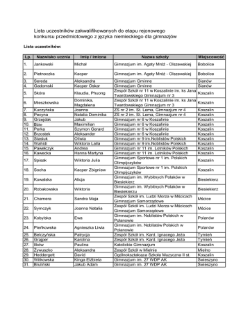 Lista uczestników zakwalifikowanych do etapu rejonowego konkursu przedmiotowego z języka niemieckiego dla gimnazjów Lista uczestników: Lp. Nazwisko ucznia Imię / imiona Nazwa szkoły Miejscowość 1. Jankowski Michał Gimnazjum im. Agaty Mróż - Olszewskiej Bobolice 2. Pietnoczka Kacper Gimnazjum im. Agaty Mróż - Olszewskiej Bobolice 3. 4. Sereda Gadomski Aleksandra Kacper Oskar Sianów Sianów 5. Skóra Klaudia, Phuong 6. Mieszkowska 7. 8. 9. 10. 11. 12. 13. 14. 15. 16. Kuczyńska Pecyna Grzejdak Bäte Perka Brzostek Stasiuk Wahidi Pawełczyk Kawecka Dominika, Magdalena Joanna Natalia Dominika Jakub Maximilian Szymon Gerard Aleksander Oliwia Wiktoria Laila Andrea Hanna Martyna 17. Spisak Wiktoria Julia 18. Socha Kacper Zbigniew 19. Kowalska Alicja 20. Robakowska Wiktoria 21. Chamera Sandra Maja 22. Symczyk Joanna Natalia 23. Kobylska Ewa 24. Pieńkowska Agnieszka Liwia 25. 26. 27. 28. 29. 30. 31. Belczyńska Grajper Ilków Żywuszko Heddergott Witkowska Bruliński Patrycja Karolina Paulina Aleksandra David Kinga Elżbieta Jakub Adam Gimnazjum Gminne Gimnazjum Gminne Zespół Szkół nr 11 w Koszalinie im. ks Jana Twardowskiego Gimnazjum nr 3 Zespół Szkół nr 11 w Koszalinie im. ks Jana Twardowskiego Gimnazjum nr 3 ZS nr 2 im. St. Lema, Gimnazjum nr 4 ZS nr 2 im. St. Lema, Gimnazjum nr 4 Gimnazjum nr 6 w Koszalinie Gimnazjum nr 6 w Koszalinie Gimnazjum nr 6 w Koszalinie Gimnazjum nr 6 w Koszalinie Gimnazjum nr 9 im.Noblistów Polskich Gimnazjum nr 9 im.Noblistów Polskich Gimnazjum nr 11 im. Lotników Polskich Gimnazjum nr 11 im. Lotników Polskich Gimnazjum Sportowe nr 1 im. Polskich Olimpijczyków Gimnazjum Sportowe nr 1 im. Polskich Olimpijczyków Gimnazjum im. Wybitnych Polaków w Biesiekierz Gimnazjum im. Wybitnych Polaków w Biesiekierzu Zespół Szkół im. Ludzi Morza w Mścicach Gimnazjum Samorządowe Zespół Szkół im. Ludzi Morza w Mścicach Gimnazjum Samorządowe Gimnazjum im. Noblistów Polskich w Polanowie Gimnazjum im. Noblistów Polskich w Polanowie Zespół Szkół im. Kard. Ignacego Jeża Zespół Szkół im. Kard. Ignacego Jeża Katolickie Gimnazjum Zespół Szkół w Mielnie Ogólnokształcąca Szkoła Muzyczna II st. Gimnazjum im. 27 WDP AK Gimnazjum im. 27 WDP AK Koszalin Koszalin Koszalin Koszalin Koszalin Koszalin Koszalin Koszalin Koszalin Koszalin Koszalin Koszalin Koszalin Koszalin Biesiekierz Biesiekierz Mścice Mścice Polanów Polanów Tymień Tymień Koszalin Mielno Koszalin Świeszyno Świeszyno