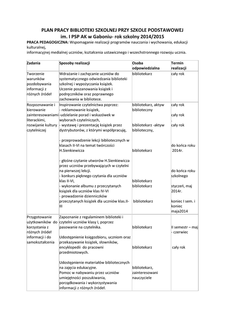 PLAN PRACY BIBLIOTEKI SZKOLNEJ PRZY SZKOLE