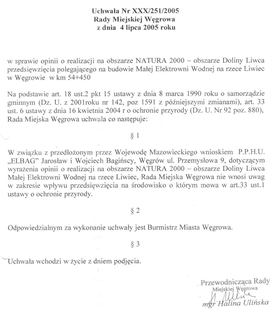 Uchwala Nr XXXJ251/2005 Rady Miejskiej W egrowa z dnia 4 lipca 2005 roku w sprawie opinii o realizacji na obszarze NATURA 2000 obszarze Doliny Liwca przedsiewziecia polegajacego na budowie Malej Elektrowni Wodnej na rzece Liwiec w Wegrowie w km 54+450 - Na podstawie art. 18 ust.2 pkt 15 ustawy z dnia 8 marca 1990 roku o samorzadzie gminnym (Dz. U. z 2001roku nr 142, poz 1591 z pózniejszymi zmianami), art. 33 ust. 6 ustawyz dnia 16kwietnia 2004 I' o ochronieprzyrody(Dz. U. Nr 92 poz. 880), Rada Miejska Wegrowa uchwala co nastepuje: §1 W zwiazku z przedlozonym przez Wojewode Mazowieckiego wnioskiem P.P.H.U. "ELBAG" Jaroslaw i Wojciech Baginscy, Wegrów ul. Przemyslowa 9, dotyczacym wyrazenia opinii o realizacji na obszarze NATURA 2000 - obszarze Doliny Liwca Malej Elektrowni Wodnej na rzece Liwiec, Rada Miejska Wegrowa nie wnosi uwag w zakresie wplywu przedsiewziecia na srodowisko o którym mowa w art.33 ust.1 ustawy o ochronie przyrody. §2 Odpowiedzialnym za wykonanie uchwaly jest Burmistrz Miasta Wegrowa. §3 "'--'Uchwalawchodzi w zycie z dniem podjecia. , Przewodniczaca . Rady ~~a ~iejSkiej 'f mif-~ . Ulinska Uzasadnienie Wojewoda Mazowiecki pismem z dnia 20.06.2005 roku wystapil do Rady Miejskiej Wegrowa o wyrazenie opinii na temat wplywu przedsiewziecia: " Budowa Malej Elektrowni Wodnej na rzece Liwiec w Wegrowie w km 54+450" na siedliska przyrodnicze oraz gatunki roslin i zwierzat dla który<;hochrony zostal wyznaczony obszar NATURA 2000, na podstawie art. 33 ust.6 ustawy z dnia 16 kwietnia 2004 r. o ochronie przyrody (Dz.U.Nr 92 Poz. 880). ~ Budowa Malej Elektrowni Wodnej na terenie, który jest juz zurbanizowany nie stwarza zagr~zenia dla siedlisk przyrodniczych oraz zwierzat zasiedlajacych omawiany teren. Dolaczona do wniosku opinia zawarta w Raporcie oddzialywania na srodowisko Malej Elektrowni Wodnej na rzece Liwiec w Wegrowie w km 54+450, wykazala brak bezposrednich zagrozen dla siedlisk przyrodniczych, roslin i zwierzat. Elementem zabezpieczajacym przedostawania sie zwierzat wiekszych rozmiarów do turbin, bedzie krata zamontowana na prowadnicach zamkniec remontowych przednich. Przyjete rozwiazania techniczne neutralizuja wplyw przedsiewziecia na srodowisko w zwiazku z tym pozytywnie opiniuje sie realizacje przedsiewziecia. Przewodniczaca Rady ~ ~ ~iejskiej W m~ . U/inska