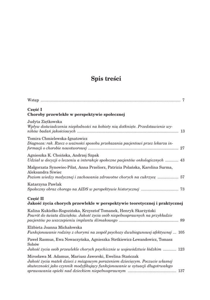 Spis treści Wstęp ................................................................................................................................ 7 Część I Choroby przewlekłe w perspektywie społecznej Judyta Ziętkowska Wpływ doświadczenia niepłodności na kobiety nią dotknięte. Przedstawienie wyników badań jakościowych ............................................................................................. 13 Tomira Chmielewska-Ignatowicz Diagnoza: rak. Rzecz o ważności sposobu przekazania pacjentowi przez lekarza informacji o chorobie nowotworowej ................................................................................... 27 Agnieszka K. Choińska, Andrzej Szpak Udział w decyzji o leczeniu a interakcje społeczne pacjentów onkologicznych ............. 43 Małgorzata Synowiec-Piłat, Anna Przeliorz, Patrizia Polańska, Karolina Surma, Aleksandra Siwiec Poziom wiedzy medycznej i zachowania zdrowotne chorych na cukrzycę .................... 57 Katarzyna Pawlak Społeczny obraz chorego na AIDS w perspektywie historycznej ................................... 73 Część II Jakość życia chorych przewlekle w perspektywie teoretycznej i praktycznej Kalina Kukiełko-Rogozińska, Krzysztof Tomanek, Henryk Skarżyński Powrót do świata dźwięków. Jakość życia osób niepełnosprawnych na przykładzie pacjentów po wszczepieniu implantu ślimakowego ....................................................... 89 Elżbieta Joanna Michałowska Funkcjonowanie rodziny z chorymi na zespół psychozy dwubiegunowej afektywnej .... 105 Paweł Rasmus, Ewa Nowaczyńska, Agnieszka Stetkiewicz-Lewandowicz, Tomasz Sobów Jakość życia osób przewlekle chorych psychicznie w województwie łódzkim ............. 123 Mirosława M. Adamus, Mariusz Jaworski, Ewelina Stańczak Jakość życia matek dzieci z mózgowym porażeniem dziecięcym. Poczucie własnej skuteczności jako czynnik modyfikujący funkcjonowanie w sytuacji długotrwałego sprawowania opieki nad dzieckiem niepełnosprawnym ............................................. 137 6 Spis treści Grażyna Mikołajczyk-Lerman Warunki i jakość życia w gospodarstwach domowych z dzieckiem niepełnosprawnym ............................................................................................................................... 147 Grzegorz Brzuzy Jakość życia osób z trwałym i postępującym uszkodzeniem wzroku .......................... 159 Sabina Pawlas-Czyż Społeczne konsekwencje choroby onkologicznej dla pacjenta i jego rodziny z perspektywy pracowników ośrodków hospicyjnych ........................................................... 179 Wioleta Bryniewicz Jakość życia kobiet w średnim wieku – podejście holistyczne ..................................... 195 Dorota Rynkowska Wybrane aspekty jakości życia osób starszych ............................................................. 209