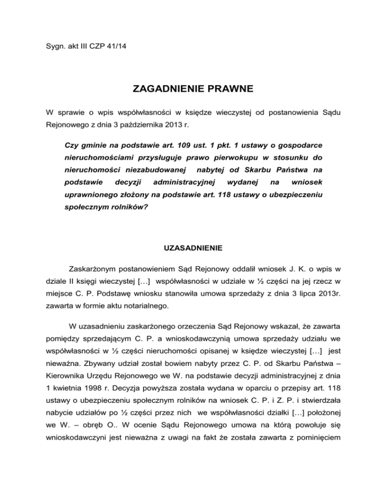 Sygn. akt III CZP 41/14 ZAGADNIENIE PRAWNE W sprawie o wpis współwłasności w księdze wieczystej od postanowienia Sądu Rejonowego z dnia 3 października 2013 r. Czy gminie na podstawie art. 109 ust. 1 pkt. 1 ustawy o gospodarce nieruchomościami przysługuje prawo pierwokupu w stosunku do nieruchomości niezabudowanej podstawie decyzji nabytej od Skarbu Państwa na administracyjnej wydanej na wniosek uprawnionego złożony na podstawie art. 118 ustawy o ubezpieczeniu społecznym rolników? UZASADNIENIE Zaskarżonym postanowieniem Sąd Rejonowy oddalił wniosek J. K. o wpis w dziale II księgi wieczystej […] współwłasności w udziale w ½ części na jej rzecz w miejsce C. P. Podstawę wniosku stanowiła umowa sprzedaży z dnia 3 lipca 2013r. zawarta w formie aktu notarialnego. W uzasadnieniu zaskarżonego orzeczenia Sąd Rejonowy wskazał, że zawarta pomiędzy sprzedającym C. P. a wnioskodawczynią umowa sprzedaży udziału we współwłasności w ½ części nieruchomości opisanej w księdze wieczystej […] jest nieważna. Zbywany udział został bowiem nabyty przez C. P. od Skarbu Państwa – Kierownika Urzędu Rejonowego we W. na podstawie decyzji administracyjnej z dnia 1 kwietnia 1998 r. Decyzja powyższa została wydana w oparciu o przepisy art. 118 ustawy o ubezpieczeniu społecznym rolników na wniosek C. P. i Z. P. i stwierdzała nabycie udziałów po ½ części przez nich we współwłasności działki […] położonej we W. – obręb O.. W ocenie Sądu Rejonowego umowa na którą powołuje się wnioskodawczyni jest nieważna z uwagi na fakt że została zawarta z pominięciem 2 ustawowego prawa pierwokupu Gminy W. wynikającego z treści przepisu art. 109 ust1 pkt.1 ustawy o gospodarce nieruchomościami(dalej u.g.n.). Wnioskodawczyni apelacją z 31 października 2013r zaskarżyła w całości postanowienie Sądu Rejonowego i zarzuciła mu: 1. naruszenie prawa materialnego tj.art.109ust.1pkt 1 ustawy o gospodarce nieruchomościami i art. 599 § 2 k.c. 2. naruszenie przepisów postępowania, tj. art. 626 § 2 k.p.c. i art. 626 k.p.c. W ocenie apelującej nabycie, o którym mowa w powołanym art. 109 ust. 1 pkt 1 u.g.n. może nastąpić na podstawie umowy sprzedaży albo innej czynności prawnej przenoszącej własność, dopuszczalnej w stosunku do mienia państwowego i samorządowego. Określony w ustawie o gospodarce nieruchomościami pierwokup dotyczy jedynie nieruchomości, których prawo własności nabyto w sposób pochodny, tzn. przez sukcesję prawa przeniesionego bezpośrednio przez Skarb Państwa lub jednostkę samorządu terytorialnego na obecnego sprzedawcę, i to w drodze czynności prawnych (tak J. Jaworski, A. Prusaczyk, A.Tułodziecki. M. Wolanin Ustawa o gospodarce nieruchomościami, Komentarz, Wydawnictwo: C.H. Beck komentarz do art. 109). Zgodnie z utrwalonym orzecznictwem, przyznanie prawa własności działki, stosownie do treści przepisu art. 118 ustawy o ubezpieczeniu społecznym rolników następuje z mocy samego prawa, a warunkiem jest złożenie wniosku (wyrok Naczelnego Sądu Administracyjnego w Warszawie z dnia 26 marca 1992 r. II SA 82/92). Wydana w tym trybie decyzja potwierdzająca jedynie skutki prawne, które wynikają wprost z ustawy, ma charakter deklaratoryjny, a jej skutek w postaci przyznania owych praw wynika tu nie z mocy decyzji, lecz z mocy samych norm ustawowych. Deklaratoryjny charakter takiej decyzji, wobec nabycia w tym trybie nieruchomości z mocy prawa przesądziły sądy administracyjne w szeregu orzeczeń (wyrok NSA z 30.08.2007 r.. sygn. akt 11 OSK 1152/06; wyrok NSA z dnia 26 marca 1992 r. oraz wyrok WSA w Gorzowie Wielkopolskim z dnia 6 listopada 2008 r. sygn. akt 11 SA/Go 492/08. Rozpoznając apelację wnioskodawczyni Sąd Okręgowy powziął poważne wątpliwości, przedstawione w zagadnieniu prawnym wskazanym na wstępie postanowienia. 2 3 Zgodnie z treścią przepisu art. 109 ust. 1 pkt 1 u.g.n. prawo pierwokupu przysługuje gminie w przypadku sprzedaży niezabudowanej nieruchomości nabytej uprzednio przez sprzedawcę od Skarbu Państwa albo jednostek samorządu terytorialnego. Stosownie do treści zaś przepisu art. 599§2k.c. jeżeli prawo pierwokupu przysługuje z mocy ustawy Skarbowi Państwa lub jednostce samorządu terytorialnego, współwłaścicielowi albo dzierżawcy, sprzedaż dokonana bezwarunkowo jest nieważna. Instytucja prawa pierwokupu, jako stanowiąca ograniczenie prawa własności oraz swobody umów, wymaga ścisłej wykładni przepisów takie pierwszeństwo regulujących (uzasadnienie uchwały Sądu Najwyższego z dnia 13 lutego 1991 r. III CZP 1/91 - oraz wyroku z dnia 28 maja 1987 r. II CR 194/87). W judykaturze jak i doktrynie brak jest jednoznacznego stanowiska w przedmiocie warunków powstania na gruncie powyższego przepisu prawa pierwokupu. Literalna wykładnia przepisów ustawy o gospodarce nieruchomościami prowadzi do wniosku, iż prawem pierwokupu objęte są nieruchomości nabyte uprzednio od Skarbu Państwa lub jednostki samorządu terytorialnego niezależnie od sposobu ich nabycia. Wchodzi tu więc w grę nabycie własności na podstawie czynności prawnej, decyzji administracyjnej, a nawet na mocy ustawy. (J. Górecki Prawo pierwokupu w ustawie o gospodarowaniu nieruchomościami- Rejent 1998/12/str.42). Na gruncie poprzednio obowiązującego stanu prawnego regulującego omawianą kwestie - art. 76 ust. 1 ustawy z dnia 29 kwietnia 1985 r. o gospodarce gruntami i wywłaszczaniu nieruchomości -przyjmowano, że prawo pierwokupu nie dotyczy nieruchomości i praw nabytych od Skarbu Państwa lub jednostek samorządu terytorialnego z mocy prawa ( tak uchwała Sądu Najwyższego 7 Sędziów z 9 listopada 1998 r. III CZP 33/98). Można uznać, że powołana wyżej uchwała zachowała swoją aktualność na gruncie przepisu art. 109 u.g.n. i że prawo pierwokupu nie dotyczy nieruchomości nabytych z mocy prawa. W ocenie Sądu Okręgowego nie sposób uznać, że nabycie nieruchom