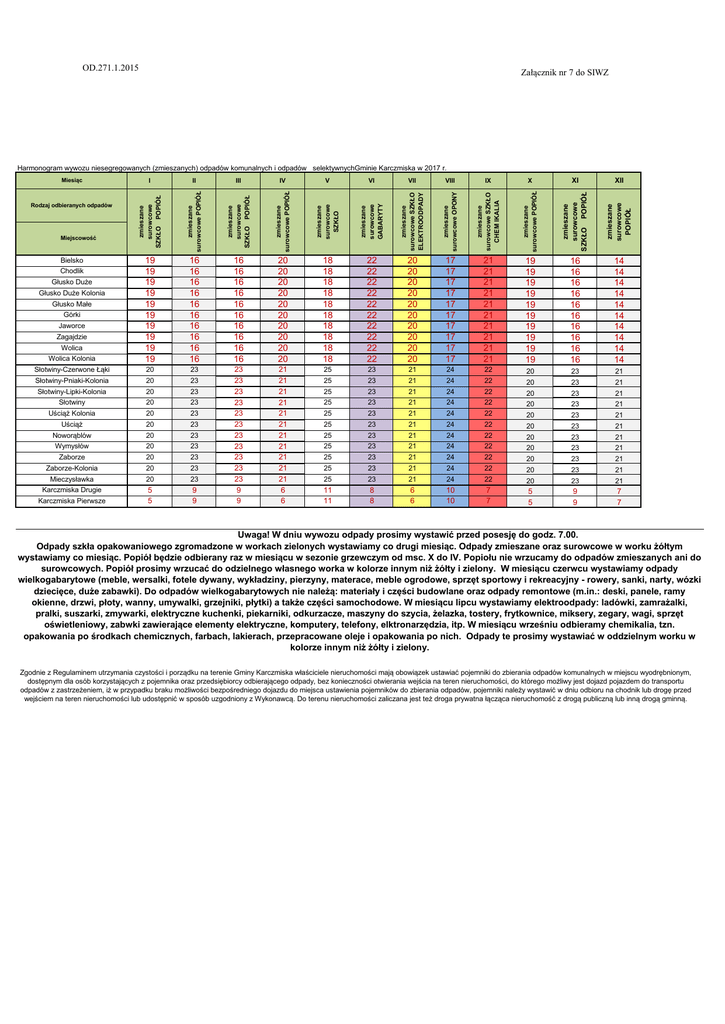 OD.271.1.2015 Załącznik nr 7 do SIWZ Harmonogram wywozu niesegregowanych (zmieszanych) odpadów komunalnych i odpadów selektywnychGminie Karczmiska w 2017 r. XII zmieszane surowcowe POPIÓŁ XI zmieszane surowcowe SZKŁO POPIÓŁ X zmieszane surowcowe POPIÓŁ IX zmieszane surowcowe SZKŁO CHEM IKALIA VIII zmieszane surowcowe OPONY VII zmieszane surowcowe SZKŁO ELEKTROODPADY VI zmieszane surowcowe GABARYTY V zmieszane surowcowe SZKŁO IV zmieszane surowcowe POPIÓŁ III zmieszane surowcowe SZKŁO POPIÓŁ II zmieszane surowcowe POPIÓŁ I zmieszane surowcowe SZKŁO POPIÓŁ Miesiąc Wolica Kolonia 19 19 19 19 19 19 19 19 19 19 16 16 16 16 16 16 16 16 16 16 16 16 16 16 16 16 16 16 16 16 20 20 20 20 20 20 20 20 20 20 18 18 18 18 18 18 18 18 18 18 22 22 22 22 22 22 22 22 22 22 20 20 20 20 20 20 20 20 20 20 17 17 17 17 17 17 17 17 17 17 21 21 21 21 21 21 21 21 21 21 19 19 19 19 19 19 19 19 19 19 16 16 16 16 16 16 16 16 16 16 14 14 14 14 14 14 14 14 14 14 Słotwiny-Czerwone Łąki 20 23 21 24 22 20 23 21 23 25 23 21 24 22 20 23 21 Słotwiny-Lipki-Kolonia 20 23 25 23 21 24 22 20 23 21 Słotwiny 20 23 25 23 21 24 22 20 23 21 Uściąż Kolonia 20 23 25 23 21 24 22 20 23 21 Uściąż 20 23 25 23 21 24 22 20 23 21 Noworąblów 20 23 25 23 21 24 22 20 23 21 Wymysłów 20 23 25 23 21 24 22 20 23 21 Zaborze 20 23 25 23 21 24 22 20 23 21 Zaborze-Kolonia 20 23 25 23 21 24 22 20 23 21 Mieczysławka 20 23 25 23 21 24 22 20 23 21 Karczmiska Drugie 5 5 9 9 21 21 21 21 21 21 21 21 21 21 21 6 6 23 20 23 23 23 23 23 23 23 23 23 23 23 9 9 25 Słotwiny-Pniaki-Kolonia 11 11 8 8 6 6 10 10 7 7 5 5 9 9 7 7 Rodzaj odbieranych odpadów Miejscowość Bielsko Chodlik Głusko Duże Głusko Duże Kolonia Głusko Małe Górki Jaworce Zagajdzie Wolica Karczmiska Pierwsze Uwaga! W dniu wywozu odpady prosimy wystawić przed posesję do godz. 7.00. Odpady szkła opakowaniowego zgromadzone w workach zielonych wystawiamy co drugi miesiąc. Odpady zmieszane oraz surowcowe w worku żółtym wystawiamy co miesiąc. Popiół będzie odbierany raz w miesiącu w sezonie grzewczym od msc. X do IV. Popiołu nie wrzucamy do odpadów zmieszanych ani do surowcowych. Popiół prosimy wrzucać do odzielnego własnego worka w kolorze innym niż żółty i zielony. W miesiącu czerwcu wystawiamy odpady wielkogabarytowe (meble, wersalki, fotele dywany, wykładziny, pierzyny, materace, meble ogrodowe, sprzęt sportowy i rekreacyjny - rowery, sanki, narty, wózki dziecięce, duże zabawki). Do odpadów wielkogabarytowych nie należą: materiały i części budowlane oraz odpady remontowe (m.in.: deski, panele, ramy okienne, drzwi, płoty, wanny, umywalki, grzejniki, płytki) a także części samochodowe. W miesiącu lipcu wystawiamy elektroodpady: ladówki, zamrażalki, pralki, suszarki, zmywarki, elektryczne kuchenki, piekarniki, odkurzacze, maszyny do szycia, żelazka, tostery, frytkownice, miksery, zegary, wagi, sprzęt oświetleniowy, zabwki zawierające elementy elektryczne, komputery, telefony, elktronarzędzia, itp. W miesiącu wrześniu odbieramy chemikalia, tzn. opakowania po środkach chemicznych, farbach, lakierach, przepracowane oleje i opakowania po nich. Odpady te prosimy wystawiać w oddzielnym worku w kolorze innym niż żółty i zielony. Zgodnie z Regulaminem utrzymania czystości i porządku na terenie Gminy Karczmiska właściciele nieruchomości mają obowiązek ustawiać pojemniki do zbierania odpadów komunalnych w miejscu wyodrębnionym, dostępnym dla osób korzystających z pojemnika oraz przedsiębiorcy odbierającego odpady, bez konieczności otwierania wejścia na teren nieruchomości, do którego możliwy jest dojazd pojazdem do transportu odpadów z zastrzeżeniem, iż w przypadku braku możliwości bezpośredniego dojazdu do miejsca ustawienia pojemników do zbierania odpadów, pojemniki należy wystawić w dniu odbioru na chodnik lub drogę przed wejściem na teren nieruchomości lub udostępnić w sposób uzgodniony z Wykonawcą. Do terenu nieruchomości zaliczana jest też droga prywatna łącząca nieruchomość z drogą publiczną lub inną drogą gminną. PODSTAWOWE ZASADY SELEKTYWNEGO ZBIERANIA ODPADÓW KOMUNALNYCH WOREK ŻÓŁTY NA ODPADY SUROWCOWE WRZUCAMY: NIE WRZUCAMY √ opakowania papierowe i tekturowe √ gazety, broszury reklamowe, katalogi, zeszyty itp. √ puste i zgniecionebutelkiplastikowe po napojach, olejach spożywczych √ opakowania plastikowe po chemii gospodarczej i kosmetykach √ czyste torebki foliowe, folie opakowaniowe, reklamówki √ metale (m.in.: puszki po napojach i żywności) √ kartonowe opakowania po mleku i napojach √plastikowe opakowania po żywności (m.in.: ogurtach, serkach) PROSIMY ZGNIEŚĆ OPAKOWANIA PRZED WRZUCENIEM DO WORKÓW ! ×tłustego lub zanieczyszczonego papieru × butelek i × części samochodowych × styropianu, tapet WOREK ZIELONY NA SZKŁO BIAŁE I KOLOROWE WRZUCAMY: √białe i kolorowe butelki po napojach i żywnosci bez nakrętek i kapsli √słoiki szklane bez przykrywek, zakrętek, uszczelek i zacisków √ szklane opakowania po kosmetykach NIE WRZUCAMY × szyb okiennych, luster, szkła zbrojonego oraz żaroodpornego × ceramiki, doniczek, misek, talerzy, fajansu, porcelany × szkła kryształowego: np. kieliszków, dzwanków, okularów x opakowań po lekach × świetlówek, żarówek, ekranów, opakowań szklanych po lekach × zniczy x szyb samochodowych PROSIMY STARAĆ SIĘ NIE TŁUC OPAKOWAŃ ZE SZKŁA! POJEMNIK NA ZMIESZANE ODPADY KOMUNALNE WRZUCAMY √ tłusty i zanieczyszczony papier oraz zanieczyszczone opakowania plastikowe √ odpady higieniczne: pieluchy, waciki, itd. √ stłuczka ceramiczna: fajans, porcelana, itd. √ odpady ze szkła innego niż opakowaniowe √ worki z odkurzacza √ znicze √ opakowania styropianowe np. po produktach spożywczych √ worki po materiałach budowlanych, tapety, itp. √pozostałości odpadów kuchennych i zielonych NIE WRZUCAMY × odpadów zbieranych selektywnie, które wrzucamy do worków zi