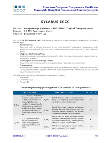 European Computer Competence Certificate Europejski Certyfikat Kompetencji Informatycznych SYLABUS ECCC Ob sza r : Ko m petencje Cy fr o w e - D IG CO MP ( D igital Co m petenc es) M o d u ł: D C M3 Tw o rz enie treści Po zio m: Z aaw anso w any (C) W module DC M3 Tworzenie treści podstawowe kompetencje są weryfikowane w następujących obszarach tematycznych: 1. Tworzenie treści. Tworzenie treści w różnych formatach, w tym multimedialnych, edytowanie i poprawianie treści stworzonych samodzielnie lub przez innych, twórcze wyrażanie siebie przez media i technologie cyfrowe. 2. Integracja i przetwarzanie treści. 3. Przestrzeganie prawa autorskiego i licencji. 4. Programowanie. Zmienianie, przewarzanie i łączenie istniejących treści w celu stworzenia nowego, oryginalnego i relewantnego przekazu. Rozumienie, jakie jest zastosowanie prawa autorskiego i licencji do informacji i treści. Wprowadzanie ustawień, programowanie zmian, programowanie aplikacji, tworzenie oprogramowania, programowanie urządzeń, rozumienie zasad programowania, rozumienie, co kryje się pod pojęciem programowania. Weryfikacja kompetencji jest realizowana w następujących grupach: 1. Wiedza (W). 2. Umiejętności (U). 3. Postawa (P). Zakres weryfikowany przez egzamin ECCC modułu DC M3 (poziom C) CEL KSZTAŁCENIA C_CK1 C_CK2 EFEKT KSZTAŁCENIA (3.1) Zdobycie umiejętności tworzenia treści cyfrowych C_EK1 w różnych formatach, na różnych platformach i w różnych środowiskach. Opanowanie umiejętności w zakresie wykorzystywania różnych narzędzi cyC_EK2 frowych do tworzenia treści. (3.2) Zdobycie umiejętności w zakresie tworzenia nowych poprzez łączenie już istniejących treści. SDCM3Cv1.0 W U Potrafi tworzyć treści w różnych formatach, w co najmniej dwóch programach na dwóch różnych platformach.  Potrafi korzystać z aparatu cyfrowego, kamery, kamerki internetowej oraz stosownego oprogramowania do wytworzenia oryginalnych treści cyfrowych.  C_EK3 Potrafi tworzyć nowe dokumenty multimedialne poprzez połączenie już istniejących treści tekstowych, tabelarycznych, obrazów, nagrań audio i wideo.  C_EK4 Potrafi stworzyć większy obraz z istniejących mniejszych lub ich części.  © 2016 ECCC Foundation P 1/2 European Computer Competence Certificate Europejski Certyfikat Kompetencji Informatycznych CEL KSZTAŁCENIA C_CK3 C_CK3 (3.3) Zdobycie wiedzy na temat wpływu rodzaju licencji na używane i tworzone informacje oraz zasoby. (3.4) Zdobycie umiejętności w zakresie pracy na otwartym oprogramowaniu - wprowadzanie zmian, modyfikacja, tworzenie kodu źródłowego. EFEKT KSZTAŁCENIA W C_EK5 Potrafi stworzyć nowe nagranie audio z już istniejących - całych lub wybranych ich fragmentów. C_EK6 Rozumie różnice pomiędzy licencjami i ich wpływem na treści cyfrowe. C_EK7 Zna zasady wykorzystania licencjonowanych treści.  C_EK8 Wie, co to jest source code (kod źródłowy) i zna zasady jego modyfikacji.  C_EK9 Potrafi pobrać, zmienić (w tym napisać własny) i skompilować otwarty kod źródłowy w dwóch językach programowania. U P    Oznaczenia podane w nawiasach przy celach kształcenia np.: (1.1) stanowią odniesienie do nazwy kompetencji podanej w Załączniku nr 2: Standard wymagań dla kompetencji cyfrowych realizowanych w ramach projektów w PI 10(iii) wytycznych w zakresie realizacji przedsięwzięć z udziałem środków Europejskiego Funduszu Społecznego w obszarze edukacji na lata 2014-2020, opublikowanych 2 czerwca 2015 roku przez Ministra Infrastruktury i Rozwoju (syg. MIiR 2014-2020/19(01)/06/2015). Umiejętności praktyczne, weryfikowane przez egzamin ECCC DC M3, dotyczą:        Stanowiska komputerowego klasy PC/laptop wyposażonego w aparat cyfrowy z funkcją kamery internetowej , mikrofon, głośniki/słuchawki oraz z dostępem do Internetu o przepustowości minimum 2 Mb. Systemu operacyjnego: MS Windows 7 lub nowszego z zainstalowanymi aplikacjami: Notatnik, WordPad, Rejestrator dźwięku, Paint, Windows Move Maker. Przeglądarki Mozilla Firefox 12 / Google Chrome 18 / Internet Explorer 11 lub nowszych. Pakietu biurowego MS Office 2007 wyższy (MS Word, MS Excel, MS PowerPoint). Programu Adobe Reader. Programu Notepad++. Środowiska programistycznego DevC++. SDCM3Cv1.0 © 2016 ECCC Foundation 2/2