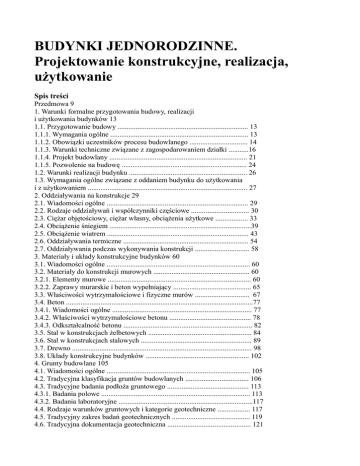 BUDYNKI JEDNORODZINNE. Projektowanie konstrukcyjne, realizacja, użytkowanie Spis treści Przedmowa 9 1. Warunki formalne przygotowania budowy, realizacji i użytkowania budynków 13 1.1. Przygotowanie budowy ........................................................................ 13 1.1.1. Wymagania ogólne ............................................................................ 13 1.1.2. Obowiązki uczestników procesu budowlanego ................................ 14 1.1.3. Warunki techniczne związane z zagospodarowaniem działki ...........16 1.1.4. Projekt budowlany ............................................................................ 21 1.1.5. Pozwolenie na budowę ..................................................................... 24 1.2. Warunki realizacji budynku ................................................................. 26 1.3. Wymagania ogólne związane z oddaniem budynku do użytkowania i z użytkowaniem ........................................................................................ 27 2. Oddziaływania na konstrukcje 29 2.1. Wiadomości ogólne .............................................................................. 29 2.2. Rodzaje oddziaływań i współczynniki częściowe ................................ 30 2.3. Ciężar objętościowy, ciężar własny, obciążenia użytkowe .................. 33 2.4. Obciążenie śniegiem ..............................................................................39 2.5. Obciążenie wiatrem .............................................................................. 43 2.6. Oddziaływania termiczne ..................................................................... 54 2.7. Oddziaływania podczas wykonywania konstrukcji .............................. 58 3. Materiały i układy konstrukcyjne budynków 60 3.1. Wiadomości ogólne ............................................................................... 60 3.2. Materiały do konstrukcji murowych ..................................................... 60 3.2.1. Elementy murowe ............................................................................... 60 3.2.2. Zaprawy murarskie i beton wypełniający ........................................... 65 3.3. Właściwości wytrzymałościowe i fizyczne murów .............................. 67 3.4. Beton .......................................................................................................77 3.4.1. Wiadomości ogólne ............................................................................. 77 3.4.2. Właściwości wytrzymałościowe betonu ............................................. 78 3.4.3. Odkształcalność betonu ....................................................................... 82 3.5. Stal w konstrukcjach żelbetowych ......................................................... 84 3.6. Stal w konstrukcjach stalowych ............................................................. 89 3.7. Drewno ................................................................................................... 98 3.8. Układy konstrukcyjne budynków ......................................................... 102 4. Grunty budowlane 105 4.1. Wiadomości ogólne ............................................................................... 105 4.2. Tradycyjna klasyfikacja gruntów budowlanych ................................... 106 4.3. Tradycyjne badania podłoża gruntowego ............................................. 113 4.3.1. Badania polowe .................................................................................. 113 4.3.2. Badania laboratoryjne ..........................................................................117 4.4. Rodzaje warunków gruntowych i kategorie geotechniczne .................. 117 4.5. Tradycyjny zakres badań geotechnicznych ........................................... 119 4.6. Tradycyjna dokumentacja geotechniczna .............................................. 121 4.7. Nowe zasady oznaczania, klasyfikowania i geotechnicznych badań gruntów . 124 4.7.1. Oznaczanie i klasyfikowanie gruntów ............................................................124 4.7.2. Badania geotechniczne gruntów ..................................................................... 127 5. Fundamenty budynków 129 5.1. Rodzaje fundamentów i ich charakterystyka ...................................................... 129 5.1.1. Rodzaje fundamentów ..................................................................................... 129 5.1.2. ławy fundamentowe ......................................................................................... 131 5.1.3. Stopy fundamentowe ....................................................................................... 135 5.1.4. Fundamenty rusztowe, płytowe i płytowo-żebrowe ........................................ 138 5.2. Tradycyjne zasady projektowania fundamentów bezpośrednich ........................ 139 5.2.1. Rozkład naprężeń pod fundamentami bezpośrednimi ...................................... 139 5.2.2. Tradycyjne projektowanie fundamentów bezpośrednich ................................. 140 5.3. Nowe zasady projektowania fundamentów bezpośrednich ................................. 159 5.4. Fundamenty przy budynku sąsiednim ................................................................. 175 5.4.1. Wiadomości ogólne .......................................................................................... 175 5.4.2. Fundamenty pośrednie i wykopy pod fundamenty .......................................... 178 6. Ściany murowe w budynkach 181 6. l. Wiadomości ogólne ............................................................................................. 181 6.2. Wymagania ze względu na trwałość konstrukcji murowych .............................. 182 6.3. Wymagania ze względu na ochronę murów przed korozją i ogniem .................. 185 6.4. Rodzaje ścian murowych ..........................