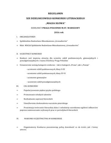 REGULAMIN XIX DZIELNICOWEGO KONKURSU LITERACKIEGO „MAGIA SŁOWA” DZIELNICY PRAGA POŁUDNIE M.ST. WARSZAWY 2016 rok I. ORGANIZATORZY • Spółdzielnia Budowlano-Mieszkaniowa „Grenadierów” • Klub MAGIA Spółdzielni Budowlano-Mieszkaniowej „Grenadierów” II. UCZESTNICY KONKURSU • Konkurs jest imprezą otwartą dla uczniów szkół podstawowych, gimnazjalnych i ponadgimnazjalnych z rejonu Dzielnicy Praga Południe • Ustanowione zostają kategorie wiekowe – tak w kategorii „Proza”, jak i „Poezja” - uczniowie szkół podstawowych, klasy 0-III - uczniowie szkół podstawowych, klasy IV-VI - uczniowie gimnazjów - uczniowie szkół ponadgimnazjalnych III. CEL KONKURSU • Popularyzowanie piękna języka polskiego • Promowanie młodych talentów • Rozbudzanie aspiracji literackich • Umożliwienie doskonalenia warsztatu pisarskiego • IV. • Prezentacja twórczości literackiej dzieci i młodzieży szerokiemu ogółowi odbiorców poprzez zamieszczanie wybranych prac w periodykach literackich WARUNKI UCZESTNICTWA W KONKURSIE Organizatorzy Konkursu pozostawiają pełną dowolność co do treści, jak i formy utworu • Praca powinna być oryginalna, tzn. dotychczas nie publikowana i nie nagradzana • Prace należy składać wyłącznie w wersji papierowej (osobiście lub za pośrednictwem poczty) w dwóch egzemplarzach • Każda praca konkursowa musi być podpisana imieniem i nazwiskiem. Do każdej pracy musi być załączona Karta Uczestnika (do pobrania ze strony www.sbmgrenadierow.com.pl) • Maksymalna objętość pracy nie może przekraczać pięciu stron znormalizowanego maszynopisu (przy zachowaniu 3,5cm marginesu z lewej strony i wielkości czcionki : 12 – dotyczy prozy) • Jeden autor może nadesłać tylko jeden a w przypadku poezji - maksymalnie 3 utwory. • utwór prozą, Termin składania prac upływa 24 października 2016 roku V. OCENA I NAGRODY • Prace ocenia Jury powołane przez Organizatorów • Jury oceniając prace, będzie brało pod uwagę następujące kryteria: - oryginalność utworu - treść i formę utworu - kulturę słowa - ogólny poziom i wyraz artystyczny • Jury przyzna autorom najlepszych prac nagrody i wyróżnienia • O wynikach poinformujemy mailem. Wyniki zamieszczone będą również na stronie www.sbm-grenadierow.com.pl • O terminie uroczystego wręczenia dyplomów, nagród i wyróżnień poinformujemy oddzielnie. VI. PRZEPISY ORGANIZACYJNE. • Prace należy składać/przesłać do dnia 24 października 2016 roku. osobiście/listownie. • Organizatorzy zastrzegają sobie prawo publikacji całości lub części nadesłanych prac w formie książkowej (bez uwzględnienia honorariów) • Sprawy nie ujęte w Regulaminie rozstrzygają Organizatorzy w porozumieniu z Jury UWAGA! Prosimy wypełniać Karty zgłoszeniowe w sposób czytelny, nie budzący wątpliwości. Prosimy pamiętać o podstemplowaniu Karty Uczestnika pieczątką Szkoły, oraz podania imienia ,nazwiska, klasy, szkoły i telefonu lub emaila autora na pierwszej stronie prac konkursowych.