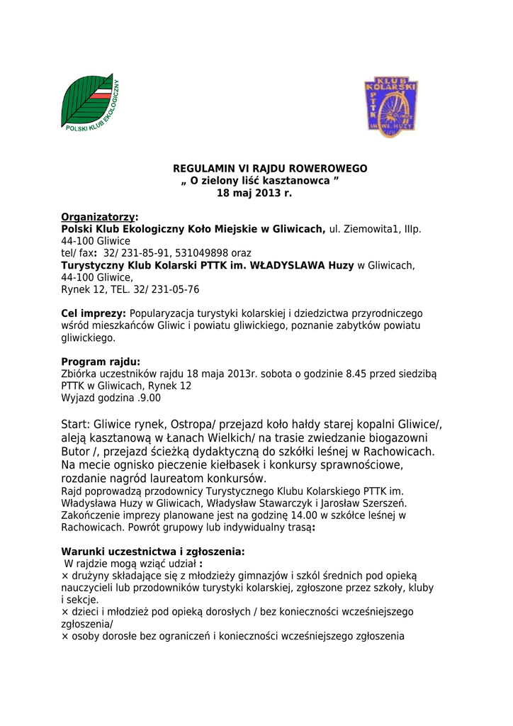 REGULAMIN VI RAJDU ROWEROWEGO „ O zielony liść kasztanowca ” 18 maj 2013 r. Organizatorzy: Polski Klub Ekologiczny Koło Miejskie w Gliwicach, ul. Ziemowita1, IIIp. 44-100 Gliwice tel/ fax: 32/ 231-85-91, 531049898 oraz Turystyczny Klub Kolarski PTTK im. WŁADYSLAWA Huzy w Gliwicach, 44-100 Gliwice, Rynek 12, TEL. 32/ 231-05-76 Cel imprezy: Popularyzacja turystyki kolarskiej i dziedzictwa przyrodniczego wśród mieszkańców Gliwic i powiatu gliwickiego, poznanie zabytków powiatu gliwickiego. Program rajdu: Zbiórka uczestników rajdu 18 maja 2013r. sobota o godzinie 8.45 przed siedzibą PTTK w Gliwicach, Rynek 12 Wyjazd godzina .9.00 Start: Gliwice rynek, Ostropa/ przejazd koło hałdy starej kopalni Gliwice/, aleją kasztanową w Łanach Wielkich/ na trasie zwiedzanie biogazowni Butor /, przejazd ścieżką dydaktyczną do szkółki leśnej w Rachowicach. Na mecie ognisko pieczenie kiełbasek i konkursy sprawnościowe, rozdanie nagród laureatom konkursów. Rajd poprowadzą przodownicy Turystycznego Klubu Kolarskiego PTTK im. Władysława Huzy w Gliwicach, Władysław Stawarczyk i Jarosław Szerszeń. Zakończenie imprezy planowane jest na godzinę 14.00 w szkółce leśnej w Rachowicach. Powrót grupowy lub indywidualny trasą: Warunki uczestnictwa i zgłoszenia: W rajdzie mogą wziąć udział : × drużyny składające się z młodzieży gimnazjów i szkól średnich pod opieką nauczycieli lub przodowników turystyki kolarskiej, zgłoszone przez szkoły, kluby i sekcje. × dzieci i młodzież pod opieką dorosłych / bez konieczności wcześniejszego zgłoszenia/ × osoby dorosłe bez ograniczeń i konieczności wcześniejszego zgłoszenia W zgłoszeniu należy podać: Nazwę i adres organizacji zgłaszającej, imię i nazwisko oraz adres kierownika drużyny, imienny wykaz uczestników. Zgłoszenia będą przyjmowane na adres [email protected] w terminie do 17 maja br. Patronat Honorowy: Starosta Gliwicki Michał Nieszporek Rajd zorganizowano przy wsparciu finansowym Nadleśnictwa Rudziniec.