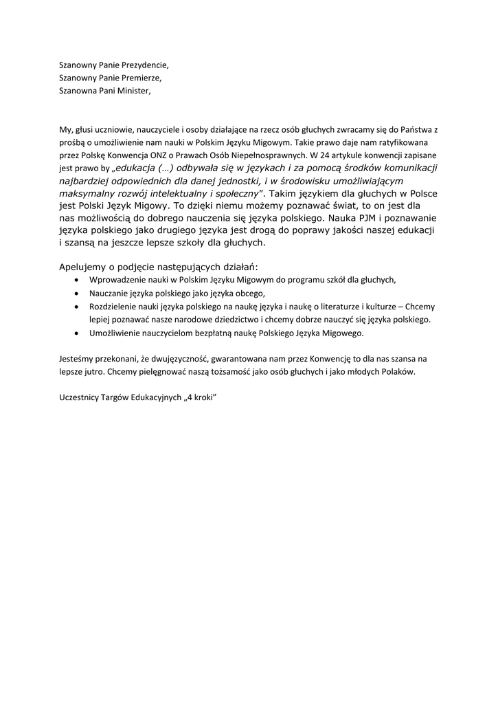 Szanowny Panie Prezydencie, Szanowny Panie Premierze, Szanowna Pani Minister, My, głusi uczniowie, nauczyciele i osoby działające na rzecz osób głuchych zwracamy się do Państwa z prośbą o umożliwienie nam nauki w Polskim Języku Migowym. Takie prawo daje nam ratyfikowana przez Polskę Konwencja ONZ o Prawach Osób Niepełnosprawnych. W 24 artykule konwencji zapisane jest prawo by „edukacja (…) odbywała się w językach i za pomocą środków komunikacji najbardziej odpowiednich dla danej jednostki, i w środowisku umożliwiającym maksymalny rozwój intelektualny i społeczny”. Takim językiem dla głuchych w Polsce jest Polski Język Migowy. To dzięki niemu możemy poznawać świat, to on jest dla nas możliwością do dobrego nauczenia się języka polskiego. Nauka PJM i poznawanie języka polskiego jako drugiego języka jest drogą do poprawy jakości naszej edukacji i szansą na jeszcze lepsze szkoły dla głuchych. Apelujemy o podjęcie następujących działań: Wprowadzenie nauki w Polskim Języku Migowym do programu szkół dla głuchych, Nauczanie języka polskiego jako języka obcego, Rozdzielenie nauki języka polskiego na naukę języka i naukę o literaturze i kulturze – Chcemy lepiej poznawać nasze narodowe dziedzictwo i chcemy dobrze nauczyć się języka polskiego. Umożliwienie nauczycielom bezpłatną naukę Polskiego Języka Migowego. Jesteśmy przekonani, że dwujęzyczność, gwarantowana nam przez Konwencję to dla nas szansa na lepsze jutro. Chcemy pielęgnować naszą tożsamość jako osób głuchych i jako młodych Polaków. Uczestnicy Targów Edukacyjnych „4 kroki”