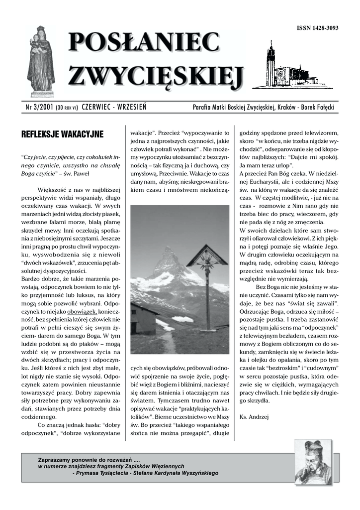 ISSN 1428-3093 Nr 3/2001 (30 ROK VI ) CZERWIEC - WRZESIEŃ REFLEKSJE WAKACYJNE “Czy jecie, czy pijecie, czy cokolwiek innego czynicie, wszystko na chwałę Boga czyńcie” – św. Paweł Większość z nas w najbliższej perspektywie widzi wspaniały, długo oczekiwany czas wakacji. W swych marzeniach jedni widzą złocisty piasek, wezbrane falami morze, białą plamę skrzydeł mewy. Inni oczekują spotkania z niebosiężnymi szczytami. Jeszcze inni pragną po prostu chwil wypoczynku, wyswobodzenia się z niewoli “dwóch wskazówek”, zrzucenia pęt absolutnej dyspozycyjności. Bardzo dobrze, że takie marzenia powstają, odpoczynek bowiem to nie tylko przyjemność lub luksus, na któr y mogą sobie pozwolić wybrani. Odpoczynek to niejako obowiązek, konieczność, bez spełnienia której człowiek nie potrafi w pełni cieszyć się swym życiem- darem do samego Boga. W tym ludzie podobni są do ptaków – mogą wzbić się w przestworza życia na dwóch skrzydłach; pracy i odpoczynku. Jeśli któreś z nich jest zbyt małe, lot nigdy nie stanie się wysoki. Odpoczynek zatem powinien nieustannie towarzyszyć pracy. Dobry zapewnia siły potrzebne przy wykonywaniu zadań, stawianych przez potrzeby dnia codziennego. Co znaczą jednak hasła: “dobry odpoczynek”, “dobrze wykorzystane Parafia Matki Boskiej Zwycięskiej, Kraków - Borek Fałęcki wakacje”. Przecież “wypoczywanie to jedna z najprostszych czynności, jakie człowiek potrafi wykonać” . Nie możemy wypoczynku utożsamiać z bezczynnością – tak fizyczną ja i duchową, czy umysłową. Przeciwnie. Wakacje to czas dany nam, abyśmy, nieskrępowani brakiem czasu i mnóstwem niekończą- cych się obowiązków, próbowali odnowić spojrzenie na swoje życie, pogłębić więź z Bogiem i bliźnimi, nacieszyć się darem istnienia i otaczającym nas światem. Tymczasem trudno nawet opisywać wakacje “praktykujących katolików”. Bierne uczestnictwo we Mszy św. Bo przecież “takiego wspaniałego słońca nie można przegapić”, długie Zapraszamy ponownie do rozważań .... w numerze znajdziesz fragmenty Zapisków Więziennych - Prymasa Tysiąclecia - Stefana Kardynała Wyszyńskiego godziny spędzone przed telewizorem, skoro “w końcu, nie trzeba nigdzie wychodzić”, odseparowanie się od kłopotów najbliższych: “Dajcie mi spokój. Ja mam teraz urlop”. A przecież Pan Bóg czeka. W niedzielnej Eucharystii, ale i codziennej Mszy św. na którą w wakacje da się znaleźć czas. W częstej modlitwie, - już nie na czas - rozmowie z Nim rano gdy nie trzeba biec do pracy, wieczorem, gdy nie pada się z nóg ze zmęczenia. W swoich dziełach które sam stworzył i ofiarował człowiekowi. Z ich piękna i potęgi poznaje się właśnie Jego. W drugim człowieku oczekującym na mądrą radę, odrobinę czasu, którego przecież wskazówki teraz tak bezwzględnie nie wymierzają. Bez Boga nic nie jesteśmy w stanie uczynić. Czasami tylko się nam wydaje, że bez nas “świat się zawali”. Odrzucając Boga, odrzuca się miłość – pozostaje pustka. I trzeba zastanowić się nad tym jaki sens ma “odpoczynek” z telewizyjnym bezładem, czasem rozmowy z Bogiem obliczonym co do sekundy, zamknięciu się w świecie leżaka i olejku do opalania, skoro po tym czasie tak “beztroskim” i “cudownym” w sercu pozostaje pustka, która odezwie się w ciężkich, wymagających pracy chwilach. I nie będzie siły drugiego skrzydła. Ks. Andrzej KOBIETY I ICH POWOŁANIE ANNA I ELŻBIETA Większość kobiet Bóg powołuje do stanu małżeńskiego, do tego, aby były żoną i matką. Są rodziny mające liczne potomstwo, ale są i takie, gdzie bezpłodność kobiety nie pozwala na poczęcie dziecka. Mają wtedy poczucie pustki, niespełnienia, często tracą wiarę, ufność i często w takich sytuacjach maja pretensje do Boga. W księgach Biblii przedstawiono dwie kobiety, Annę i Elżbietę, które są dowodem, że dzięki naszej miłość do Boga, zmaganiu się z cierpieniem, szczerej modlitwie, możemy uzyskać od Boga łaski, o które prosimy. ANNA to postać kobiety ze Starego Testamentu. Mieszkała w górskiej okolicy Efraima, z mężem imieniem Elkana. Miał on dwie żony, Annę i Peninnę (co często zdarzało się w tamtych czasach). Peninne Bóg obdarzył potomstwem, Anna natomiast nie miała dzieci. Brak potomka był źródłem wielkiego cierpienia, a także szyderstw ze strony innych, gdyż bezpłodność u Izraelitów uchodziła za karę bożą i hańbę. Jak był w zwyczaju co roku cała rodzina chodziła do miejscowości Szilo, by modlić się i składać ofiar y Bogu. Peninna szła ze swoimi dziećmi, pełna pychy i zadowolenia, Anna zaś szła smutna i zatroskana, ze łzami w oczach. Elkana bardziej kochał Annę i pocieszał ją słowami: “Anno, czemu płaczesz? (...) Czemu się twoje serce smuci? Czyż ja nie znaczę dla ciebie więcej niż dziesięciu synów? (1Sm1,8). Co roku udając się do Szilo Anna nie bała się szczerej rozmowy z Bogiem na modlitwie. Dzieliła się z nim uczuciem zawodu jakiego doznała z powodu swojej bezpłodności, uczuciem pustki w swym życiu i prosiła o pomoc w swym utrapieniu. Tr wając na gorącej modlitwie obiecała Bogu, że jeśli spełni jej prośbę i obdarzy ją synem, ona ofiaruje go na wyłączną służbę Bogu. Bóg wysłuchał jej modlitwy i obdarzył ją potomstwem. Urodziła syna, którego nazwała Samuel, co znaczy “darowany przez Boga”. W pięknej modlitwie wdzięczności i uwielbienia Anna dziękowała Bogu za narodziny syna. Przekonała się, że dobrze jest zaufać Bogu. Po kilku latach wypełniła swoją obietnicę i oddała go na służbę Bogu. Jej modlitwa wypływająca z udręczonego serca pomogła w urzeczywistnieniu się planów Boga dla całego Izraela. Samuel stał się wielkim prorokiem i sędziom, któr y przeprowadził przez trudny okres lud Izraela i doprowadził do jego zjednoczenia. ELŻBIETA jest kobietą pr