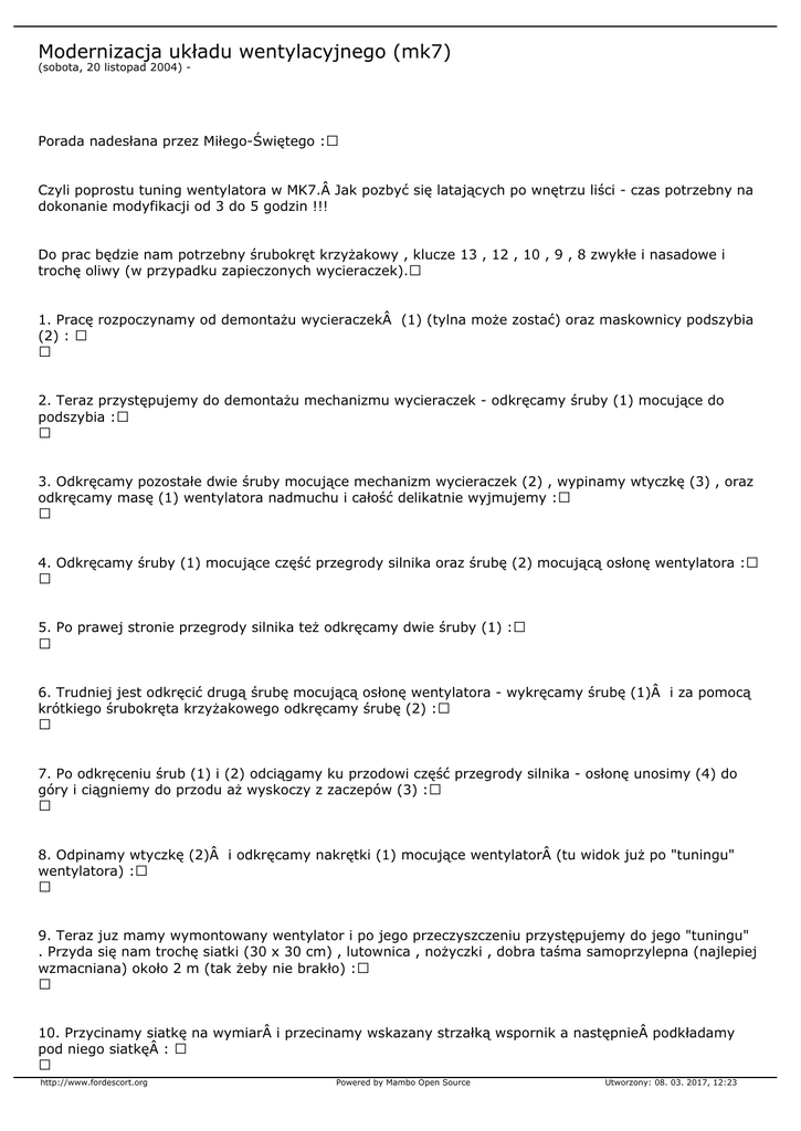 Modernizacja układu wentylacyjnego (mk7) (sobota, 20 listopad 2004) - Porada nadesłana przez Miłego-Świętego : Czyli poprostu tuning wentylatora w MK7. Jak pozbyć się latających po wnętrzu liści - czas potrzebny na dokonanie modyfikacji od 3 do 5 godzin !!! Do prac będzie nam potrzebny śrubokręt krzyżakowy , klucze 13 , 12 , 10 , 9 , 8 zwykłe i nasadowe i trochę oliwy (w przypadku zapieczonych wycieraczek). 1. Pracę rozpoczynamy od demontażu wycieraczek (1) (tylna może zostać) oraz maskownicy podszybia (2) : 2. Teraz przystępujemy do demontażu mechanizmu wycieraczek - odkręcamy śruby (1) mocujące do podszybia : 3. Odkręcamy pozostałe dwie śruby mocujące mechanizm wycieraczek (2) , wypinamy wtyczkę (3) , oraz odkręcamy masę (1) wentylatora nadmuchu i całość delikatnie wyjmujemy : 4. Odkręcamy śruby (1) mocujące część przegrody silnika oraz śrubę (2) mocującą osłonę wentylatora : 5. Po prawej stronie przegrody silnika też odkręcamy dwie śruby (1) : 6. Trudniej jest odkręcić drugą śrubę mocującą osłonę wentylatora - wykręcamy śrubę (1) i za pomocą krótkiego śrubokręta krzyżakowego odkręcamy śrubę (2) : 7. Po odkręceniu śrub (1) i (2) odciągamy ku przodowi część przegrody silnika - osłonę unosimy (4) do góry i ciągniemy do przodu aż wyskoczy z zaczepów (3) : 8. Odpinamy wtyczkę (2) i odkręcamy nakrętki (1) mocujące wentylator (tu widok już po "tuningu" wentylatora) : 9. Teraz juz mamy wymontowany wentylator i po jego przeczyszczeniu przystępujemy do jego "tuningu" . Przyda się nam trochę siatki (30 x 30 cm) , lutownica , nożyczki , dobra taśma samoprzylepna (najlepiej wzmacniana) około 2 m (tak żeby nie brakło) : 10. Przycinamy siatkę na wymiar i przecinamy wskazany strzałką wspornik a następnie podkładamy pod niego siatkę : http://www.fordescort.org Powered by Mambo Open Source Utworzony: 08. 03. 2017, 12:23 11. Dobrze rozgrzaną lutownicą (może być transformatorówka) nadtapiamy siatkę i obudowę wentylatora ( niewielkim ruchem w kierunku zasłanianego otworu) : 12. Należy pamiętać o wytopieniu w siatce małego otworu na przewód masowy wentylatora : 13. Dokładnie dookoła stapiamy siatkę - najlepiej w odstępach około 5 mm : 14. Przystępujemy do oklejenia przymocowanej siatki , dodatkowo wzmocni mocowanie siatki : 15. Po oklejeniu siatki (1) wycinamy lutownicą otwór na wtyczkę (2) , wymiar około 2 x 2 cm : 16. Teraz osłaniamy boczne otwory , tu wycinamy kawałek siatki i za pomocą lutownicy zgrzewamy go z obudową wentylatora - nadmiar siatki obcinamy za pomocą rozgrzanego grota lutownicy : 17. Zgrzaną siatkę oklejamy taśmą , najlepiej krótkimi paskami : 18. Poddany takiemu "tuningowi" wentylator montujemy ponownie w samochodzie i całość składamy do kupy , oczywiście w odwrotnej kolejności . Autor : Miły-Święty http://www.fordescort.org Powered by Mambo Open Source Utworzony: 08. 03. 2017, 12:23
