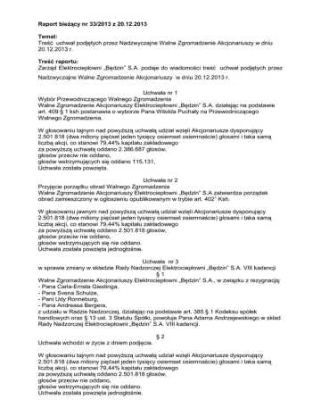 Raport bieżący nr 33/2013 z 20.12.2013 Temat: Treść uchwał podjętych przez Nadzwyczajne Walne Zgromadzenie Akcjonariuszy w dniu 20.12.2013 r. Treść raportu: Zarząd Elektrociepłowni „Będzin” S.A. podaje do wiadomości treść uchwał podjętych przez Nadzwyczajne Walne Zgromadzenie Akcjonariuszy w dniu 20.12.2013 r. Uchwała nr 1 Wybór Przewodniczącego Walnego Zgromadzenia Walne Zgromadzenie Akcjonariuszy Elektrociepłowni „Będzin” S.A. działając na podstawie art. 409 § 1 ksh postanawia o wyborze Pana Witolda Puchały na Przewodniczącego Walnego Zgromadzenia. W głosowaniu tajnym nad powyższą uchwałą udział wzięli Akcjonariusze dysponujący 2.501 818 (dwa miliony pięćset jeden tysięcy osiemset osiemnaście) głosami i taka samą liczbą akcji, co stanowi 79,44% kapitału zakładowego za powyższą uchwałą oddano 2.386.687 głosów, głosów przeciw nie oddano, głosów wstrzymujących się oddano 115.131, Uchwała została powzięta. Uchwała nr 2 Przyjęcie porządku obrad Walnego Zgromadzenia Walne Zgromadzenie Akcjonariuszy Elektrociepłowni „Będzin” S.A zatwierdza porządek obrad zamieszczony w ogłoszeniu opublikowanym w trybie art. 4021 Ksh. W głosowaniu jawnym nad powyższą uchwałą udział wzięli Akcjonariusze dysponujący 2.501.818 (dwa miliony pięćset jeden tysięcy osiemset osiemnaście) głosami i taka samą liczbą akcji, co stanowi 79,44% kapitału zakładowego za powyższą uchwałą oddano 2.501.818 głosów, głosów przeciw nie oddano, głosów wstrzymujących się nie oddano. Uchwała została powzięta jednogłośnie. Uchwała nr 3 w sprawie zmiany w składzie Rady Nadzorczej Elektrociepłowni „Będzin” S.A. VIII kadencji §1 Walne Zgromadzenie Akcjonariuszy Elektrociepłowni „Będzin” S.A., w związku z rezygnacją: - Pana Carla-Ernsta Giestinga, - Pana Svena Schulze, - Pani Udy Ronneburg, - Pana Andreasa Bergera, z udziału w Radzie Nadzorczej, działając na podstawie art. 385 § 1 Kodeksu spółek handlowych oraz § 13 ust. 3 Statutu Spółki, powołuje Pana Adama Andrzejewskiego w skład Rady Nadzorczej Elektrociepłowni „Będzin” S.A. VIII kadencji. §2 Uchwała wchodzi w życie z dniem podjęcia. W głosowaniu tajnym nad powyższą uchwałą udział wzięli Akcjonariusze dysponujący 2.501.818 (dwa miliony pięćset jeden tysięcy osiemset osiemnaście) głosami i taka samą liczbą akcji, co stanowi 79,44% kapitału zakładowego za powyższą uchwałą oddano 2.501.818 głosów, głosów przeciw nie oddano, głosów wstrzymujących się nie oddano. Uchwała została powzięta jednogłośnie. Uchwała nr 4 w sprawie zmiany w składzie Rady Nadzorczej Elektrociepłowni „Będzin” S.A. VIII kadencji §1 Walne Zgromadzenie Akcjonariuszy Elektrociepłowni „Będzin” S.A., w związku z rezygnacją: - Pana Carla-Ernsta Giestinga, - Pana Svena Schulze, - Pani Udy Ronneburg, - Pana Andreasa Bergera, z udziału w Radzie Nadzorczej, działając na podstawie art. 385 § 1 Kodeksu spółek handlowych oraz § 13 ust. 3 Statutu Spółki, powołuje Pana Wiesława Glanowskiego w skład Rady Nadzorczej Elektrociepłowni „Będzin” S.A. VIII kadencji. §2 Uchwała wchodzi w życie z dniem podjęcia. W głosowaniu tajnym nad powyższą uchwałą udział wzięli Akcjonariusze dysponujący 2.501.818 (dwa miliony pięćset jeden tysięcy osiemset osiemnaście) głosami i taka samą liczbą akcji, co stanowi 79,44% kapitału zakładowego za powyższą uchwałą oddano 2.501.818 głosów, głosów przeciw nie oddano, głosów wstrzymujących się nie oddano. Uchwała została powzięta jednogłośnie. Uchwała nr 5 w sprawie zmiany w składzie Rady Nadzorczej Elektrociepłowni „Będzin” S.A. VIII kadencji §1 Walne Zgromadzenie Akcjonariuszy Elektrociepłowni „Będzin” S.A., w związku z rezygnacją: - Pana Carla-Ernsta Giestinga, - Pana Svena Schulze, - Pani Udy Ronneburg, - Pana Andreasa Bergera, z udziału w Radzie Nadzorczej, działając na podstawie art. 385 § 1 Kodeksu spółek handlowych oraz § 13 ust. 3 Statutu Spółki, powołuje Pana Janusza Niedźwieckiego, w skład Rady Nadzorczej Elektrociepłowni „Będzin” S.A. VIII kadencji. §2 Uchwała wchodzi w życie z dniem podjęcia. W głosowaniu tajnym nad powyższą uchwałą udział wzięli Akcjonariusze dysponujący 2.501.818 (dwa miliony pięćset jeden tysięcy osiemset osiemnaście) głosami i taka samą liczbą akcji, co stanowi 79,44% kapitału zakładowego za powyższą uchwałą oddano 2.501.818 głosów, głosów przeciw nie oddano, głosów wstrzymujących się nie oddano Uchwała została powzięta jednogłośnie. Uchwała nr 6 w sprawie zmiany w składzie Rady Nadzorczej Elektrociepłowni „Będzin” S.A. VIII kadencji §1 Walne Zgromadzenie Akcjonariuszy Elektrociepłowni „Będzin” S.A., w związku z rezygnacją: - Pana Carla-Ernsta Giestinga, - Pana Svena Schulze, - Pani Udy Ronneburg, - Pana Andreasa Bergera, z udziału w Radzie Nadzorczej, działając na podstawie art. 385 § 1 Kodeksu spółek handlowych oraz § 13 ust. 3 Statutu Spółki, powołuje Pana Waldemara Organistę, w skład Rady Nadzorczej Elektrociepłowni „Będzin” S.A. VIII kadencji. §2 Uchwała wchodzi w życie z dniem podjęcia. W głosowaniu tajnym nad powyższą uchwałą udział wzięli Akcjonariusze dysponujący 2.501.818 (dwa miliony pięćset jeden tysięcy osiemset osiemnaście) głosami i taka samą liczbą akcji, co stanowi 79,44% kapitału zakładowego za powyższą uchwałą oddano 2.501.818 głosów, głosów przeciw nie oddano, głosów wstrzymujących się nie oddano. Uchwała została powzięta jednogłośnie. Podstawa prawna: Rozporządzenie Ministra Finansów z dnia 19 lutego 2009 r. w sprawie informacji bieżących i okresowych przekazywanych przez emitentów papierów wartościowych §38 ust. 1, pkt. 7 §100 ust. 8 Podpisy: Sabina Apel – Członek Zarządu Józef Kijak – Prokurent