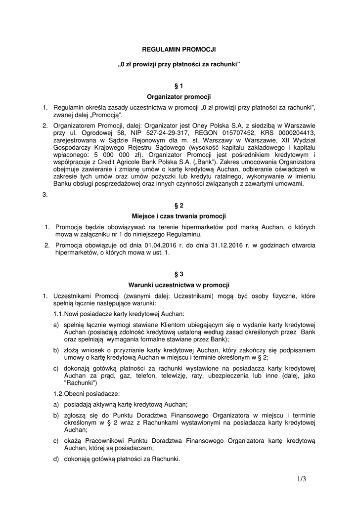 REGULAMIN PROMOCJI „0 zł prowizji przy płatności za rachunki” §1 Organizator promocji 1. Regulamin określa zasady uczestnictwa w promocji „0 zł prowizji przy płatności za rachunki”, zwanej dalej „Promocją”. 2. Organizatorem Promocji, dalej: Organizator jest Oney Polska S.A. z siedzibą w Warszawie przy ul. Ogrodowej 58, NIP 527-24-29-317, REGON 015707452, KRS 0000204413, zarejestrowana w Sądzie Rejonowym dla m. st. Warszawy w Warszawie, XII Wydział Gospodarczy Krajowego Rejestru Sądowego (wysokość kapitału zakładowego i kapitału wpłaconego: 5 000 000 zł). Organizator Promocji jest pośrednikiem kredytowym i współpracuje z Credit Agricole Bank Polska S.A. („Bank”). Zakres umocowania Organizatora obejmuje zawieranie i zmianę umów o kartę kredytową Auchan, odbieranie oświadczeń w zakresie tych umów oraz umów pożyczki lub kredytu ratalnego, wykonywanie w imieniu Banku obsługi posprzedażowej oraz innych czynności związanych z zawartymi umowami. 3. §2 Miejsce i czas trwania promocji 1. Promocja będzie obowiązywać na terenie hipermarketów pod marką Auchan, o których mowa w załączniku nr 1 do niniejszego Regulaminu. 2. Promocja obowiązuje od dnia 01.04.2016 r. do dnia 31.12.2016 r. w godzinach otwarcia hipermarketów, o których mowa w ust. 1. §3 Warunki uczestnictwa w promocji 1. Uczestnikami Promocji (zwanymi dalej: Uczestnikami) mogą być osoby fizyczne, które spełnią łącznie następujące warunki: 1.1. Nowi posiadacze karty kredytowej Auchan: a) spełnią łącznie wymogi stawiane Klientom ubiegającym się o wydanie karty kredytowej Auchan (posiadają zdolność kredytową ustaloną według zasad określonych przez Bank oraz spełniają wymagania formalne stawiane przez Bank); b) złożą wniosek o przyznanie karty kredytowej Auchan, który zakończy się podpisaniem umowy o kartę kredytową Auchan w miejscu i terminie określonym w § 2; c) dokonają gotówką płatności za rachunki wystawione na posiadacza karty kredytowej Auchan za prąd, gaz, telefon, telewizję, raty, ubezpieczenia lub inne (dalej, jako "Rachunki") 1.2. Obecni posiadacze: a) posiadają aktywną kartę kredytową Auchan; b) zgłoszą się do Punktu Doradztwa Finansowego Organizatora w miejscu i terminie określonym w § 2 wraz z Rachunkami wystawionymi na posiadacza karty kredytowej Auchan; c) okażą Pracownikowi Punktu Doradztwa Finansowego Organizatora kartę kredytową Auchan, której są posiadaczem; d) dokonają gotówką płatności za Rachunki. 1/3 2. Uczestnikiem Promocji nie może być pracownik zatrudniony u Organizatora Promocji na podstawie umowy o pracę lub stosunku cywilnoprawnego. §4 Zasady Promocji 1. Promocja polega na nienaliczeniu Uczestnikowi przez Organizatora prowizji za płatności za Rachunki po spełnieniu warunków opisanych w § 3 ust. 1.1 lub ust. 1.2 oraz zgodnie z zasadami określonymi w niniejszym Regulaminie. 2. Usługę płatności za Rachunki świadczy BillBird S.A. – instytucja płatnicza wpisana przez KNF do rejestru usług płatniczych (nr IP2/2012) we współpracy z Organizatorem. 3. Promocja łączy się z innymi ofertami promocyjnymi Organizatora. §5 Tryb składania i rozpatrywania reklamacji 1. Każdemu Uczestnikowi przysługuje prawo do wniesienia reklamacji w zakresie niezgodności przeprowadzenia promocji z niniejszym Regulaminem. 2. Reklamacja powinna zostać złożona w jeden z następujących sposobów 2.1 ustnie: a. osobiście w dowolnym Punkcie Doradztwa Finansowego Organizatora lub b. złożona za pośrednictwem Serwisu Telefonicznego Oney 2.2 w formie pisemnej: a. wysłana pocztą na adres Banku do doręczeń i korespondencji, to jest: Oney Polska S.A., ul. Ogrodowa 58, 00-876 Warszawa, z dopiskiem „0 zł prowizji przy płatności za rachunki” lub b. złożona osobiście Organizatora w dowolnym Punkcie Doradztwa Finansowego 2.3 w formie elektronicznej: a. złożona poprzez formularz kontaktowy znajdujący się na stronie internetowej www.oney.com.pl 3 Złożona reklamacja, wraz z opisem przyczyn reklamacji, powinna być opatrzona czytelnym podpisem Uczestnika (w przypadku formy pisemnej) i zawierać dane umożliwiające jednoznaczną identyfikację Uczestnika. W treści reklamacji należy podać imię i nazwisko oraz adres do korespondencji. 4 Do reklamacji wymagających złożenia dokumentów, (lub jeśli taki wymóg wynika z powszechnie obowiązujących przepisów prawa) należy dołączyć kopie ewentualnych dokumentów potwierdzających zasadność złożonej reklamacji. 5 Reklamacje będą rozpatrywane niezwłocznie, nie później niż w terminie do 30 dni kalendarzowych (liczonych od daty otrzymania reklamacji) przy uwzględnieniu zasad określonych w niniejszym Regulaminie oraz obowiązujących przepisów prawa. Organizator udziela odpowiedzi w formie pisemnej - listownie na wskazany w reklamacji adres korespondencyjny lub w formie telefonicznej – na wskazany w reklamacji numer telefonu kontaktowego (w tym wysłanie wiadomości SMS w przypadku pozytywnego rozpatrzenia reklamacji). 2/3 6 W przypadku uzasadnionej niemożności udzielenia odpowiedzi w terminie wskazanym w ust. 5 Organizator: a. wyjaśnia przyczyny opóźnienia, b. wskazuje okoliczności, które muszą zostać ustalone, c. wskazuje przewidywany termin udzielenia odpowiedzi, który nie może przekroczyć 60 dni od dnia otrzymania reklamacji. §6 Postanowienia końcowe 1. Dane osobowe Uczestników będą przetwarzane zgodnie z Umową o kartę kredytową Auchan. 2. Udział Uczestnika w promocji oznacza jego akceptację zasad promocji zawartych w niniejszym Regulaminie. 3. Niniejszy Regulamin dostępny jest w Punkcie Doradztwa Finansowego Organizatora, w hipermarketach, o których mowa w § 2 ust. 1. 4. Regulamin usługi VIATM dostępny jest w Punkcie Doradztwa Finansowego Organizatora oraz na www.billbird.pl. 5. W sprawach nieuregulowanych w niniejszym Regulaminie mają zastosowanie Regulamin karty kredytowej Auchan, regula