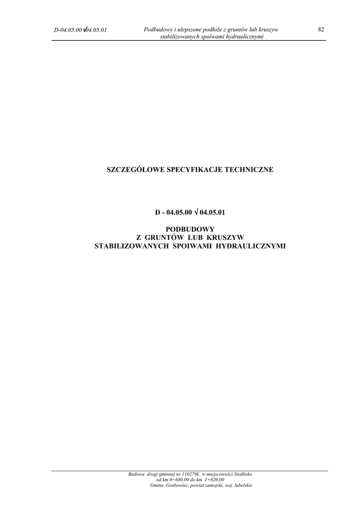 D-04.05.00÷04.05.01 Podbudowy i ulepszone podłoŜe z gruntów lub kruszyw stabilizowanych spoiwami hydraulicznymi 82 SZCZEGÓŁOWE SPECYFIKACJE TECHNICZNE D - 04.05.00 ÷ 04.05.01 PODBUDOWY Z GRUNTÓW LUB KRUSZYW STABILIZOWANYCH SPOIWAMI HYDRAULICZNYMI _________________________________________________________________________________________________________________ Budowa drogi gminnej nr 110279L w miejscowości Siedlisko od km 0+680,00 do km 1+020,00 Gmina Grabowiec, powiat zamojski, woj. lubelskie D-04.05.00÷04.05.01 Podbudowy i ulepszone podłoŜe z gruntów lub kruszyw stabilizowanych spoiwami hydraulicznymi 83 SZCZEGÓŁOWE SPECYFIKACJE TECHNICZNE D-04.05.00 PODBUDOWA Z GRUNTÓW LUB KRUSZYW STABILIZOWANYCH SPOIWAMI HYDRAULICZNYMI. WYMAGANIA OGÓLNE _________________________________________________________________________________________________________________ Budowa drogi gminnej nr 110279L w miejscowości Siedlisko od km 0+680,00 do km 1+020,00 Gmina Grabowiec, powiat zamojski, woj. lubelskie D-04.05.00÷04.05.01 Podbudowy i ulepszone podłoŜe z gruntów lub kruszyw stabilizowanych spoiwami hydraulicznymi 84 1. WSTĘP 1.1. Przedmiot SST Przedmiotem niniejszej szczegółowej specyfikacji technicznej (SST) są wymagania dotyczące wykonania i odbioru robót związanych z wykonywaniem podbudowy z kruszyw stabilizowanych spoiwami hydraulicznymi w związku z budową drogi gminnej nr 110279L w miejscowości Siedlisko Gmina Grabowiec, powiat zamojski, woj. lubelskie 1.2. Zakres stosowania SST Szczegółowa specyfikacja techniczna (SST) jest dokumentem przetargowym i kontraktowym przy zlecaniu i realizacji robót wymienionych w pkt. 1.1. 1.3. Zakres robót objętych SST Ustalenia zawarte w niniejszej specyfikacji dotyczą zasad prowadzenia robót związanych z wykonaniem i odbiorem podbudów z kruszyw stabilizowanych spoiwami hydraulicznymi przy budowie drogi gminnej nr 110279L w miejscowości Siedlisko Gmina Grabowiec, powiat zamojski, woj. lubelskie i obejmują : D-04.05.01 Podbudowa z gruntu lub kruszywa stabilizowanego cementem Podbudowę z gruntów lub kruszyw stabilizowanych spoiwami hydraulicznymi wykonuje się, zgodnie z ustaleniami podanymi w dokumentacji projektowej, jako: − podbudowę zasadniczą, 1.4. Określenia podstawowe Określenia podstawowe są zgodne z obowiązującymi, odpowiednimi polskimi normami oraz z definicjami podanymi w SST D-M-00.00.00 „Wymagania ogólne” pkt 1.4 oraz w SST wymienionych w pkt 1.3, dotyczących poszczególnych rodzajów podbudów z gruntów lub kruszyw stabilizowanych spoiwami hydraulicznymi. 1.5. Ogólne wymagania dotyczące robót Ogólne wymagania dotyczące robót podano w SST D-M-00.00.00 „Wymagania ogólne” pkt 1.5. 2. MATERIAŁY 2.1. Ogólne wymagania dotyczące materiałów Ogólne wymagania dotyczące materiałów, ich pozyskiwania i składowania, podano w SST D-M00.00.00 „Wymagania ogólne” pkt 2. 2.2. Rodzaje materiałów Materiały stosowane podano w SST wymienionych w pkt 1.3, dotyczących poszczególnych rodzajów podbudów z gruntów lub kruszyw stabilizowanych spoiwami hydraulicznymi. 3. SPRZĘT 3.1. Ogólne wymagania dotyczące sprzętu Ogólne wymagania dotyczące sprzętu podano w SST D-M-00.00.00 „Wymagania ogólne” pkt 3. 3.2. Sprzęt do wykonania robót Wykonawca przystępujący do wykonania podbudowy stabilizowanej spoiwami powinien wykazać się moŜliwością korzystania z następującego sprzętu: _________________________________________________________________________________________________________________ Budowa drogi gminnej nr 110279L w miejscowości Siedlisko od km 0+680,00 do km 1+020,00 Gmina Grabowiec, powiat zamojski, woj. lubelskie D-04.05.00÷04.05.01 Podbudowy i ulepszone podłoŜe z gruntów lub kruszyw stabilizowanych spoiwami hydraulicznymi 85 przy wytwarzaniu mieszanek gruntowo-spoiwowych na miejscu: mieszarek jedno lub wielowirnikowych do wymieszania gruntu ze spoiwami, spycharek, równiarek lub sprzętu rolniczego (pługi, brony, kultywatory) do spulchniania gruntu, cięŜkich szablonów do wyprofilowania warstwy, rozsypywarek wyposaŜonych w osłony przeciwpylne i szczeliny o regulowanej szerokości do rozsypywania spoiw, − przewoźnych zbiorników na wodę, wyposaŜonych w urządzenia do równomiernego i kontrolowanego dozowania wody, − walców ogumionych do zagęszczania, − zagęszczarek płytowych, ubijaków mechanicznych lub małych walców wibracyjnych do zagęszczania w miejscach trudnodostępnych. − − − − 4. TRANSPORT 4.1. Ogólne wymagania dotyczące transportu Ogólne wymagania dotyczące transportu podano w SST D-M-00.00.00 „Wymagania ogólne” pkt 4. 4.2. Transport materiałów Transport cementu powinien odbywać się zgodnie z BN-88/6731-08. 5. WYKONANIE ROBÓT 5.1. Ogólne zasady wykonania robót Ogólne zasady wykonania robót podano w SST D-M-00.00.00 „Wymagania ogólne” pkt 5. 5.2. Przygotowanie podłoŜa PodłoŜe gruntowe powinno być przygotowane zgodnie z wymaganiami określonymi w SST D-04.01.01 „Koryto wraz z profilowaniem i zagęszczeniem podłoŜa” i SST D-02.00.00 „Roboty ziemne”. Paliki lub szpilki do prawidłowego ukształtowania podbudowy i ulepszonego podłoŜa powinny być wcześniej przygotowane. Paliki lub szpilki powinny być ustawione w osi drogi i w rzędach równoległych do osi drogi, lub w inny sposób zaakceptowany przez InŜyniera. Rozmieszczenie palików lub szpilek powinno umoŜliwiać naciągnięcie sznurków lub linek do wytyczenia robót w odstępach nie większych niŜ co 10 m. Warstwa kruszywa ze spoiwami hydraulicznymi ma być układana w prowadnicach. Po wytyczeniu podbudowy naleŜy ustawić na podłoŜu prowadnice w taki sposób, aby wyznaczały one ściśle linie krawędzi układanej warstwy według dokumentacji projektowej. Wysokość prowadnic powinna odpowiadać grubości warstwy kruszywa ze spoiwami hydraulicznymi, w stanie niezagęszczonym. Prowadnice powinny być ustawione stabilnie, w sposób