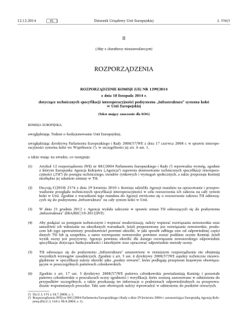 12.12.2014 Dziennik Urzędowy Unii Europejskiej PL L 356/1 II (Akty o charakterze nieustawodawczym) ROZPORZĄDZENIA ROZPORZĄDZENIE KOMISJI (UE) NR 1299/2014 z dnia 18 listopada 2014 r. dotyczące technicznych specyfikacji interoperacyjności podsystemu „Infrastruktura” systemu kolei w Unii Europejskiej (Tekst mający znaczenie dla EOG) KOMISJA EUROPEJSKA, uwzględniając Traktat o funkcjonowaniu Unii Europejskiej, uwzględniając dyrektywę Parlamentu Europejskiego i Rady 2008/57/WE z dnia 17 czerwca 2008 r. w sprawie interope racyjności systemu kolei we Wspólnocie (1), w szczególności jej art. 6 ust. 1, a także mając na uwadze, co następuje: (1) Artykuł 12 rozporządzenia (WE) nr 881/2004 Parlamentu Europejskiego i Rady (2) wprowadza wymóg, zgodnie z którym Europejska Agencja Kolejowa („Agencja”) zapewnia dostosowanie technicznych specyfikacji interopera cyjności („TSI”) do postępu technicznego, trendów rynkowych i wymagań społecznych, a także proponuje Komisji niezbędne jej zdaniem zmiany w TSI. (2) Decyzją C(2010) 2576 z dnia 29 kwietnia 2010 r. Komisja udzieliła Agencji mandatu na opracowanie i przepro wadzenie przeglądu technicznych specyfikacji interoperacyjności w celu rozszerzenia ich zakresu na cały system kolei w Unii. Zgodnie z warunkami tego mandatu do Agencji zwrócono się o rozszerzenie zakresu TSI odnoszą cych się do podsystemu „Infrastruktura” na cały system kolei w Unii. (3) W dniu 21 grudnia 2012 r. Agencja wydała zalecenie w sprawie zmian TSI odnoszących się do podsystemu „Infrastruktura” (ERA/REC/10-2012/INT). (4) Aby podążać za postępem technicznym i wspierać modernizację, należy wspierać rozwiązania nowatorskie oraz umożliwić ich wdrażanie na określonych warunkach. Jeżeli proponowane jest rozwiązanie nowatorskie, produ cent lub jego upoważniony przedstawiciel powinni określić, w jaki sposób odbiega ono od odpowiedniej części danych TSI lub ją uzupełnia, a samo rozwiązanie nowatorskie powinno zostać poddane ocenie Komisji. Jeżeli wynik oceny jest pozytywny, Agencja powinna określić dla danego rozwiązania nowatorskiego odpowiednie specyfikacje dotyczące funkcjonalności i interfejsów oraz opracować odpowiednie metody oceny. (5) TSI odnoszące się do podsystemu „Infrastruktura” ustanowione w niniejszym rozporządzeniu nie obejmują wszystkich wymogów zasadniczych. Zgodnie z art. 5 ust. 6 dyrektywy 2008/57/WE aspekty techniczne nieuwz ględnione w specyfikacji należy określić jako „punkty otwarte”, które podlegają przepisom krajowym obowiązu jącym w poszczególnych państwach członkowskich. (6) Zgodnie z art. 17 ust. 3 dyrektywy 2008/57/WE państwa członkowskie powiadamiają Komisję i pozostałe państwa członkowskie o procedurach oceny zgodności i weryfikacji, które zostaną zastosowane w odniesieniu do przypadków szczególnych, a także przekazują im informacje o podmiotach odpowiedzialnych za przeprowa dzanie wspomnianych procedur. Taki sam obowiązek należy wprowadzić w odniesieniu do punktów otwartych. (1) Dz.U. L 191 z 18.7.2008, s. 1. (2) Rozporządzenie (WE) nr 881/2004 Parlamentu Europejskiego i Rady z dnia 29 kwietnia 2004 r. ustanawiające Europejską Agencję Kole jową (Dz.U. L 164 z 30.4.2004, s. 1). L 356/2 PL Dziennik Urzędowy Unii Europejskiej 12.12.2014 (7) Obecnie funkcjonowanie ruchu kolejowego podlega obowiązującym porozumieniom krajowym, dwustronnym, wielostronnym lub międzynarodowym. Ważne jest, aby porozumienia te nie stanowiły przeszkody na drodze do osiągnięcia interoperacyjności w chwili obecnej ani w przyszłości. Dlatego państwa członkowskie powinny zgła szać takie porozumienia Komisji. (8) Zgodnie z art. 11 ust. 5 dyrektywy 2008/57/WE TSI dotyczące podsystemu „Infrastruktura” powinny dopuszczać w ograniczonym okresie stosowanie w podsystemach składników interoperacyjności bez certyfikacji, pod określo nymi warunkami. (9) Należy zatem uchylić decyzje Komisji 2008/217/WE (1) i 2011/275/UE (2). (10) W celu uniknięcia zbędnych dodatkowych kosztów i obciążeń administracyjnych decyzje 2008/217/WE i 2011/275/UE powinny nadal obowiązywać po ich uchyleniu w stosunku do podsystemów i projektów, o których mowa w art. 9 ust. 1 lit. a) dyrektywy 2008/57/WE. (11) Środki przewidziane w niniejszym rozporządzeniu są zgodne z opinią komitetu ustanowionego zgodnie z art. 29 ust. 1 dyrektywy 2008/57/WE, PRZYJMUJE NINIEJSZE ROZPORZĄDZENIE: Artykuł 1 Przedmiot Niniejszym przyjmuje się techniczne specyfikacje interoperacyjności (TSI) odnoszące się do podsystemu „Infrastruktura” systemu kolei w całej Unii Europejskiej określone w załączniku. Artykuł 2 Zakres 1. Niniejsze TSI mają zastosowanie do całości nowego, modernizowanego lub odnawianego podsystemu „Infra struktura” systemu kolei w Unii Europejskiej zdefiniowanego w pkt 2.1 załącznika I do dyrektywy 2008/57/WE. 2. Nie naruszając przepisów art. 7 i 8 oraz pkt 7.2 załącznika, TSI mają zastosowanie do całego nowego taboru systemu kolei w Unii Europejskiej, który został dopuszczony do eksploatacji po dniu 1 stycznia 2015 r. 3. TSI nie mają zastosowania do istniejącej infrastruktury systemu kolei w Unii Europejskiej, która została dopusz czona do eksploatacji w całej sieci danego państwa członkowskiego lub w jej części przed dniem 1 stycznia 2015 r., chyba że podlega odnowieniu lub modernizacji zgodnie z art. 20 dyrektywy 2008/57/WE i pkt 7.3 załącznika. 4. TSI mają zastosowania do następujących sieci: a) sieci transeuropejskiego systemu kolei konwencjonalnych, określonej w pkt 1.1 załącznika I do dyrektywy 2008/57/WE; b) sieci transeuropejskiego systemu kolei dużych prędkości, określonej w pkt 2.1 załącznika I do dyrektywy 2008/57/WE; c) innych części sieci systemu kolei w Unii; oraz z wyłączeniem przypadków, o których mowa w art. 1 ust. 3 dyrektywy 2008/57/WE. (1) Decyzja Komisji 2008/217/WE z dnia 20 g