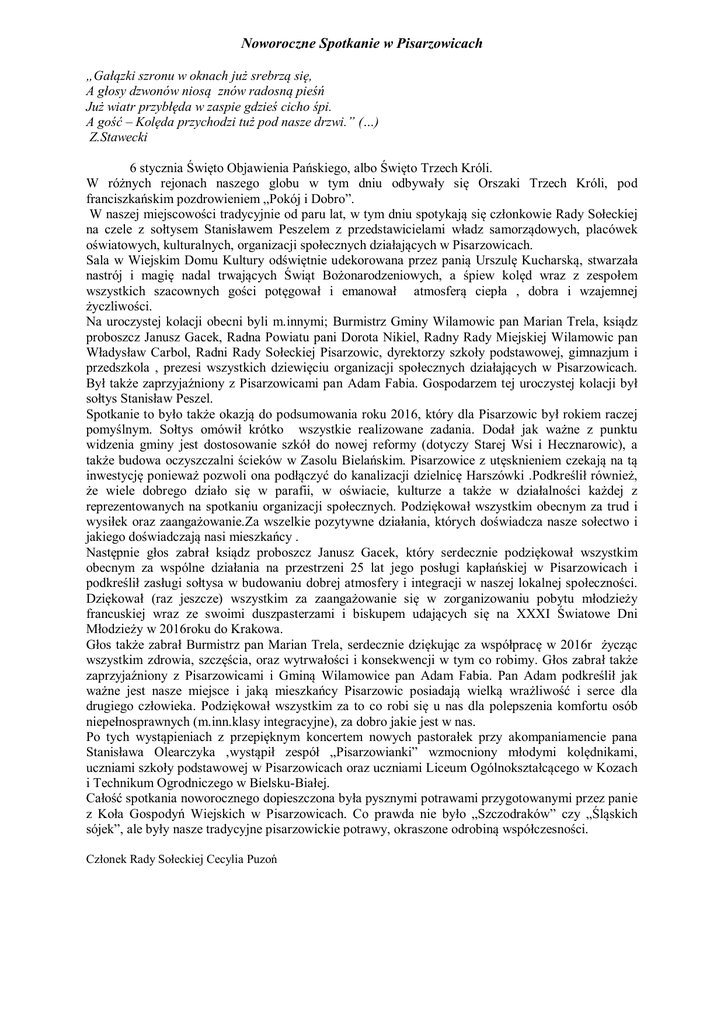 Noworoczne Spotkanie w Pisarzowicach „Gałązki szronu w oknach już srebrzą się, A głosy dzwonów niosą znów radosną pieśń Już wiatr przybłęda w zaspie gdzieś cicho śpi. A gość – Kolęda przychodzi tuż pod nasze drzwi.” (…) Z.Stawecki 6 stycznia Święto Objawienia Pańskiego, albo Święto Trzech Króli. W różnych rejonach naszego globu w tym dniu odbywały się Orszaki Trzech Króli, pod franciszkańskim pozdrowieniem „Pokój i Dobro”. W naszej miejscowości tradycyjnie od paru lat, w tym dniu spotykają się członkowie Rady Sołeckiej na czele z sołtysem Stanisławem Peszelem z przedstawicielami władz samorządowych, placówek oświatowych, kulturalnych, organizacji społecznych działających w Pisarzowicach. Sala w Wiejskim Domu Kultury odświętnie udekorowana przez panią Urszulę Kucharską, stwarzała nastrój i magię nadal trwających Świąt Bożonarodzeniowych, a śpiew kolęd wraz z zespołem wszystkich szacownych gości potęgował i emanował atmosferą ciepła , dobra i wzajemnej życzliwości. Na uroczystej kolacji obecni byli m.innymi; Burmistrz Gminy Wilamowic pan Marian Trela, ksiądz proboszcz Janusz Gacek, Radna Powiatu pani Dorota Nikiel, Radny Rady Miejskiej Wilamowic pan Władysław Carbol, Radni Rady Sołeckiej Pisarzowic, dyrektorzy szkoły podstawowej, gimnazjum i przedszkola , prezesi wszystkich dziewięciu organizacji społecznych działających w Pisarzowicach. Był także zaprzyjaźniony z Pisarzowicami pan Adam Fabia. Gospodarzem tej uroczystej kolacji był sołtys Stanisław Peszel. Spotkanie to było także okazją do podsumowania roku 2016, który dla Pisarzowic był rokiem raczej pomyślnym. Sołtys omówił krótko wszystkie realizowane zadania. Dodał jak ważne z punktu widzenia gminy jest dostosowanie szkół do nowej reformy (dotyczy Starej Wsi i Hecznarowic), a także budowa oczyszczalni ścieków w Zasolu Bielańskim. Pisarzowice z utęsknieniem czekają na tą inwestycję ponieważ pozwoli ona podłączyć do kanalizacji dzielnicę Harszówki .Podkreślił również, że wiele dobrego działo się w parafii, w oświacie, kulturze a także w działalności każdej z reprezentowanych na spotkaniu organizacji społecznych. Podziękował wszystkim obecnym za trud i wysiłek oraz zaangażowanie.Za wszelkie pozytywne działania, których doświadcza nasze sołectwo i jakiego doświadczają nasi mieszkańcy . Następnie głos zabrał ksiądz proboszcz Janusz Gacek, który serdecznie podziękował wszystkim obecnym za wspólne działania na przestrzeni 25 lat jego posługi kapłańskiej w Pisarzowicach i podkreślił zasługi sołtysa w budowaniu dobrej atmosfery i integracji w naszej lokalnej społeczności. Dziękował (raz jeszcze) wszystkim za zaangażowanie się w zorganizowaniu pobytu młodzieży francuskiej wraz ze swoimi duszpasterzami i biskupem udających się na XXXI Światowe Dni Młodzieży w 2016roku do Krakowa. Głos także zabrał Burmistrz pan Marian Trela, serdecznie dziękując za współpracę w 2016r życząc wszystkim zdrowia, szczęścia, oraz wytrwałości i konsekwencji w tym co robimy. Głos zabrał także zaprzyjaźniony z Pisarzowicami i Gminą Wilamowice pan Adam Fabia. Pan Adam podkreślił jak ważne jest nasze miejsce i jaką mieszkańcy Pisarzowic posiadają wielką wrażliwość i serce dla drugiego człowieka. Podziękował wszystkim za to co robi się u nas dla polepszenia komfortu osób niepełnosprawnych (m.inn.klasy integracyjne), za dobro jakie jest w nas. Po tych wystąpieniach z przepięknym koncertem nowych pastorałek przy akompaniamencie pana Stanisława Olearczyka ,wystąpił zespół „Pisarzowianki” wzmocniony młodymi kolędnikami, uczniami szkoły podstawowej w Pisarzowicach oraz uczniami Liceum Ogólnokształcącego w Kozach i Technikum Ogrodniczego w Bielsku-Białej. Całość spotkania noworocznego dopieszczona była pysznymi potrawami przygotowanymi przez panie z Koła Gospodyń Wiejskich w Pisarzowicach. Co prawda nie było „Szczodraków” czy „Śląskich sójek”, ale były nasze tradycyjne pisarzowickie potrawy, okraszone odrobiną współczesności. Członek Rady Sołeckiej Cecylia Puzoń