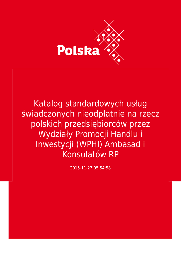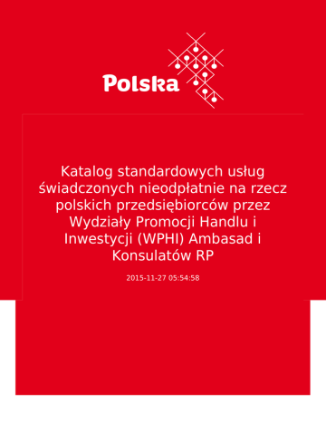 Katalog standardowych usług świadczonych nieodpłatnie na rzecz polskich przedsiębiorców przez Wydziały Promocji Handlu i Inwestycji (WPHI) Ambasad i Konsulatów RP 2015-11-27 05:54:58 2 3 Prezentujemy państwu katalog standardowych usług świadczonych nieodpłatnie na rzecz polskich przedsiębiorców przez Wydziały Promocji Handlu i Inwestycji (WPHI) Ambasad i Konsulatów RP Załącznik do pobrania poniżej. 4