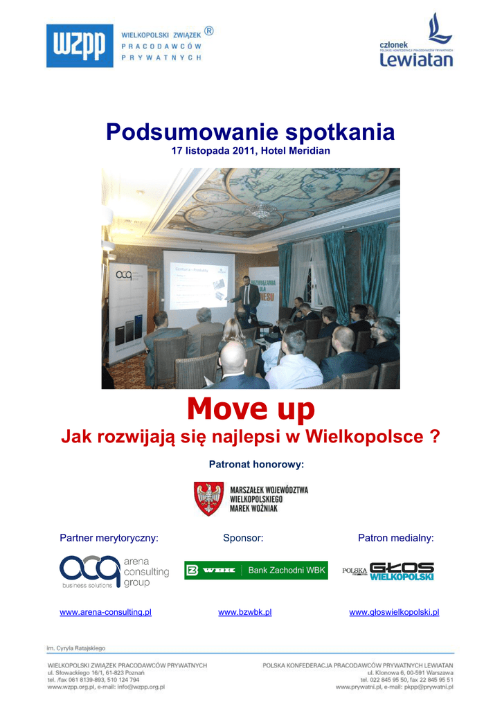 Podsumowanie spotkania 17 listopada 2011, Hotel Meridian Move up Jak rozwijają się najlepsi w Wielkopolsce ? Patronat honorowy: Partner merytoryczny: www.arena-consulting.pl Sponsor: Patron medialny: www.bzwbk.pl www.głoswielkopolski.pl Gość spotkania Gościem specjalnym drugiego spotkania był dr Maciej Kalkowski, założyciel, udziałowiec i Prezes Zarządu spółki Centuria sp. z o.o., która działa w obszarze ICT (technologie informatyczne i telekomunikacyjne). Firma dostarcza kompleksowe rozwiązania z zakresu projektowania, wdrażania i zarządzania infrastrukturą informatyczną. Poza tym Centuria Sp. z o.o. działa w obszarze oprogramowania wspomagającego obsługę Klientów w centrach serwisowych. Centuria Sp. z o.o. jest także większościowym udziałowcem firmy iStream Sp. z o.o., specjalizującej się w dostarczaniu kompleksowych rozwiązań związanych z transmisją video na żywo w Internecie. Możliwości oraz stopień zaawansowania oferowanych w tym zakresie usług pozycjonuje iStream Sp. z o.o. w gronie największych dostawców tego typu rozwiązań w Polsce. Relacja z przebiegu spotkania W pierwszej części spotkania pan Maciej Kalkowski przedstawił historię firmy, jej drogę rozwoju oraz plany na przyszłość. Druga część spotkania była poświęcona na dyskusję i pytania ze strony przedsiębiorców, którzy wzięli udział w spotkaniu (około 30 osób). Podsumowaniem spotkania był wniosek, że najważniejszymi źródłami sukcesu firmy były inwestowanie w wiedzę i rozwój, innowacyjność produktów/usług, koncentracja na jakości. Dyskusję moderował Wiceprzewodniczący Zarządu WZPP oraz Członek Zarządu firmy doradczej Arena Consulting Group Sp. z o.o. Pan Jacek Kornosz. Dziękujemy Panu Maciejowi Kalkowskiemu, uczestnikom spotkania oraz sponsorom i organizatorom projektu Move Up.
