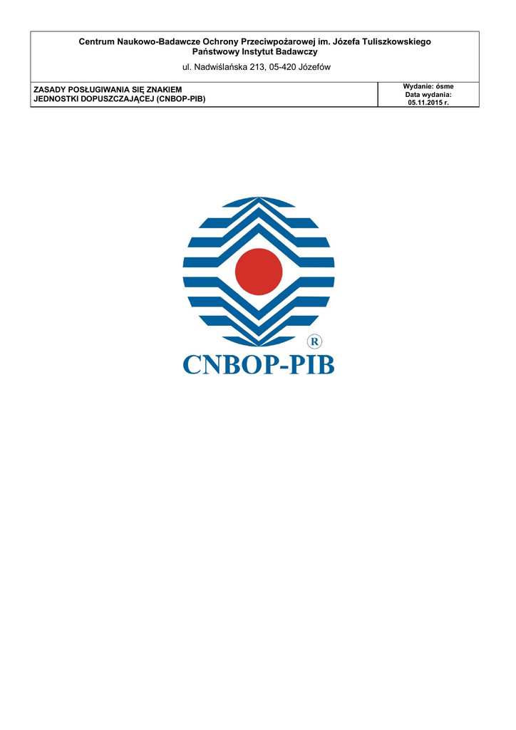 Centrum Naukowo-Badawcze Ochrony Przeciwpożarowej im. Józefa Tuliszkowskiego Państwowy Instytut Badawczy ul. Nadwiślańska 213, 05-420 Józefów ZASADY POSŁUGIWANIA SIĘ ZNAKIEM JEDNOSTKI DOPUSZCZAJĄCEJ (CNBOP-PIB) Wydanie: ósme Data wydania: 05.11.2015 r. Zasady posługiwania się znakiem jednostki dopuszczającej (CNBOP-PIB) Zasady posługiwania się znakiem jednostki dopuszczającej reguluje § 17 ust. 1 i 2 rozporządzenia Ministra Spraw Wewnętrznych i Administracji z dnia 20 czerwca 2007 r. w sprawie wykazu wyrobów służących zapewnieniu bezpieczeństwa publicznego lub ochronie zdrowia i życia oraz mienia, a także zasad wydawania dopuszczenia tych wyrobów do użytkowania (Dz. U. Nr 143, poz. 1002 z późn. zm.), które definiują umieszczanie znaku jednostki dopuszczającej na wyrobie. Niniejszy dokument opracowany przez CNBOP-PIB określa szczegółowe zasady stosowania znaku jednostki dopuszczającej. 1. Znakiem jednostki dopuszczającej jest logo CNBOP-PIB przedstawione w Załączniku nr 1. 2. Upoważnienie do stosownia znaku jednostki dopuszczającej CNBOP-PIB w odniesieniu do dopuszczonego wyrobu uzyskuje Producent wyrobu lub Wnioskodawca (tj. upoważniony przedstawiciel producenta), zwany dalej Posiadaczem, któremu CNBOP-PIB wydało dopuszczenie wyrobu do użytkowania, zwane dalej dopuszczeniem. 3. Znak jednostki dopuszczającej CNBOP-PIB jest prawnie chroniony i w związku z tym, oprócz zasad zawartych w niniejszym dokumencie, Posiadacz powinien stosować się do ogólnych zasad posługiwania się znakiem prawnie zastrzeżonym. 4. Zgodnie z zapisami umowy o kontroli i nadzorowaniu udzielonego dopuszczenia, która zawierana jest pomiędzy CNBOP-PIB a Posiadaczem, Posiadacz zobligowany jest do oznaczania znakiem jednostki dopuszczającej i numerem świadectwa dopuszczenia wyrobu objętego zakresem świadectwa dopuszczenia, przez okres ważności tego świadectwa. 5. Znak jednostki dopuszczającej nie może być stosowany w odniersieniu do wyrobu, który jest przedmiotem prowadzonego procesu o wydanie lub zmianę zakresu (rozszerzenie) dopuszczenia. 6. CNBOP-PIB udostępnia Posiadaczowi logo w wersji bitmapy (z białym tłem) lub w formacie PNG (tło przeźroczyste), a na życzenie Posiadacza również w postaci wektorowej. 7. Posiadacz jest zobowiązany do stosowania znaku w formie, proporcjach i kolorze określonym w Załączniku 1 do niniejszego dokumentu. 8. Posiadacz może stosować znak jednostki dopuszczającej CNBOP-PIB w formie wytłoczeń. 9. Dopuszcza się skalowanie znaku jednostki dopuszczającej CNBOP-PIB pod warunkiem, że: zachowana jest proporcja szerokości do wysokości, nie ulega zniekształceniu forma graficzna, zachowana jest czytelność liter. 10. W uzasadnionych przypadkach braku technicznych możliwości naniesienia znaku jednostki dopuszczającej CNBOP-PIB w kolorach określonych w Załączniku 1 do niniejszego dokumentu, dopuszcza się zmianę kolorystyki znaku pod warunkiem zastosowania jednego koloru dla całego znaku. 11. Znak jednostki dopuszczającej CNBOP-PIB umieszcza się bezpośrednio na dopuszczonym wyrobie albo na etykiecie przymocowanej do niego w sposób widoczny, czytelny i nie dający się usunąć, zgodnie z informacjami określonymi w dokumentacji technicznej wyrobu. 12. Jeżeli nie jest możliwe techniczne oznakowanie wyrobu w sposób określony w punkcie 11, oznakowanie umieszcza się na opakowaniu jednostkowym lub opakowaniku zbiorczym wyrobu albo na dokumentach handlowych towarzyszących temu wyrobowi. Wydanie 8 z dnia 05.11.2015 r. Strona 2 z 6 Zasady posługiwania się znakiem jednostki dopuszczającej (CNBOP-PIB) 13. Jeżeli wyrób objęty zakresem wydanego dopuszczenia produkowany jest w kilku zakładach produkcyjnych, to znak jednostki dopuszczającej może być stosowany tylko przez te zakłady produkcyjne, które zostały wskazane na świadectwie dopuszczenia. 14. Znak jednostki dopuszczającej można stosować na wyrobach dopuszczonych do użytkowania jak również lub na dokumentach związanych z działalnością Posiadacza takich jak: - druki firmowe, - dokumenty handlowe, - dokumenty i materiały promocyjne lub reklamowe. 15. Znak jednostki dopuszczającej CNBOP-PIB może być nanoszony na dokumentach wymienionych w punkcie 14 pod warunkiem, że jest on umieszczony w postaci równorzędnej z logo Posiadacza. 16. W dokumentach handlowych jak m.in. oferty i pisma, drukowanych na papierze firmowym opatrzonym znakiem jednostki dopuszczającej CNBOP-PIB, dotyczących wyrobów, z których nie wszystkie są objęte udzielonym dopuszczeniem, powinny być jasno i jednoznacznie określone wyroby posiadające dopuszczenie do użytkowania. 17. Pisma i dokumenty dotyczące wyrobów nie objętych dopuszczeniem (oferty, pisma firmowe), drukowane na papierze firmowym opatrzonym znakiem jednostki dopuszczającej CNBOP-PIB powinny zawierać czytelne oświadczenie wskazując wyraźnie, że „niniejsze wyroby nie posiadają świadectwa dopuszczenia CNBOP-PIB”. 18. Nie dopuszcza się stosowania znaku jednostki dopuszczającej CNBOP-PIB na wizytówkach i/lub pieczątkach Posiadacza lub pracowników Posiadacza. 19. Posiadacz, któremu cofnięto dopuszczenie, na określony wyrób, od dnia cofnięcia dopuszczenia nie może znakować tego wyrobu znakiem jednostki dopuszczającej. Nie może również oznakowywać znakiem jednostki dopuszczającej opakowań jednostkowych, opakowań zbiorczych tego wyrobu. Nie może umieszczać znaku jednostki dopuszcającej na dokumentach handlowych towarzyszących temu wyrobowi. Dodatkowo Posiadacz jest zobowiązany do usunięcia znaku jednostki dopuszczającej ze wszystkich dokumentów towarzyszących wyrobowi, który nie posiada ważnego świadectwa dopuszczenia. Jeżeli, z jakiegokolwiek powodu, dopuszczenie wyrobu utraciło ważność, Posiadacz jest zobowiązany do natychmiastowego zaprzestania znakowania tego wyrobu znakiem jednostki dopuszczającej. Posiadacz nie może również oznakowy