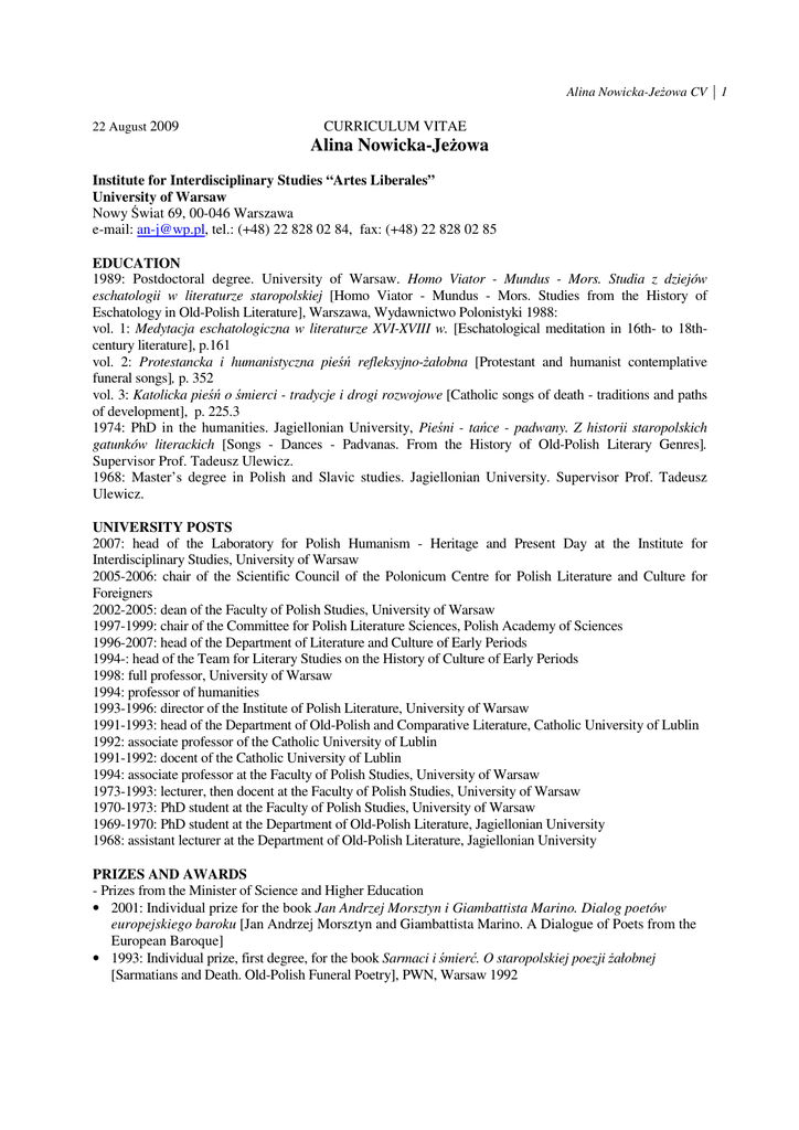 Alina Nowicka-Jeżowa CV 22 August 2009 CURRICULUM VITAE Alina Nowicka-Jeżowa Institute for Interdisciplinary Studies “Artes Liberales” University of Warsaw Nowy Świat 69, 00-046 Warszawa e-mail: [email protected], tel.: (+48) 22 828 02 84, fax: (+48) 22 828 02 85 EDUCATION 1989: Postdoctoral degree. University of Warsaw. Homo Viator - Mundus - Mors. Studia z dziejów eschatologii w literaturze staropolskiej [Homo Viator - Mundus - Mors. Studies from the History of Eschatology in Old-Polish Literature], Warszawa, Wydawnictwo Polonistyki 1988: vol. 1: Medytacja eschatologiczna w literaturze XVI-XVIII w. [Eschatological meditation in 16th- to 18thcentury literature], p.161 vol. 2: Protestancka i humanistyczna pieśń refleksyjno-żałobna [Protestant and humanist contemplative funeral songs], p. 352 vol. 3: Katolicka pieśń o śmierci - tradycje i drogi rozwojowe [Catholic songs of death - traditions and paths of development], p. 225.3 1974: PhD in the humanities. Jagiellonian University, Pieśni - tańce - padwany. Z historii staropolskich gatunków literackich [Songs - Dances - Padvanas. From the History of Old-Polish Literary Genres]. Supervisor Prof. Tadeusz Ulewicz. 1968: Master’s degree in Polish and Slavic studies. Jagiellonian University. Supervisor Prof. Tadeusz Ulewicz. UNIVERSITY POSTS 2007: head of the Laboratory for Polish Humanism - Heritage and Present Day at the Institute for Interdisciplinary Studies, University of Warsaw 2005-2006: chair of the Scientific Council of the Polonicum Centre for Polish Literature and Culture for Foreigners 2002-2005: dean of the Faculty of Polish Studies, University of Warsaw 1997-1999: chair of the Committee for Polish Literature Sciences, Polish Academy of Sciences 1996-2007: head of the Department of Literature and Culture of Early Periods 1994-: head of the Team for Literary Studies on the History of Culture of Early Periods 1998: full professor, University of Warsaw 1994: professor of humanities 1993-1996: director of the Institute of Polish Literature, University of Warsaw 1991-1993: head of the Department of Old-Polish and Comparative Literature, Catholic University of Lublin 1992: associate professor of the Catholic University of Lublin 1991-1992: docent of the Catholic University of Lublin 1994: associate professor at the Faculty of Polish Studies, University of Warsaw 1973-1993: lecturer, then docent at the Faculty of Polish Studies, University of Warsaw 1970-1973: PhD student at the Faculty of Polish Studies, University of Warsaw 1969-1970: PhD student at the Department of Old-Polish Literature, Jagiellonian University 1968: assistant lecturer at the Department of Old-Polish Literature, Jagiellonian University PRIZES AND AWARDS - Prizes from the Minister of Science and Higher Education • 2001: Individual prize for the book Jan Andrzej Morsztyn i Giambattista Marino. Dialog poetów europejskiego baroku [Jan Andrzej Morsztyn and Giambattista Marino. A Dialogue of Poets from the European Baroque] • 1993: Individual prize, first degree, for the book Sarmaci i śmierć. O staropolskiej poezji żałobnej [Sarmatians and Death. Old-Polish Funeral Poetry], PWN, Warsaw 1992 1 Alina Nowicka-Jeżowa CV • 1990: Individual prize, third degree, for the monograph Homo Viator – Mundus – Mors. Studia z dziejów eschatologii w literaturze staropolskiej [Homo Viator - Mundus - Mors. Studies from the History of Eschatology in Old-Polish Literature], Warsaw 1988 • 1979: Prize, third degree, for the monograph Madrygały staropolskie. Z dziejów liryki miłosnej w epoce renesansu i baroku [Old-Polish Madrigals. From the History of Love Poetry in the Renaissance and Baroque], Wrocław 1978 - Recipient of a Professor’s Grant from the Foundation for Polish Science - Individual prizes from the University of Warsaw’s Rector in the years: 2002, 2003, 2004, 2005, 2006 - Prizes from the University of Warsaw’s Rector on Teacher’s Day: 1976; 1984; 1989; 1996; 2003, 2008. - Rector’s research grant 2000/2001. SCHOLARSHIPS, GRANTS • 2009-2010: Thesis research project No. N N 103 213736 „Między poezją a mistyką. O tzw. nurcie eksperymentalnym polskiej poezji późnego baroku w świetle wypowiedzi teoretycznych” [Between poetry and mysticism. On the experimental trend in Polish late Baroque poetry in the light of theoretical statements] (project manager) • 2008-2011: „Humanizm. Idee, nurty, paradygamaty humanistyczne w kulturze polskiej” [Humanism. Humanist ideas, trends, paradigms in Polish culture]. Research project commissioned by the Minister of Science and Higher Education No. PBZ-MNiSW-03/II/2007 (Project manager). • 2008-2009: Research Project No. N 103 140934: „Poezja święta. Trzy cykle baroku europejskiego („Cherubinischer Wandersmann” Anioła Ślązaka, „The Temple” George’a Herberta i „Poezyje Postu Świętego” Stanisława Herakliusza Lubomirskiego)” [Religious poetry. Three cycles of the European Baroque (Cherubinischer Wandersmann by Anioł Ślązak, The Temple by George Herbert, and Poezyje Postu Świętego by Stanisław Herakliusz Lubomirski)]. Supervisor’s grant. (Project manager). • 2004-2006: "Canons de la culture et thematisation de l'histoire en Europe Centrale", international research project carried out at the following universities: Nancy II, Paris IV. Sorbonne, Charles University in Prague, University of Budapest, University of Bratislava, University of Warsaw (Polish part of the project carried out with Andrzej Mencwel. Project manager Michel Masłowski). • 2004-2006 : « Polonica i Skoklostersamlingen på Skokloster slott », project sponsored by Stockholms Universitet and Kungliga Vitterhets Historie och Antikvitets Akademien, Wennergrens Centrum (Polish coordinator; Swedish manager: Ewa Teodorowicz-Hellman) • 2002-2005: „Kultura polskiego baroku w Europie XVII wieku” [Polish Baroque culture in 17thcentury Europe], Professor’s Grant from the Foundation for Polish