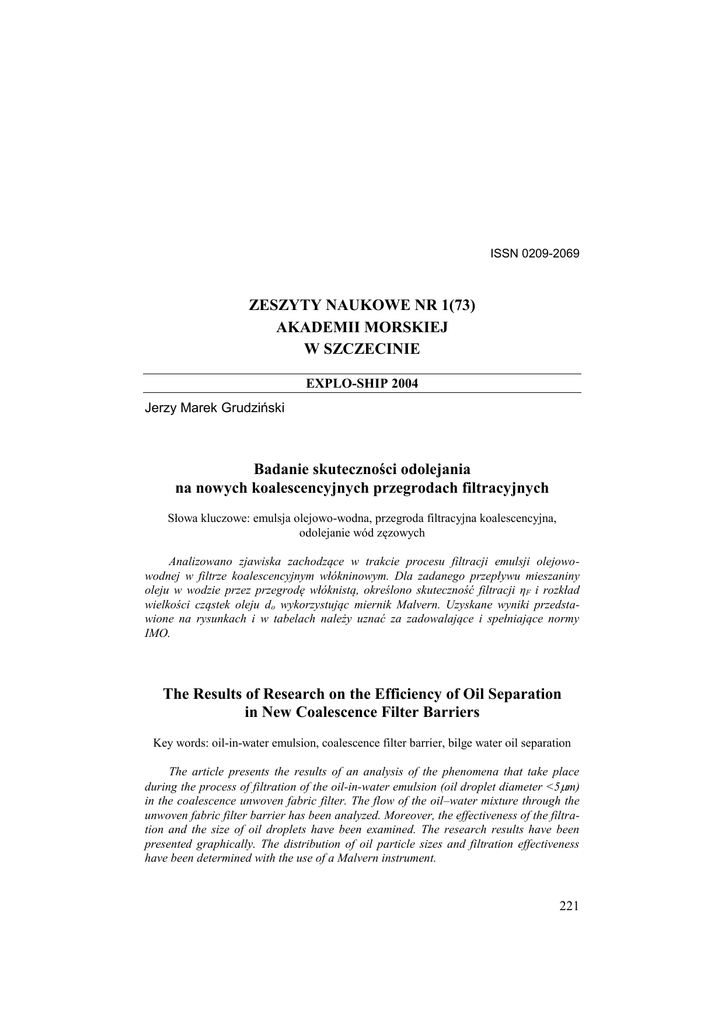 ISSN 0209-2069 ZESZYTY NAUKOWE NR 1(73) AKADEMII MORSKIEJ W SZCZECINIE EXPLO-SHIP 2004 Jerzy Marek Grudziński Badanie skuteczności odolejania na nowych koalescencyjnych przegrodach filtracyjnych Słowa kluczowe: emulsja olejowo-wodna, przegroda filtracyjna koalescencyjna, odolejanie wód zęzowych Analizowano zjawiska zachodzące w trakcie procesu filtracji emulsji olejowowodnej w filtrze koalescencyjnym włókninowym. Dla zadanego przepływu mieszaniny oleju w wodzie przez przegrodę włóknistą, określono skuteczność filtracji ηF i rozkład wielkości cząstek oleju do wykorzystując miernik Malvern. Uzyskane wyniki przedstawione na rysunkach i w tabelach należy uznać za zadowalające i spełniające normy IMO. The Results of Research on the Efficiency of Oil Separation in New Coalescence Filter Barriers Key words: oil-in-water emulsion, coalescence filter barrier, bilge water oil separation The article presents the results of an analysis of the phenomena that take place during the process of filtration of the oil-in-water emulsion (oil droplet diameter <5m) in the coalescence unwoven fabric filter. The flow of the oil–water mixture through the unwoven fabric filter barrier has been analyzed. Moreover, the effectiveness of the filtration and the size of oil droplets have been examined. The research results have been presented graphically. The distribution of oil particle sizes and filtration effectiveness have been determined with the use of a Malvern instrument. 221 Jerzy Marek Grudziński Wprowadzenie Poważnym problemem ochrony środowiska morskiego są zaolejone ścieki wytwarzane przez obiekty pływające. Zanieczyszczenie wód produktami olejowymi1 przez statki może następować w wyniku: – – – – wylewania wody balastowej i po myciu zbiorników ładunkowych, usuwania wód zęzowych, awarii zbiornikowców i innych statków, pęknięć przewodów w czasie ładowania i rozładowywania ropy naftowej, – wycieków olejów z łożysk wałów śrubowych oraz innych elementów ruchomych smarowanych olejami, mających kontakt z wodą [1 – 5]. Wszystkie te zanieczyszczenia charakteryzują się dużą zawartością substancji ropopochodnych, a ich powstawanie jest zjawiskiem praktycznie nie uniknionym. 1. Badania skuteczności odolejania z zastosowaniem przegród FOW, IPP 1449/20 i FINET POP 2 w warunkach laboratoryjnych na modelu filtra 1.1. Założenia do badań W związku z niejednoznacznym określeniem zjawisk zachodzących na przegrodzie włókninowej [1] w celu sprawdzenia rozważań teoretycznych oraz zbadania skuteczności procesu koalescencji oleju na przegrodzie wielowarstwowej wykonanej z włókien syntetycznych zaprojektowano i wykonano odolejacz modelowy filtra ze szkła (rys. 1). Przy wyborze rozwiązania konstrukcji filtra do badań założono: – poziome usytuowanie przegrody i napływ zaolejonej wody od dołu; – zatrzymywanie oleju na całej powierzchni przegrody oraz w jej wnętrzu, a wydzielanie się go w górnej powierzchni przegrody w postaci kropel, które odrywając się będą zbierały się w górnej części cylindra; – odprowadzanie oczyszczonej wody znad przegrody króćcem, tak usytuowanym, aby nie było możliwe dostanie się tam wydzielonego oleju. 1 Olej – zgodnie z konwencją MARPOL [16] i Helsińską [17], należy rozumieć surową ropę naftową, produkty jej przeróbki oraz odpady (np. zaolejona woda zęzowa) zawierające ropę i jej produkty. 222 Badanie skuteczności odolejania na nowych koalescencyjnych przegrodach filtracyjnych Rys. 1. Mocowanie badanej przegrody na filtrze laboratoryjnym: 1 – cylinder szklany, 2 – badana przegroda, 3 – uszczelka, 4 – kołnierz, 5 – podkładka, 6 – nakrętka Fig. 1. The mounting of the filter barrier Filtr laboratoryjny (model filtru) (rys. 1) wykonano z dwóch szklanych cylindrów z góry i z dołu zakrytych pokrywami, które ściągnięto szpilkami. W celu dogodniejszej wymiany włókien, w środkowej części umieszczono łatwo dające się rozmontować kołnierze. Uwzględniając podobieństwa przepływu dynamicznego i kinematycznego w kanałach porów (kapilarach) filtru okrętowego i filtru laboratoryjnego, z zastosowaniem tej samej przegrody, liczba Reynoldsa wynosiła: Re R Re M (1) w dk w dk R M (2) gdzie: – gęstość wody, w – prędkość przepływu przez filtr, dk – średnica kapilary, – współczynnik lepkości dynamicznej wody, indeksy R i M odnoszą się do filtru okrętowego i filtru laboratoryjnego. Z równania (2) otrzymano: R M d kR wR 1 M R d kM wM (3) 223 Jerzy Marek Grudziński Zakładając niezmienność parametrów , , dk uzyskano: wR wM (4) uwzględniając powyższą równość określono strumień objętościowy: F q M q R M FR (5) W badaniach przegród przyjęto strumień objętościowy qM = 30–90 [dm3/h]. W filtrze modelowym umieszczono różne przegrody włókniste. Badanie danej przegrody przeprowadzono używając modelowej mieszaniny wodnoolejowej: woda wodociągowa – paliwo lekkie (tab. 1). Tabela 1 Własności paliwa lekkiego Properties of Diesel oil Lp. Nazwa wielkości Paliwo lekkie 1 Gęstość w 20°C [g/cm3] 0,8753 2 Lepkość dynamiczna w 40°C [cP] 14,72 3 Lepkość kinematyczna w 40°C [cSt] 17,08 4 Zawartość wody max. [%] 0,10 5 Temperatura zapłonu [°C] 101 1.2. Filtracyjne przegrody włókniste Obecnie przegrody wykonane techniką igłowania z różnych włókien naturalnych i sztucznych osiągają skuteczności oddzielania filtrowanych mediów na poziomie 99,9% [10 – 15]. Użyte przegrody włókninowe w badaniach wykonano z surowców sztucznych hydrofobowych włókien PP (4,6 den) i PE (1,5; 4 den), dodatkowo do włókniny FOW wprowadzono cienkie włókna szklane o średnicy 4 µm. W celu wyeliminowania odkształcenia włóknin w czasie pracy do włókniny wprowadzono tkaninę wzmacniającą ET z włókien PE (elana-2dtex). Tak wykonane maty poddano dalszej obróbce chemicznej lub termicznej (wygładzaniu) i impregn