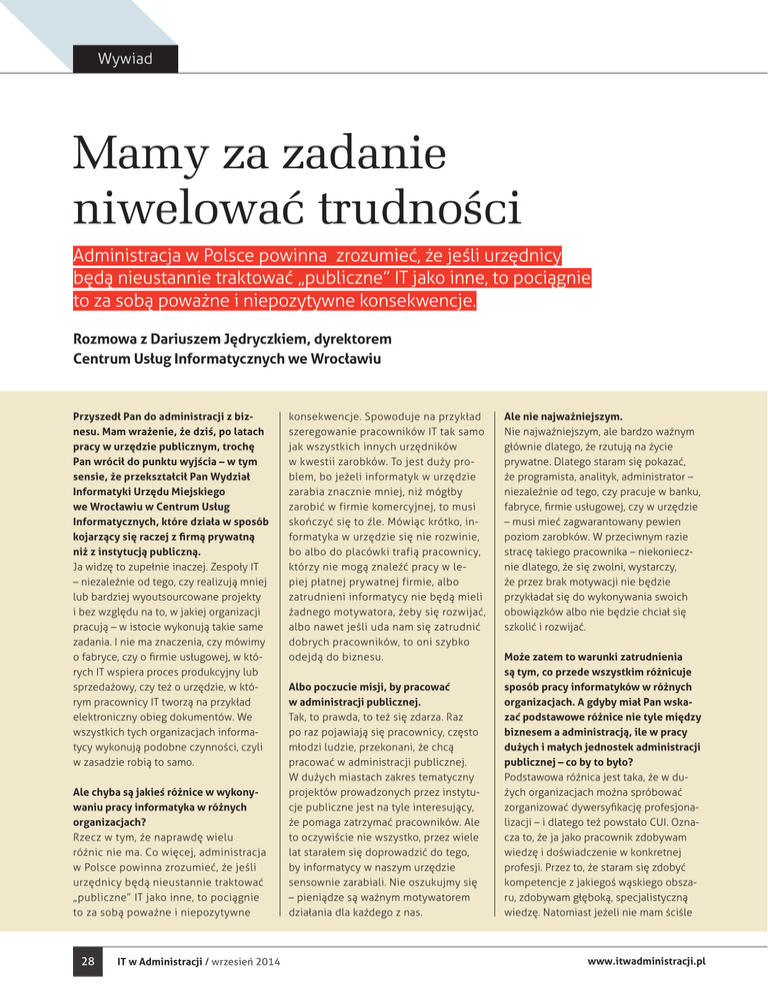 Wywiad Mamy za zadanie niwelować trudności Administracja w Polsce powinna zrozumieć, że jeśli urzędnicy będą nieustannie traktować „publiczne” IT jako inne, to pociągnie to za sobą poważne i niepozytywne konsekwencje. Rozmowa z Dariuszem Jędryczkiem, dyrektorem Centrum Usług Informatycznych we Wrocławiu Przyszedł Pan do administracji z biznesu. Mam wrażenie, że dziś, po latach pracy w urzędzie publicznym, trochę Pan wrócił do punktu wyjścia – w tym sensie, że przekształcił Pan Wydział Informatyki Urzędu Miejskiego we Wrocławiu w Centrum Usług Informatycznych, które działa w sposób kojarzący się raczej z firmą prywatną niż z instytucją publiczną. Ja widzę to zupełnie inaczej. Zespoły IT – niezależnie od tego, czy realizują mniej lub bardziej wyoutsourcowane projekty i bez względu na to, w jakiej organizacji pracują – w istocie wykonują takie same zadania. I nie ma znaczenia, czy mówimy o fabryce, czy o firmie usługowej, w których IT wspiera proces produkcyjny lub sprzedażowy, czy też o urzędzie, w którym pracownicy IT tworzą na przykład elektroniczny obieg dokumentów. We wszystkich tych organizacjach informatycy wykonują podobne czynności, czyli w zasadzie robią to samo. Ale chyba są jakieś różnice w wykonywaniu pracy informatyka w różnych organizacjach? Rzecz w tym, że naprawdę wielu różnic nie ma. Co więcej, administracja w Polsce powinna zrozumieć, że jeśli urzędnicy będą nieustannie traktować „publiczne” IT jako inne, to pociągnie to za sobą poważne i niepozytywne 28 IT w Administracji / wrzesień 2014 konsekwencje. Spowoduje na przykład szeregowanie pracowników IT tak samo jak wszystkich innych urzędników w kwestii zarobków. To jest duży problem, bo jeżeli informatyk w urzędzie zarabia znacznie mniej, niż mógłby zarobić w firmie komercyjnej, to musi skończyć się to źle. Mówiąc krótko, informatyka w urzędzie się nie rozwinie, bo albo do placówki trafią pracownicy, którzy nie mogą znaleźć pracy w lepiej płatnej prywatnej firmie, albo zatrudnieni informatycy nie będą mieli żadnego motywatora, żeby się rozwijać, albo nawet jeśli uda nam się zatrudnić dobrych pracowników, to oni szybko odejdą do biznesu. Albo poczucie misji, by pracować w administracji publicznej. Tak, to prawda, to też się zdarza. Raz po raz pojawiają się pracownicy, często młodzi ludzie, przekonani, że chcą pracować w administracji publicznej. W dużych miastach zakres tematyczny projektów prowadzonych przez instytucje publiczne jest na tyle interesujący, że pomaga zatrzymać pracowników. Ale to oczywiście nie wszystko, przez wiele lat starałem się doprowadzić do tego, by informatycy w naszym urzędzie sensownie zarabiali. Nie oszukujmy się – pieniądze są ważnym motywatorem działania dla każdego z nas. Ale nie najważniejszym. Nie najważniejszym, ale bardzo ważnym głównie dlatego, że rzutują na życie prywatne. Dlatego staram się pokazać, że programista, analityk, administrator – niezależnie od tego, czy pracuje w banku, fabryce, firmie usługowej, czy w urzędzie – musi mieć zagwarantowany pewien poziom zarobków. W przeciwnym razie stracę takiego pracownika – niekoniecznie dlatego, że się zwolni, wystarczy, że przez brak motywacji nie będzie przykładał się do wykonywania swoich obowiązków albo nie będzie chciał się szkolić i rozwijać. Może zatem to warunki zatrudnienia są tym, co przede wszystkim różnicuje sposób pracy informatyków w różnych organizacjach. A gdyby miał Pan wskazać podstawowe różnice nie tyle między biznesem a administracją, ile w pracy dużych i małych jednostek administracji publicznej – co by to było? Podstawowa różnica jest taka, że w dużych organizacjach można spróbować zorganizować dywersyfikację profesjonalizacji – i dlatego też powstało CUI. Oznacza to, że ja jako pracownik zdobywam wiedzę i doświadczenie w konkretnej profesji. Przez to, że staram się zdobyć kompetencje z jakiegoś wąskiego obszaru, zdobywam głęboką, specjalistyczną wiedzę. Natomiast jeżeli nie mam ściśle www.itwadministracji.pl Wywiad Dariusz Jędryczek jest dyrektorem Centrum Usług Informatycznych (CUI) we Wrocławiu – jednostki budżetowej powołanej w celu realizowania zintegrowanej polityki IT w gminie Wrocław poprzez świadczenie usług i wdrażanie standardów z zakresu informatyki i telekomunikacji. Współtworzył liczne projekty miejskie, m.in. „Miejski Internet”, „Urbancard” i „Jeden numer”. Doprowadził do przekształcenia Wydziału Informatyki Urzędu Miejskiego Wrocławia w CUI. Wcześniej, jako dyrektor urzędowego Wydziału Informatyki, wprowadził zmiany, dzięki którym jednostka świadczyła usługi zgodnie z ITIL i uzyskała akredytowany certyfikat ISO20000. określonych kompetencji, lecz wykonuję wiele czynności ogólnych, to efekt jest taki, że wiem trochę o wszystkim, ale moja wiedza jest powierzchowna. Trochę zajmuję się sieciami, trochę serwerami, a z doskoku – bazami danych. I owszem, jestem specjalistą, ale z wiedzą ogólną i na niskim poziomie. Jeżeli zaś latami zajmuję się – na przykład – tylko bazami danych, to moja wiedza z czasem siłą rzeczy musi się pogłębić i staje się moim atutem, bo jestem specjalistą. Takie warunki pracy chcę zapewnić obecnym informatykom w CUI i tym, którzy dołączą do naszego zespołu w przyszłości. Skoro mówimy o profesjonalizacji pracowników: do jakich zadań lepiej mieć własnych pracowników i własny sprzęt, a przy jakich można – a nawet powinno się – korzystać z zewnętrznych zasobów? To zależy od specyfiki danej organizacji, bo to do niej powinna się dostosować informatyka. Urzędy pracują na podstawie tej samej ustawy, ale różnie jest w nich organizowana praca. Dlatego nie ma recepty na to, kiedy stawiać na własne siły, a kiedy posiłkować się pomocą inn