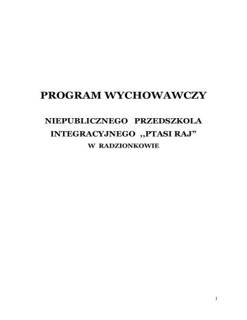 PROGRAM WYCHOWAWCZY NIEPUBLICZNEGO PRZEDSZKOLA INTEGRACYJNEGO ,,PTASI RAJ” W RADZIONKOWIE 1 Podstawa prawna: 1. Ustawa z dnia 7 września 1991 r. o systemie oświaty (tj: Dz. U. z 2015 r. poz. 2156). 2. Rozporządzenie Ministra Edukacji Narodowej z dnia 27 sierpnia 2012 r. w sprawie podstawy programowej wychowania przedszkolnego oraz kształcenia ogólnego w poszczególnych typach szkół ( Dz. U. z 2012 r., poz. 977 ze zm.). 3. Art. 72 Konstytucji RP. Program opracowano w oparciu o: 1. Statut Przedszkola Integracyjnego. 2. Podstawę programową wychowania przedszkolnego. "Pomóżmy dzieciom, by każdy z nich stał się tym, kim stać się może" Janusz Korczak Wychowanie od podstaw nie jest rzeczą prostą. Jest to proces ciągły i długotrwały, dlatego też nadrzędnym celem Programu Wychowawczego Niepublicznego Przedszkola Integracyjnego „Ptasi Raj” w Radzionkowie jest stwarzanie warunków do pełnego rozwoju osobowego każdego dziecka, zgodnego z jego wrodzonym potencjałem i możliwościami w relacjach ze środowiskiem społeczno – kulturowym i przyrodniczym. W pracy wychowawczej z dziećmi promowane są również wartości zgodne z głównymi założeniami pedagogiki Marii Montessori. Hołdując zasadzie, że nauczenie dziecka wartości jest najważniejszym zadaniem wychowawczym dla rodziców i nauczycieli, za cel nadrzędny stawiamy wychowanie dziecka wrażliwego, o wysokiej kulturze osobistej przygotowanego do życia, zgodnego z ogólnie przyjętymi normami społeczno – moralnymi. Program wychowawczy naszego Przedszkola opracowany jest na bazie podstawy programowej wychowania przedszkolnego. Wspomaga pracę nauczyciela i wspiera działania wychowawcze rodziców. 2 Wszyscy, zarówno rodzice, jak i cały personel przedszkola powinni kierować się zasadą, że jest coś, co w istotny sposób odróżnia nauczanie wartości od edukacji w innych dziedzinach, mianowicie: najważniejszym elementem tej nauki jest przykład dorosłych. Nie teoria, lecz zachowania dorosłych, czyli ich system wartości w działaniu, najdobitniej przemawiają do dzieci. Trzeba być bardzo uważnym, by praktykowane przez nas w codziennym życiu wartości, które dzieci dostrzegają i nieomylnie interpretują, były spójne z tymi, które głosimy i których chcemy dzieci nauczyć. I. WARTOŚCI WYCHOWAWCZE – FORMY REALIZACJI 1. WARTOŚCI: KULTURA BYCIA - Zasada: Bądź kulturalny. Normy postępowania, np.: używanie form grzecznościowych: „proszę”, „dziękuję”, „przepraszam”, pamiętanie o witaniu i żegnaniu się, okazywanie szacunku dorosłym (starszym osobom), nie niszczenie zabawek, przedmiotów, pracy innych, prawidłowe posługiwanie się sztućcami itp. ZDROWIE - Zasada: Dbaj o zdrowie swoje i innych. Normy postępowania, np.: branie spacerach udziału w zabawach ruchowych, i wycieczkach, ubieranie się stosownie do pogody i pory roku, mycie rąk przed posiłkami i po wyjściu z ubikacji, itp. BEZPIECZEŃSTWO - Zasada: Dbaj o bezpieczeństwo swoje i innych. Normy postępowania, np.: dostrzeganie sytuacji zagrażających bezpieczeństwu, mówienie o swoich uczuciach, informowanie dorosłych o swoich dolegliwościach, nie oddalanie się od grupy z miejsca zabawy, przestrzeganie zasad ruchu drogowego dla pieszych, pamiętanie adresu zamieszkania, itp. KONTAKTY RÓWIEŚNICZE - Zasada: Bądź koleżeński. Normy postępowania, np.: wyrażanie swoich emocji w sposób zrozumiały i akceptowany przez innych, nie wyrządzanie krzywdy innym, słuchanie co mówią inni, spokojne oczekiwanie na swoją kolej, pomaganie młodszym, słabszym, mniej sprawnym, cieszenie się z własnych sukcesów, docenianie sukcesów innych, itp. 3 ŁAD, PORZĄDEK, ESTETYKA OTOCZENIA - Zasada: Dbaj o ład, porządek i estetykę otoczenia. Normy postępowania, np. odkładanie zabawek, przyborów na miejsce, wyrzucanie śmieci do kosza, dbałość o wygląd, itp. CUDZA WŁASNOŚĆ - Zasada: Szanuj cudzą własność. Normy postępowania, np: pytanie właściciela o zgodę na zabranie jego własności, oddawanie pożyczonej rzeczy właścicielowi, itp. ŚRODOWISKO NATURALNE - Zasada: Szanuj środowisko naturalne. Normy postępowania, np. zachowanie ciszy w lesie, nie niszczenie roślin, segregowanie śmieci, oszczędzanie wody, prądu, papieru, itp. RODZINA - Zasada: Poznaj tradycje swojej rodziny. Normy postępowania, np: pamiętanie swojego nazwiska, dokładnego adresu zamieszkania, znajomość miejsca pracy rodziców, aktywny udział w obchodach świąt rodzinnych (np. Dzień Matki, dzień Babci i Dziadka), itp. OJCZYZNA - Zasada: Bądź małym patriotą. Normy postępowania, np.: poznanie i szacunek dla symboli narodowych: godło, barwy, hymn, szacunek wobec języka ojczystego i tradycji narodowych, itp. WARTOŚCI MORALNE - Zasada: Kieruj się wartościami, nie krzywdź innych. Normy postępowania, np.: odnoszenie szanowanie cudzej godności, się do innych z szacunkiem, odrębności, prywatności, okazywanie wdzięczności za pomoc, akceptacja niepełnosprawności, dotrzymywanie obietnic, unikanie przemocy, itp. 2. FORMY REALIZACJI: dostarczanie dzieciom właściwych wzorców zachowania, min. poprzez postępowanie nauczyciela, teatrzyki, pogadanki, bajki, teksty literackie, itp.; prezentowanie materiałów montessoriańskich zgodnie z założeniami metody; 4 podejmowanie działań uczących dzieci określonych zachowań, które zgodnie z założeniami pedagogiki Marii Montessori są nagradzające same w sobie, np.: przez dbałość o zwierzęta – dogoterapia, pielęgnowanie roślin, itp.; scenki sytuacyjne kształtujące pozytywne postawy społeczne; wykorzystywanie różnorodnych sytuacji dnia codziennego, również zajęć z całą grupą, do zwracania uwagi na swój sposób bycia, komunikowania się z innymi, zwracania się do innych; praca z wykorzystaniem ilustracji i historyjek obrazkowych pomagająca dzieciom zrozumieć przyczyny i skutki przedstawionych sytuacji, kształtująca umiejętność d