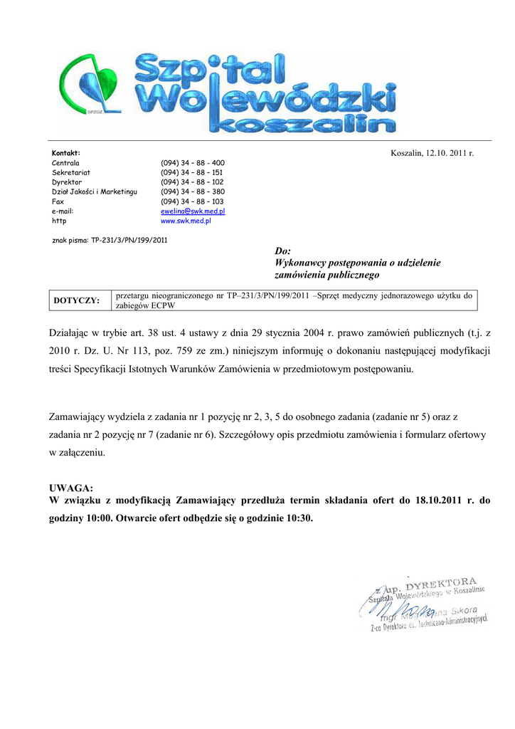 Kontakt: Centrala Sekretariat Dyrektor Dział Jakości i Marketingu Fax e-mail: http Koszalin, 12.10. 2011 r. (094) 34 – 88 - 400 (094) 34 – 88 – 151 (094) 34 – 88 – 102 (094) 34 – 88 – 380 (094) 34 – 88 – 103 [email protected] www.swk.med.pl znak pisma: TP-231/3/PN/199/2011 Do: Wykonawcy postępowania o udzielenie zamówienia publicznego DOTYCZY: przetargu nieograniczonego nr TP–231/3/PN/199/2011 –Sprzęt medyczny jednorazowego użytku do zabiegów ECPW Działając w trybie art. 38 ust. 4 ustawy z dnia 29 stycznia 2004 r. prawo zamówień publicznych (t.j. z 2010 r. Dz. U. Nr 113, poz. 759 ze zm.) niniejszym informuję o dokonaniu następującej modyfikacji treści Specyfikacji Istotnych Warunków Zamówienia w przedmiotowym postępowaniu. Zamawiający wydziela z zadania nr 1 pozycję nr 2, 3, 5 do osobnego zadania (zadanie nr 5) oraz z zadania nr 2 pozycję nr 7 (zadanie nr 6). Szczegółowy opis przedmiotu zamówienia i formularz ofertowy w załączeniu. UWAGA: W związku z modyfikacją Zamawiający przedłuża termin składania ofert do 18.10.2011 r. do godziny 10:00. Otwarcie ofert odbędzie się o godzinie 10:30. ZADANIE NR 1 SPRZĘT MEDYCZNY JEDNORAZOWEGO UŻYTKU DO ZABIEGÓW ECPW Lp. 1 2 3 4 5 6 7 8 9 10 Opis przedmiotu zamówienia Szczypce biopsyjne kolonoskopowe (wielorazowego użytku), łyżeczki biopsyjne typu duże Okrągłe z Okienkiem i z Igłą - 1 szt, długość narzędzia 230 cm, minimalna średnica kanału roboczego 3,7 mm Szczypce biopsyjne gastroskopowe (wielorazowego użytku), łyżeczki biopsyjne typu duże Owalne z Okienkiem i z Igłą - 1 szt, długość narzędzia 155 cm, minimalna średnica kanału roboczego 3,7 mm Osłonka teflonowa (wielorazowego użytku) do pętli elektrochirurgicznych kolonoskopowych, długość narzędzia 230 cm, minimalna średnica kanału roboczego 2,8 mm Pętla elektrochirurgiczna kolonoskopowa z plecionego drutu (0,47 mm), kształt Mały Owal o średnicy 15 mm (wielorazowego użytku) bez osłonki, OBROTOWA - 1 szt, długość narzędzia 230 cm, minimalna średnica kanału roboczego 2,8 mm Pętla elektrochirurgiczna kolonoskopowa z plecionego drutu (0,47 mm), kształt standardowy Duży Owal o średnicy 25 mm (wielorazowego użytku) bez osłonki, OBROTOWA - 1 szt, długość narzędzia 230 cm, minimalna średnica kanału roboczego 2,8 mm Pętla elektrochirurgiczna kolonoskopowa z plecionego drutu, kształt standardowy Duży Owal z Ząbkami o średnicy 25 mm (wielorazowego użytku) bez osłonki, OBROTOWA - 1 szt, długość narzędzia 230 cm, minimalna średnica kanału roboczego 2,8 mm Pętla elektrochirurgiczna kolonoskopowa z plecionego drutu, kształt Mały Owal z Ząbkami o średnicy 15 mm (wielorazowego użytku) bez osłonki, OBROTOWA - 1szt, długość narzędzia 230 cm, minimalna średnica kanału roboczego 2,8 mm Rękojeść typu do pętli elektrochirurgicznych , papillotomów igłowych oraz szczypczyków do gorącej biopsji KLIPSOWNICA WIELORAZOWA Narzędzie z funkcją rotacji do kolonoskopowego zakładania klipsów na krwawiące naczynia i szypuły polipów. Dł. narzędzia 230 cm, minimalna średnica kanału roboczego 2,8 mm. Klipsy jednorazowe do klipsownicy , standardowe, kąt rozwarcia 135 stopni, długość ramion klipsa 7,5 mm, 40 sz. w opakowaniu Wymóg graniczny/Rozmiar Potwierdzenie TAK TAK TAK TAK TAK TAK TAK TAK TAK TAK 75-581 Koszalin, ul. Chałubińskiego 7 Producent, typ, nr kat. 11 12 13 14 15 16 Klipsy jednorazowe do klipsownicy , długość ramion klipsa 7,5 mm, kąt rozwarnia ramion 90 stopni, 40 sztuk w opakowaniu Klipsy jednorazowe do klipsownicy , długie, kąt rozwarcia 135 stopni, długość ramion klipsa 9 mm, 40 sz. w opakowaniu Klipsy jednorazowe do klipsownicy , długie, kąt rozwarcia 90 stopni, długość ramion klipsa 9 mm, 40 sz. w opakowaniu Jednorazowa igła iniekcyjna gastroskopowa do ostrzykiwania i hemostazy; posiada usztywnioną osłonkę zabezpieczającą przed przekłuciem kanału; blokada z dobrze słyszalnym kliknięciem informuje o całkowitym schowaniu ostrza igły do osłonki; posiada port do podawania leków; długość robocza narzędzia 1650mm; długość igły 6mm, średnica igły 21G; kąt ścięcia ostrza igły 14 stopni optymalny do tkanki dolnego odcinka przewodu pokarmowego; maksymalna średnica części wprowadzanej do endoskopu 2,5mm; minimalna średnica kanału roboczego 2,8mm; 5 sztuk w oddzielnych sterylnych pakietach Jednorazowa igła iniekcyjna kolonoskopowa do ostrzykiwania i hemostazy; posiada usztywnioną osłonkę zabezpieczającą przed przekłuciem kanału; blokada z dobrze słyszalnym kliknięciem informuje o całkowitym schowaniu ostrza igły do osłonki; posiada port do podawania leków; długość robocza narzędzia 2300mm; długość igły 3 mm, średnica igły 23G; kąt ścięcia ostrza igły 30 stopni optymalny do tkanki dolnego odcinka przewodu pokarmowego; maksymalna średnica części wprowadzanej do endoskopu 2,5mm; minimalna średnica kanału roboczego 2,8mm; 5 sztuk w oddzielnych sterylnych pakietach Jednorazowa igła iniekcyjna kolonoskopowa do ostrzykiwania i hemostazy; posiada usztywnioną osłonkę zabezpieczającą przed przekłuciem kanału; blokada z dobrze słyszalnym kliknięciem informuje o całkowitym schowaniu ostrza igły do osłonki; posiada port do podawania leków; długość robocza narzędzia 2300mm; długość igły 4mm, średnica igły 23G; kąt ścięcia ostrza igły 30 stopni optymalny do tkanki dolnego odcinka przewodu pokarmowego; maksymalna średnica części wprowadzanej do endoskopu 2,5mm; minimalna średnica kanału roboczego 2,8mm; 5 sztuk w oddzielnych sterylnych pakietach TAK TAK TAK TAK TAK TAK 75-581 Koszalin, ul. Chałubińskiego 7 17 18 19 20 21 22 23 24 25 26 27 28 Osłonka z czarnego tworzywa (wielorazowego użytku) do pętli elektrochirurgicznych kolonoskopowych , długość narzędzia 230 cm, minimalna średnica kanału roboczego 2,8 mm Pętla elektrochirurgiczna kolonoskopowa SD-6U z plec
