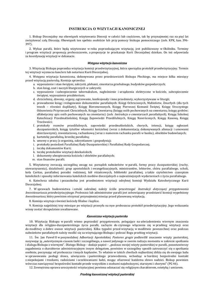 INSTRUKCJA O WIZYTACJI KANONICZNEJ 1. Biskup Diecezjalny ma obowiązek wizytowania Diecezji w całości lub częściowo, tak by przynajmniej raz na pięć lat zwizytować całą Diecezję. Obowiązek ten spełnia osobiście lub przy pomocy biskupa pomocniczego (zob. KPK, kan. 396397). 2. Wykaz parafii, które będą wizytowane w roku poprzedzającym wizytację, jest publikowany w Okólniku. Terminy i program wizytacji proponują proboszczowie, a propozycje te przekazuje Kurii Diecezjalnej dziekan. On też odpowiada za koordynację wizytacji w dekanacie. Wstępna wizytacja kanoniczna 3. Wizytację Biskupa poprzedza wizytacja komisji przedwizytacyjnej, która sporządza protokół przedwizytacyjny. Termin tej wizytacji wyznacza kanclerz lub notariusz Kurii Diecezjalnej. 4. Wstępna wizytacja kanoniczna, dokonywana przez przedstawicieli Biskupa Płockiego, ma miejsce kilka miesięcy przed wizytacją pasterską. Komisja sprawdza: a. wyposażenie i stan świątyni, zakrystii, plebanii, cmentarza grzebalnego, budynków gospodarczych; b. stan ksiąg, szat i naczyń liturgicznych w zakrystii; c. wyposażenie i zabezpieczenie tabernakulum, nagłośnienie i urządzenia elektryczne w kościele, zabezpieczenie świątyni, wyposażenie prezbiterium; d. chrzcielnicę, dzwony, organy, ogrzewanie, konfesjonały i inne przedmioty, wykorzystywane w liturgii; e. prowadzenie ksiąg i redagowanie dokumentów parafialnych: Księgi Ochrzczonych, Małżeństw, Zmarłych (dla tych trzech – również duplikaty), Księgę Bierzmowanych, Księgę Pierwszej Komunii Świętej, Księgę Uroczystego Odnowienia Przyrzeczeń Chrzcielnych, Księgę Cmentarną (księgę osób pochowanych na cmentarzu; księgę grobów; alfabetyczny spis osób pochowanych na cmentarzu) (zob. Instrukcja o cmentarzach parafialnych), Księgę Szkolnej Katechizacji Przedmałżeńskiej, Księgę Zapowiedzi Przedślubnych, Księgę Nawróconych, Księgę Kasową, Księgę Trzeźwości; f. protokoły rozmów przedślubnych, zapowiedzi przedmałżeńskich, chorych, intencji, księgę ogłoszeń duszpasterskich, księgę tytułów własności kościelnej (wraz z dokumentacją dokonywanych alienacji i umowami dzierżawnymi), inwentarzową, rachunkową (wraz z numerem rachunku parafii w banku), obiektów budowlanych; g. kartotekę parafialną, kronikę parafialną; h. umowy o pracę (z organistą, zakrystianem i gospodynią); i. protokoły posiedzeń Parafialnej Rady Duszpasterskiej i Parafialnej Rady Gospodarczej; j. teczkę dokumentów Kurii; k. teczkę protokołów wizytacji dziekańskich; l. dokumenty ubezpieczenia kościoła i obiektów parafialnych; m. stan finansów parafii. 5. Wizytatorzy zwracają szczególną uwagę na: porządek nabożeństw w parafii, formy pracy duszpasterskiej (ruchy, stowarzyszenia), działalność: grup apostolskich i ewangelizacyjnych, ministrantów, lektorów, chóru parafialnego, scholi, koła Caritas, parafialnej poradni rodzinnej, kół różańcowych, biblioteki parafialnej, a także czytelnictwo czasopism katolickich i sposoby informowania katolickich mediów diecezjalnych o najważniejszych wydarzeniach z życia parafialnego. 6. Katecheza szkolna i pozaszkolna jest przedmiotem wizytacji odrębnej komisji Wydziału Katechetycznego Kurii Diecezjalnej. 7. W sprawach budownictwa i sztuki sakralnej należy ściśle przestrzegać Instrukcji dotyczącej przygotowania kwestionariusza przedwizytacyjnego. Proboszcz lub administrator parafii jest zobowiązany przedstawić komisji wypełniony kwestionariusz, który powinien otrzymać przynajmniej miesiąc przed planowaną wizytacją. 8. Komisja wizytuje również kościoły filialne i kaplice. 9. Komisja najpóźniej trzy miesiące po wizytacji przesyła na ręce proboszcza protokół przedwizytacyjny. Jego wskazania winny zostać skrupulatnie zrealizowane. Kanoniczna wizytacja pasterska 10. Wizytację Biskupa w parafii winno poprzedzić przygotowanie, polegające na uświadomieniu wiernym znaczenia wizytacji dla religijno-duszpasterskiego życia parafii, zachęcie do czynnego włączenia się w przebieg wizytacji oraz do modlitwy o dobre owoce wizytacji pasterskiej. Kilka tygodni przed wizytacją w modlitwie powszechnej oraz podczas nabożeństw parafialnych należy modlić się za wizytującego Biskupa i polecać Bogu przebieg wizytacji. 11. Św. Jan Paweł II w posynodalnej Adhortacji Apostolskiej Pastores gregis podkreślił znaczenie wizyty pasterskiej, nazywając ją „autentycznym czasem łaski i szczególnego, a nawet jedynego w swoim rodzaju momentu w zakresie spotkania i dialogu Biskupa z wiernymi”. Dlatego Biskup – dodaje papież – „podczas swojej wizyty pasterskiej w parafii, pozostawiwszy zagadnienia o charakterze administracyjnym innym delegatom, powinien w szczególny sposób zatroszczyć się o spotkania osobiste, poczynając od proboszcza i innych kapłanów. To właśnie w takich chwilach najbardziej zbliża się do swojego ludu w sprawowaniu posługi słowa, uświęcania i pasterskiego przewodzenia, wchodząc w bardziej bezpośredni kontakt z niepokojami i troskami, radościami i oczekiwaniami ludzi, mogąc ofiarować każdemu słowo nadziei. Biskup powinien wówczas nawiązywać bezpośredni kontakt przede wszystkim z osobami najuboższymi, starszymi i chorymi” (PG 46). 12. Zewnętrzna oprawa uroczystości wizytacyjnej powinna odznaczać się religijnym charakterem, estetyką i umiarem. Przebieg kanonicznej wizytacji pasterskiej 13. Na przebieg kanonicznej wizytacji pasterskiej składają się następujące punkty: a. sprawozdanie duszpastersko-gospodarcze księdza proboszcza; b. spotkanie z rodzicami kapłanów oraz sióstr i braci zakonnych, pochodzących z parafii; c. spotkanie z katechetami, nauczycielami i uczniami przynajmniej jednej szkoły w parafii; d. spotkanie z chorymi; e. spotkanie z grupami parafialnymi; f. rozmowa z duszpasterzami parafialnymi; g. rozmowa z proboszczem na temat uwag, zawartych w protokołach przedwizytacyjnyc