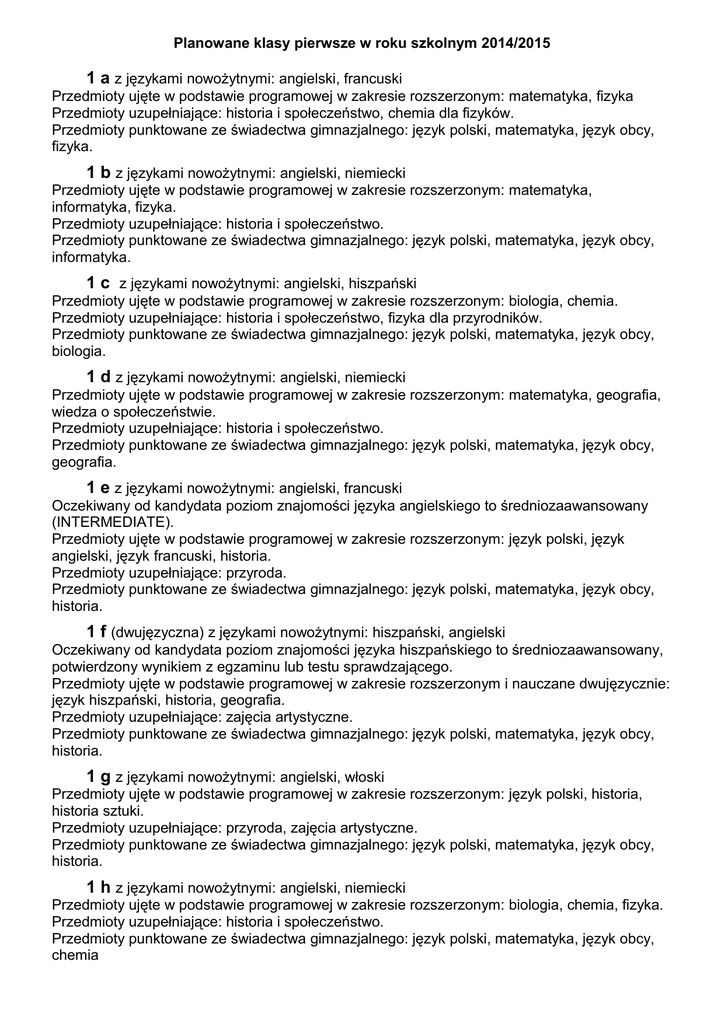 Planowane klasy pierwsze w roku szkolnym 2014/2015 1 a z językami nowożytnymi: angielski, francuski Przedmioty ujęte w podstawie programowej w zakresie rozszerzonym: matematyka, fizyka Przedmioty uzupełniające: historia i społeczeństwo, chemia dla fizyków. Przedmioty punktowane ze świadectwa gimnazjalnego: język polski, matematyka, język obcy, fizyka. 1 b z językami nowożytnymi: angielski, niemiecki Przedmioty ujęte w podstawie programowej w zakresie rozszerzonym: matematyka, informatyka, fizyka. Przedmioty uzupełniające: historia i społeczeństwo. Przedmioty punktowane ze świadectwa gimnazjalnego: język polski, matematyka, język obcy, informatyka. 1 c z językami nowożytnymi: angielski, hiszpański Przedmioty ujęte w podstawie programowej w zakresie rozszerzonym: biologia, chemia. Przedmioty uzupełniające: historia i społeczeństwo, fizyka dla przyrodników. Przedmioty punktowane ze świadectwa gimnazjalnego: język polski, matematyka, język obcy, biologia. 1 d z językami nowożytnymi: angielski, niemiecki Przedmioty ujęte w podstawie programowej w zakresie rozszerzonym: matematyka, geografia, wiedza o społeczeństwie. Przedmioty uzupełniające: historia i społeczeństwo. Przedmioty punktowane ze świadectwa gimnazjalnego: język polski, matematyka, język obcy, geografia. 1 e z językami nowożytnymi: angielski, francuski Oczekiwany od kandydata poziom znajomości języka angielskiego to średniozaawansowany (INTERMEDIATE). Przedmioty ujęte w podstawie programowej w zakresie rozszerzonym: język polski, język angielski, język francuski, historia. Przedmioty uzupełniające: przyroda. Przedmioty punktowane ze świadectwa gimnazjalnego: język polski, matematyka, język obcy, historia. 1 f (dwujęzyczna) z językami nowożytnymi: hiszpański, angielski Oczekiwany od kandydata poziom znajomości języka hiszpańskiego to średniozaawansowany, potwierdzony wynikiem z egzaminu lub testu sprawdzającego. Przedmioty ujęte w podstawie programowej w zakresie rozszerzonym i nauczane dwujęzycznie: język hiszpański, historia, geografia. Przedmioty uzupełniające: zajęcia artystyczne. Przedmioty punktowane ze świadectwa gimnazjalnego: język polski, matematyka, język obcy, historia. 1 g z językami nowożytnymi: angielski, włoski Przedmioty ujęte w podstawie programowej w zakresie rozszerzonym: język polski, historia, historia sztuki. Przedmioty uzupełniające: przyroda, zajęcia artystyczne. Przedmioty punktowane ze świadectwa gimnazjalnego: język polski, matematyka, język obcy, historia. 1 h z językami nowożytnymi: angielski, niemiecki Przedmioty ujęte w podstawie programowej w zakresie rozszerzonym: biologia, chemia, fizyka. Przedmioty uzupełniające: historia i społeczeństwo. Przedmioty punktowane ze świadectwa gimnazjalnego: język polski, matematyka, język obcy, chemia