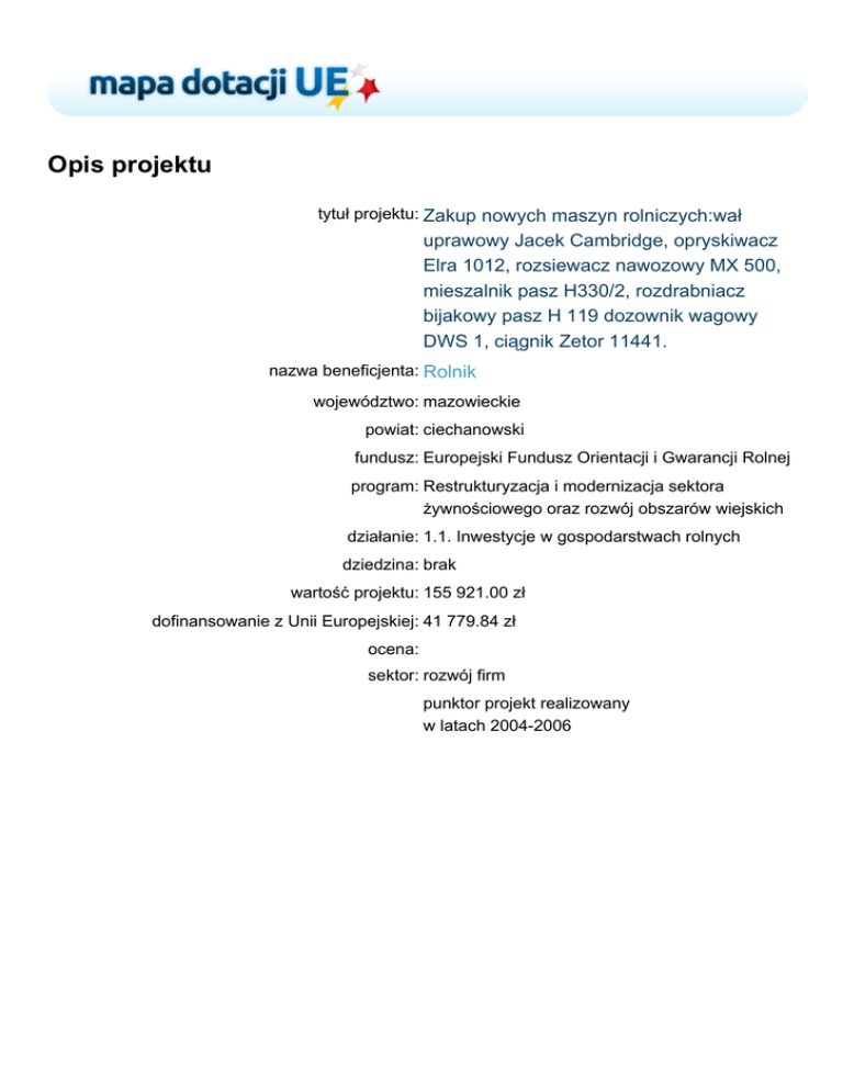 Opis projektu tytuł projektu: Zakup nowych maszyn rolniczych:wał uprawowy Jacek Cambridge, opryskiwacz Elra 1012, rozsiewacz nawozowy MX 500, mieszalnik pasz H330/2, rozdrabniacz bijakowy pasz H 119 dozownik wagowy DWS 1, ciągnik Zetor 11441. nazwa beneficjenta: Rolnik województwo: mazowieckie powiat: ciechanowski fundusz: Europejski Fundusz Orientacji i Gwarancji Rolnej program: Restrukturyzacja i modernizacja sektora żywnościowego oraz rozwój obszarów wiejskich działanie: 1.1. Inwestycje w gospodarstwach rolnych dziedzina: brak wartość projektu: 155 921.00 zł dofinansowanie z Unii Europejskiej: 41 779.84 zł ocena: sektor: rozwój firm punktor projekt realizowany w latach 2004-2006