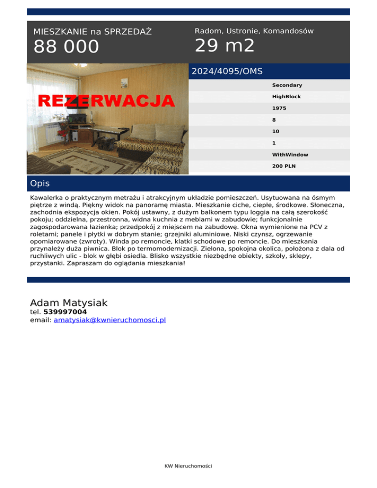Radom, Ustronie, Komandosów MIESZKANIE na SPRZEDAŻ 29 m2 88 000 2024/4095/OMS Secondary HighBlock 1975 8 10 1 WithWindow 200 PLN Opis Kawalerka o praktycznym metrażu i atrakcyjnym układzie pomieszczeń. Usytuowana na ósmym piętrze z windą. Piękny widok na panoramę miasta. Mieszkanie ciche, ciepłe, środkowe. Słoneczna, zachodnia ekspozycja okien. Pokój ustawny, z dużym balkonem typu loggia na całą szerokość pokoju; oddzielna, przestronna, widna kuchnia z meblami w zabudowie; funkcjonalnie zagospodarowana łazienka; przedpokój z miejscem na zabudowę. Okna wymienione na PCV z roletami; panele i płytki w dobrym stanie; grzejniki aluminiowe. Niski czynsz, ogrzewanie opomiarowane (zwroty). Winda po remoncie, klatki schodowe po remoncie. Do mieszkania przynależy duża piwnica. Blok po termomodernizacji. Zielona, spokojna okolica, położona z dala od ruchliwych ulic - blok w głębi osiedla. Blisko wszystkie niezbędne obiekty, szkoły, sklepy, przystanki. Zapraszam do oglądania mieszkania! Adam Matysiak tel. 539997004 email: [email protected] KW Nieruchomości Powered by TCPDF (www.tcpdf.org)