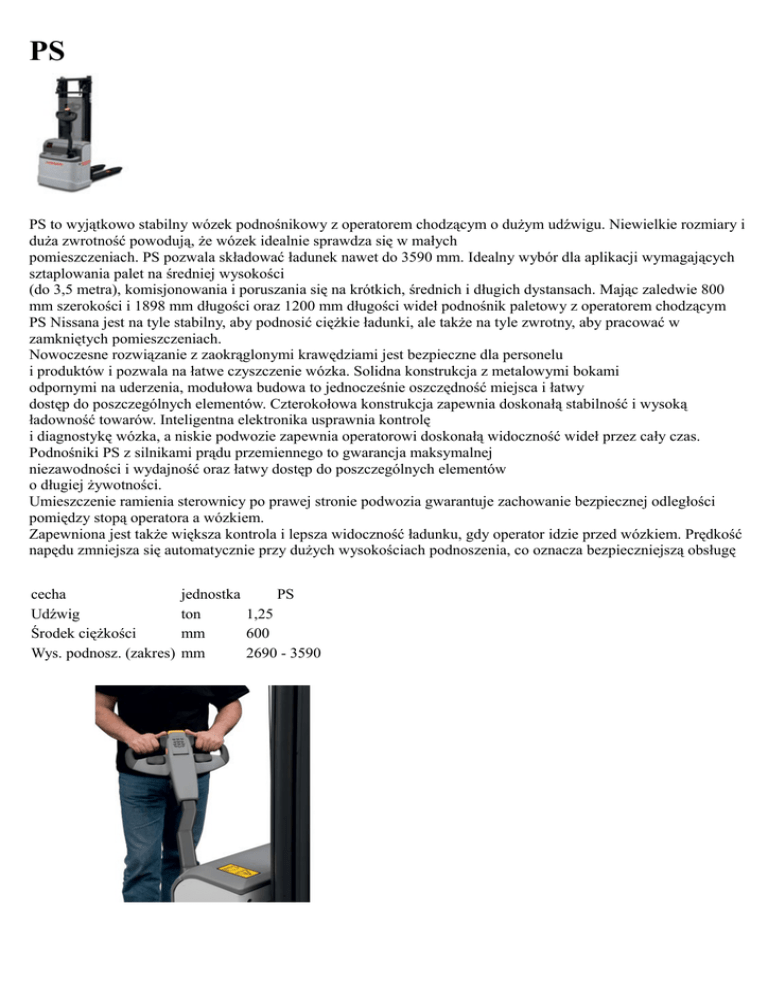 PS PS to wyjątkowo stabilny wózek podnośnikowy z operatorem chodzącym o dużym udźwigu. Niewielkie rozmiary i duża zwrotność powodują, że wózek idealnie sprawdza się w małych pomieszczeniach. PS pozwala składować ładunek nawet do 3590 mm. Idealny wybór dla aplikacji wymagających sztaplowania palet na średniej wysokości (do 3,5 metra), komisjonowania i poruszania się na krótkich, średnich i długich dystansach. Mając zaledwie 800 mm szerokości i 1898 mm długości oraz 1200 mm długości wideł podnośnik paletowy z operatorem chodzącym PS Nissana jest na tyle stabilny, aby podnosić ciężkie ładunki, ale także na tyle zwrotny, aby pracować w zamkniętych pomieszczeniach. Nowoczesne rozwiązanie z zaokrąglonymi krawędziami jest bezpieczne dla personelu i produktów i pozwala na łatwe czyszczenie wózka. Solidna konstrukcja z metalowymi bokami odpornymi na uderzenia, modułowa budowa to jednocześnie oszczędność miejsca i łatwy dostęp do poszczególnych elementów. Czterokołowa konstrukcja zapewnia doskonałą stabilność i wysoką ładowność towarów. Inteligentna elektronika usprawnia kontrolę i diagnostykę wózka, a niskie podwozie zapewnia operatorowi doskonałą widoczność wideł przez cały czas. Podnośniki PS z silnikami prądu przemiennego to gwarancja maksymalnej niezawodności i wydajność oraz łatwy dostęp do poszczególnych elementów o długiej żywotności. Umieszczenie ramienia sterownicy po prawej stronie podwozia gwarantuje zachowanie bezpiecznej odległości pomiędzy stopą operatora a wózkiem. Zapewniona jest także większa kontrola i lepsza widoczność ładunku, gdy operator idzie przed wózkiem. Prędkość napędu zmniejsza się automatycznie przy dużych wysokościach podnoszenia, co oznacza bezpieczniejszą obsługę cecha Udźwig Środek ciężkości Wys. podnosz. (zakres) jednostka PS ton 1,25 mm 600 mm 2690 - 3590