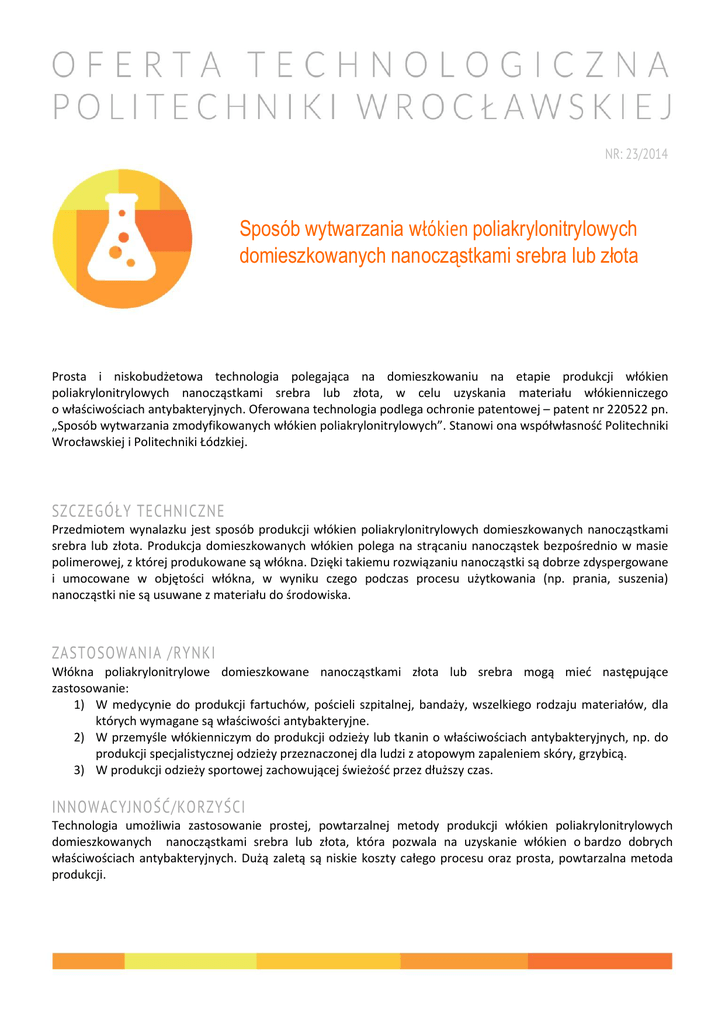 NR: 23/2014 Sposób wytwarzania włókien poliakrylonitrylowych domieszkowanych nanocząstkami srebra lub złota Prosta i niskobudżetowa technologia polegająca na domieszkowaniu na etapie produkcji włókien poliakrylonitrylowych nanocząstkami srebra lub złota, w celu uzyskania materiału włókienniczego o właściwościach antybakteryjnych. Oferowana technologia podlega ochronie patentowej – patent nr 220522 pn. „Sposób wytwarzania zmodyfikowanych włókien poliakrylonitrylowych”. Stanowi ona współwłasność Politechniki Wrocławskiej i Politechniki Łódzkiej. SZCZEGÓŁY TECHNICZNE Przedmiotem wynalazku jest sposób produkcji włókien poliakrylonitrylowych domieszkowanych nanocząstkami srebra lub złota. Produkcja domieszkowanych włókien polega na strącaniu nanocząstek bezpośrednio w masie polimerowej, z której produkowane są włókna. Dzięki takiemu rozwiązaniu nanocząstki są dobrze zdyspergowane i umocowane w objętości włókna, w wyniku czego podczas procesu użytkowania (np. prania, suszenia) nanocząstki nie są usuwane z materiału do środowiska. ZASTOSOWANIA /RYNKI Włókna poliakrylonitrylowe domieszkowane nanocząstkami złota lub srebra mogą mieć następujące zastosowanie: 1) W medycynie do produkcji fartuchów, pościeli szpitalnej, bandaży, wszelkiego rodzaju materiałów, dla których wymagane są właściwości antybakteryjne. 2) W przemyśle włókienniczym do produkcji odzieży lub tkanin o właściwościach antybakteryjnych, np. do produkcji specjalistycznej odzieży przeznaczonej dla ludzi z atopowym zapaleniem skóry, grzybicą. 3) W produkcji odzieży sportowej zachowującej świeżość przez dłuższy czas. INNOWACYJNOŚĆ/KORZYŚCI Technologia umożliwia zastosowanie prostej, powtarzalnej metody produkcji włókien poliakrylonitrylowych domieszkowanych nanocząstkami srebra lub złota, która pozwala na uzyskanie włókien o bardzo dobrych właściwościach antybakteryjnych. Dużą zaletą są niskie koszty całego procesu oraz prosta, powtarzalna metoda produkcji. STATUS IP FORMA KOMERCJALIZACJI POZIOM GOTOWOŚCI WDROŻENIOWEJ ☒ Zgłoszenie patentowe ☒ Sprzedaż patentu ☒ Koncepcja i model teoretyczny ☐ Patent ☒ Umowa wdrożeniowa ☒ Eksperymentalna walidacja koncepcji ☐ Know-how ☒ Udzielenie licencji ☒ Wstępna technologia / demonstrator ☐ Inne ☐ Spin off ☒ Testy w warunkach laboratoryjnych ☐ Inna umowa ☐ Testy w warunkach rzeczywistych ☐ Finalna technologia / prototyp ☐ Technologia zweryfikowana w warunkach operacyjnych Agnieszka Turyńska Wrocławskie Centrum Transferu Technologii tel.: 71 320 41 87 / [email protected] ul. Smoluchowskiego 48 / 50-372 Wrocław