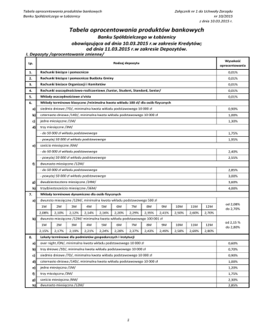 Tabela oprocentowania produktów bankowych Banku Spółdzielczego w Łobżenicy Załącznik nr 1 do Uchwały Zarządu nr 10/2015 z dnia 10.03.2015 r. Tabela oprocentowania produktów bankowych Banku Spółdzielczego w Łobżenicy obowiązująca od dnia 10.03.2015 r.w zakresie Kredytów; od dnia 11.03.2015 r.w zakresie Depozytów. I. Depozyty /oprocentowanie zmienne/ Wysokośd oprocentowania Rodzaj depozytu Lp. 1. Rachunki bieżące i pomocnicze 0,01% 2. Rachunki bieżące i pomocnicze Budżetu Gminy 0,01% 3. Rachunki bieżace Organizacji i Komitetów 0,01% 4. Rachunki oszczędnościowo-rozliczeniowe /Junior, Student, Standard, Senior/ 0,01% 5. Wkłady oszczędnościowe a'vista 0,01% 6. Wkłady terminowe klasyczne /minimalna kwota wkładu 100 zł/ dla osób fizycznych a) siedmio dniowe /7D/, minimalna kwota wkładu podstawowego 10 000 zł 0,90% b) czternasto dniowa /14D/, minimalna kwota wkładu podstawowego 10 000 zł 1,00% c) jedno miesięczne /1M/ 1,30% d) trzy miesięczne /3M/ e) f) - do 50 000 zł wkładu podstawowego 1,75% - powyżej 50 000 zł wkładu podstawowego 1,95% sześcio miesięczne /6M/ - do 50 000 zł wkładu podstawowego 2,40% - powyżej 50 000 zł wkładu podstawowego 2,55% dwunasto miesięczne /12M/ - do 50 000 zł wkładu podstawowego 2,85% - powyżej 50 000 zł wkładu podstawowego 3,00% g) dwudziestocztero miesięczne /24M/ 3,60% h) trzydziestosześcio miesięczne /36M/ 4,00% Wkłady terminowe dynamiczne dla osób fizycznych 7. a) b) dwunsto miesięczne /12M/, minimalna kwota wkładu podstawowego 500 zł 1M 2M 3M 4M 5M 6M 7M 8M 9M 10M 11M 12M 2,08% 2,10% 2,12% 2,14% 2,16% 2,20% 2,29% 2,35% 2,41% 2,50% 2,60% 2,70% od 2,08% do 2,70% dwunsto miesięczne /12M/ minimalna kwota wkładu podstawowego 100 001 zł 1M 2M 3M 4M 5M 6M 7M 8M 9M 10M 11M 12M 2,15% 2,17% 2,19% 2,21% 2,24% 2,28% 2,37% 2,43% 2,49% 2,58% 2,69% 2,80% od 2,15 % do 2,80% Lokaty terminowe dla podmiotów gospodarczych i instytucji 8. a) over night /ON/, minimalna kwota wkładu podstawowego 10 000 zł 0,60% b) trzy dniowe /3D/, minimalna kwota wkładu podstawowego 10 000 zł 0,70% c) siedmio dniowe /7D/, minimalna kwota wkładu podstawowego 10 000 zł 0,90% d) czternasto dniowa /14D/, minimalna kwota wkładu podstawowego 10 000 zł 1,00% e) jedno miesięczna /1M/ 1,20% f) trzy miesięczna /3M/ 1,75% g) sześcio miesięczna /6M/ 2,30% h) dwunasto miesięczna /12M/ 2,85% 1 Tabela oprocentowania produktów bankowych Banku Spółdzielczego w Łobżenicy II. Kredyty dla rolników /oprocentowanie zmienne/ Lp. Rodzaj kredytu Wysokośd oprocentowania Kredyt obrotowy w rachunku kredytowym 1. - do 3 miesięcy 8,00% - do 6 miesięcy 8,40% - do 12 miesięcy 8,80% - powyżej 12 miesięcy 9,00% - na zakup środków do produkcji rolnej "nawozowy" 7,50% Pożyczka 2. 3. - do 3 miesięcy 9,39% - do 6 miesięcy 9,59% - do 12 miesięcy 9,79% - powyżej 12 miesięcy 9,99% Kredyt w rachunku oszczędnościowo-rozliczeniowym 9,00% Kredytowa linia hipoteczna 4. - do 5 lat 9,59% - powyżej 5 lat do 10 lat 9,79% Kredyt inwestycyjny - inwestycyjny do 5 lat /udzielony do 29.04.2012 r./ 6,60% - inwestycyjny powyżej 5 lat do 10 lat /udzielony do 29.04.2012 r./ 6,80% - do 5 lat /AGRO INWESTYCJA/ 6,60% - powyżej 5 lat do 15 lat /AGRO INWESTYCJA/ 6,80% - pomostowy /na realizację programów w ramach funduszy strukturalnych/ 6,80% - inwestycyjny na zakup ziemi do 20% wkładu własnego 5,60% - inwestycyjny na zakup ziemi powyżej 20% wkładu własnego 5,50% 6. Konwersja 10,00% 7. Zaległości 10% ( 4 stopa lombardowa) 5. 2 Tabela oprocentowania produktów bankowych Banku Spółdzielczego w Łobżenicy III. Kredyty dla osób fizycznych /oprocentowanie zmienne/ Lp. Rodzaj kredytu Wysokośd oprocentowania Kredyt gotówkowy 1. 2. - do 3 miesięcy 9,39% - do 6 miesięcy 9,59% - do 12 miesięcy 9,79% - powyżej 12 miesięcy 9,99% Kredyt w rachunku oszczędnościowo-rozliczeniowym 9,00% Kredyt mieszkaniowy 3. - do 5 lat 6,00% - powyżej 5 lat do 20 lat 6,40% Pożyczka hipoteczna 4. - do 5 lat 9,59% - powyżej 5 lat do 10 lat 9,79% 5. Kredyt na zakup kolektorów słonecznych z dopłatą NFOŚiGW 8,00% 6. Kredyt konsolidacyjny 10,00% 7. Zaległości 10%( 4 X stopa lombardowa) 3 Tabela oprocentowania produktów bankowych Banku Spółdzielczego w Łobżenicy IV. Kredyty dla przedsiębiorców /oprocentowanie zmienne/ Lp. Rodzaj kredytu Wysokośd oprocentowania Kredyt obrotowy 1. 2. - do 3 miesięcy 8,00% - do 6 miesięcy 8,40% - do 12 miesięcy 8,80% - powyżej 12 miesięcy 9,00% od 7,00% do 9,00% Kredyt w rachunku bieżącym Kredytowa linia hipoteczna 3. - do 5 lat 9,59% - powyżej 5 lat do 10 lat 9,79% Kredyt inwetycyjny 4. 6. - do 5 lat 6,60% - powyżej 5 lat do 10 lat 6,80% 10% (4 X stopa lombardowa) Zaległości 4