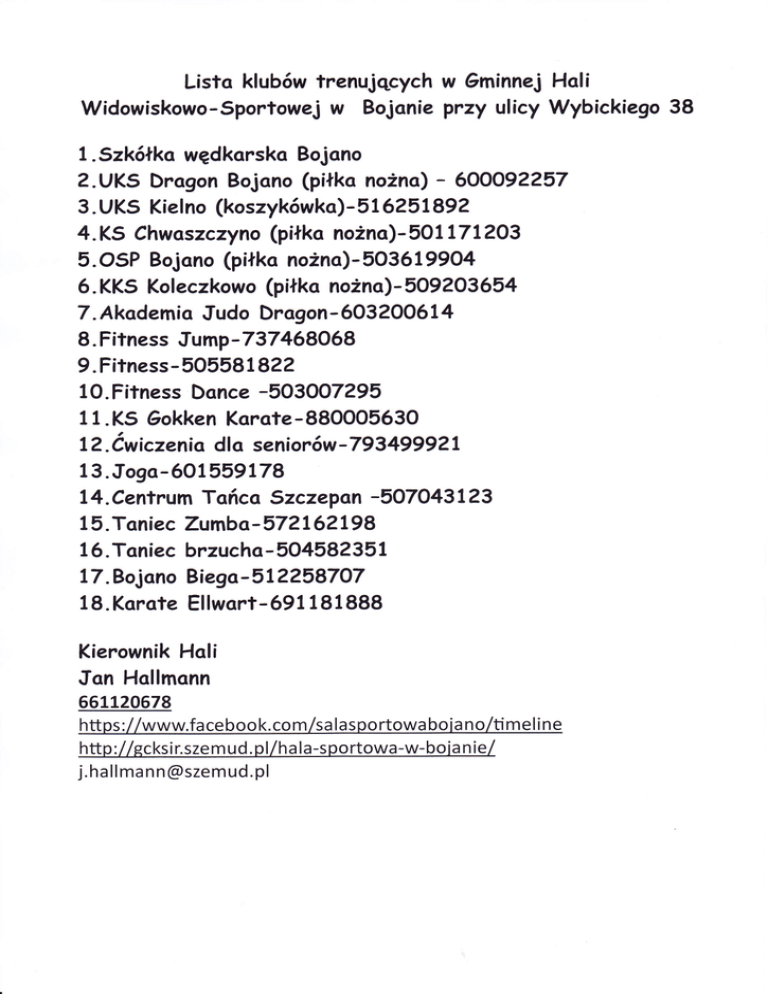 Lista klubów trenujQcych w Ominnej Ha|i Widowiskowo-Sportowej w Bojonie p?zy ulicy Wybickiego 38 t .Szkółko wędkorsko Bojano ?.VKS Drogon Bojono (piłko nożno) - 60009??57 UKS Kielno (koszykówko)- 516?5189? 4.KS Chwaszczyno (piłko nożno)-501 I7I?O3 3. 5.0SP Bojono (piłko nożno)-5O36I99O4 KKS Koleczkowo (piłko nożno)-509203 654 7.Akademio Judo Drogon -603200614 8. Fitness Jum p -737 4ó80ó8 9.Fitness-5055818?2 10.Fitness Donce -503007?95 1 1.KS Gokken Karote-880005ó30 t? .ćwiczenia dla sen iorów -7934999?I 13.Jogo-ó01559178 t4.Centrum Tońco Szczepan -507043 I23 1 5 Tan iec Zumbo - 57?I 621 98 1 ó. Toniec brzucho - 50458235I 1 7. Bojono Biega-5I??587O7 1 8. Korote Ellwort- 6911 81 888 ó. . Kierownik Ha!i Jon Ho|lmann 66LL20678 https : //www.fa ce b oo k. co m /sa l as po rtowa bo i a n o /ti m e http://gcksir.szem ud. pl/ha la-sportowa-w-boia nie / [email protected] li n e